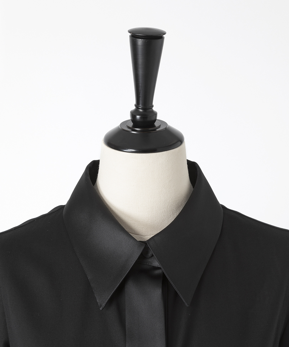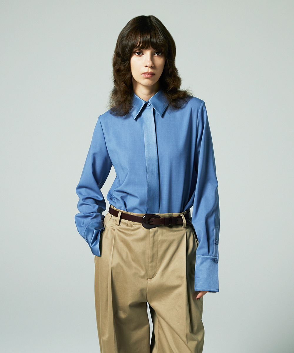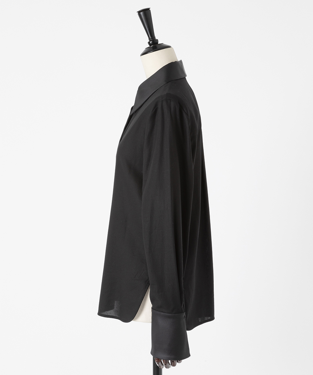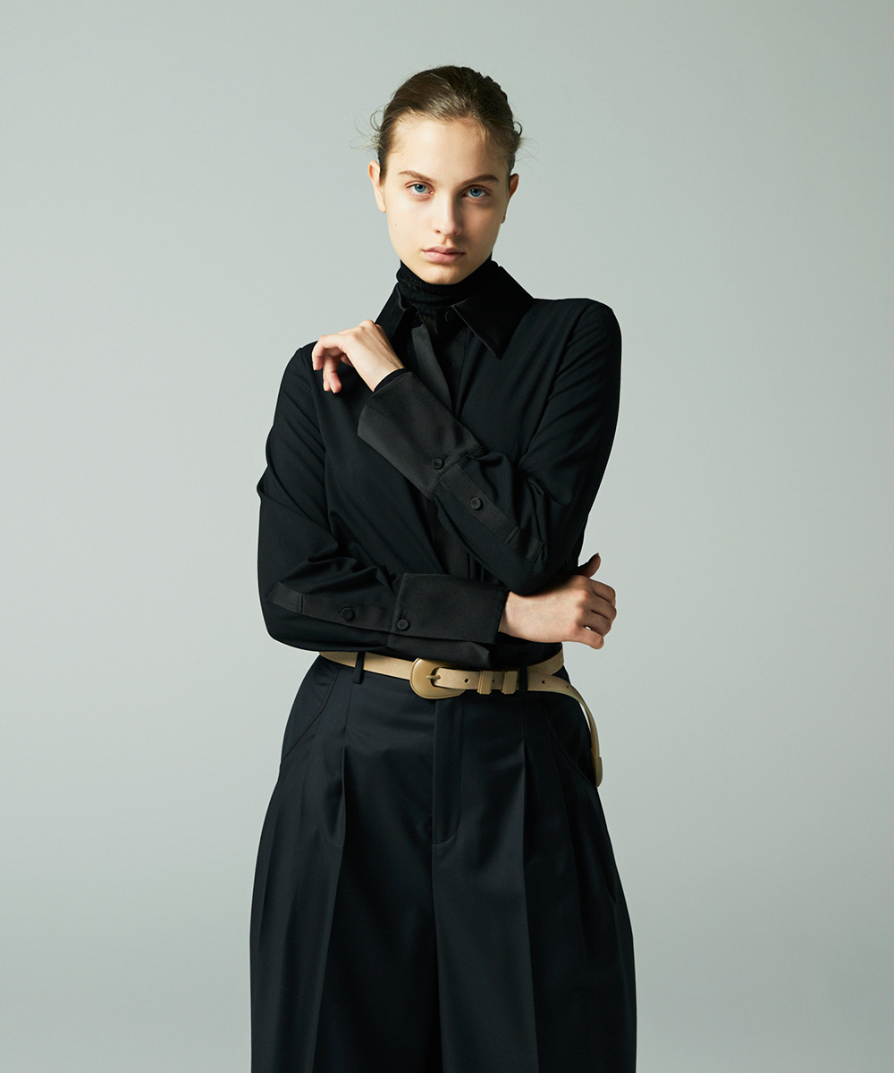 衿やカフス、前立てなどを身頃と同色のシルクコットンサテン生地で切り替え、ポイントにしたデザインシャツ。程よく体に寄り添うシルエットでジャケットインなどにも合わせやすく仕上げています。身頃はたて糸、緯糸ともにスーパー120の強撚糸を使用したウールボイル。軽くさらりとしたタッチで肌心地良い素材感です。特殊な加工により、ナチュラルなストレッチ感や防シワ性があり、ウール本来ソフトな風合いを持ち合いを楽しめます。日本製生地。