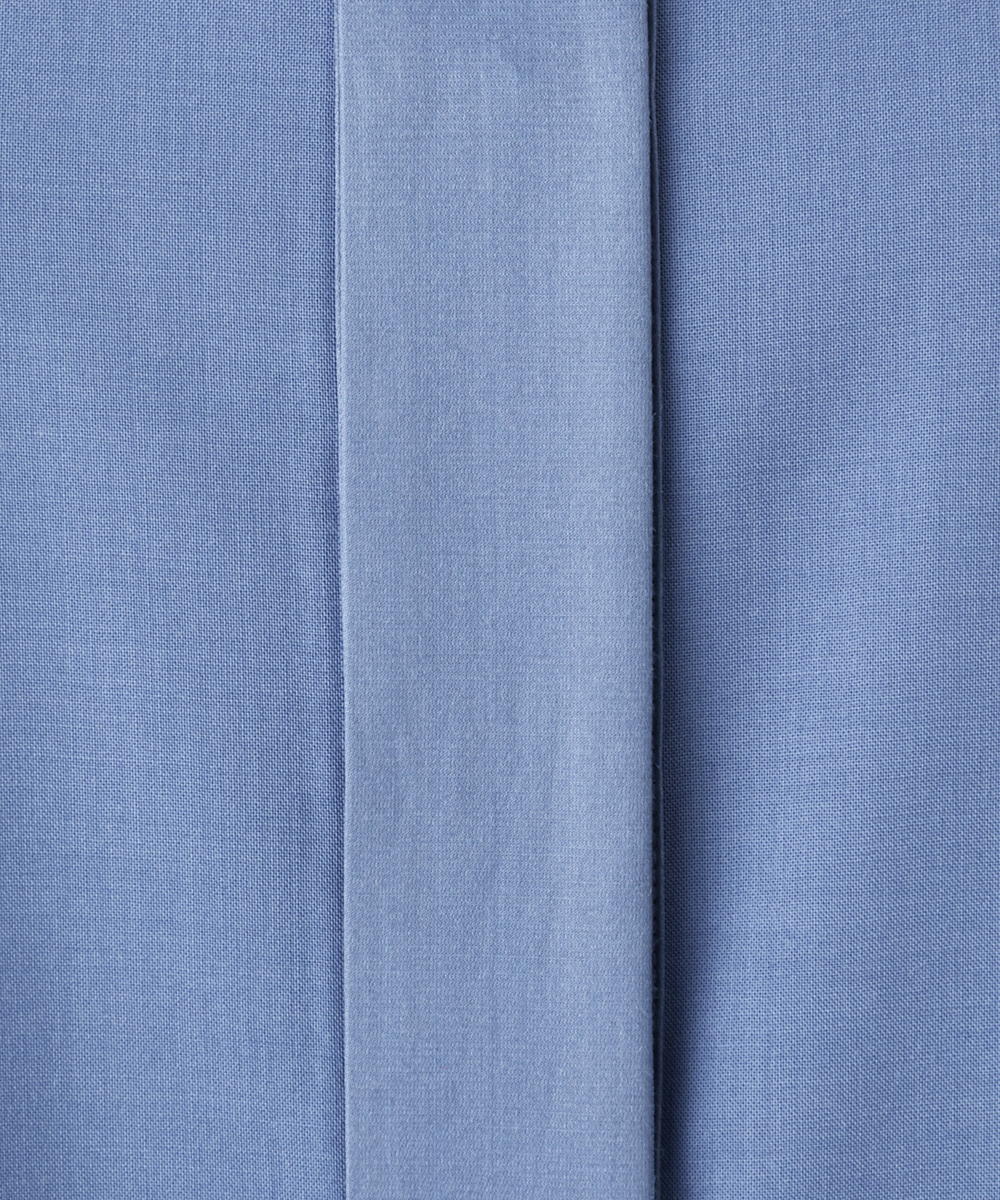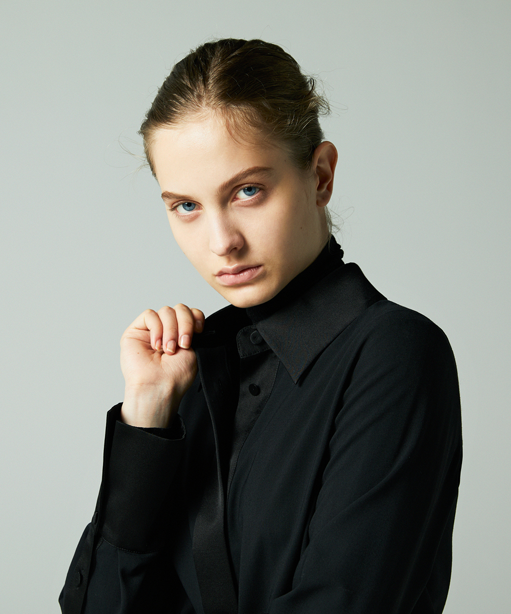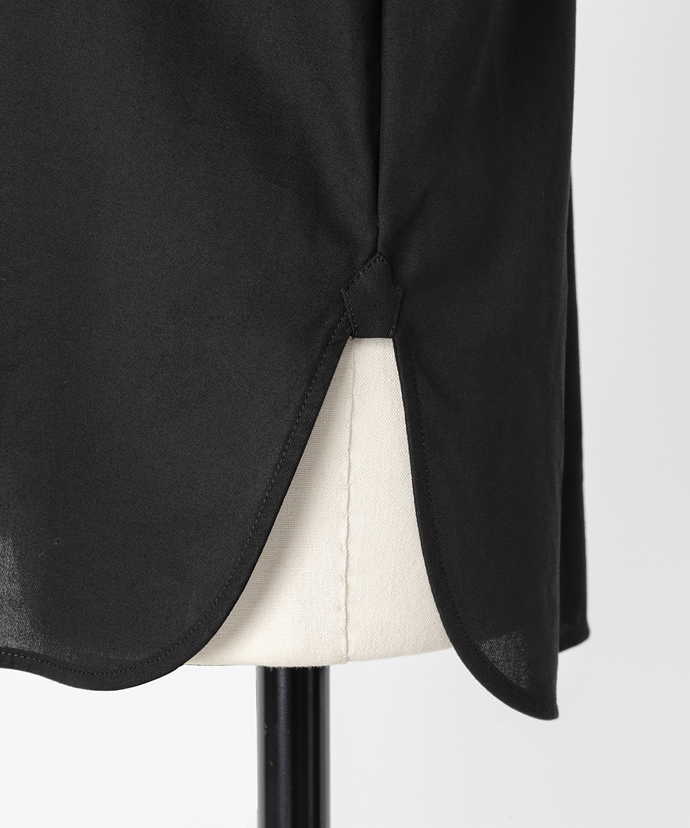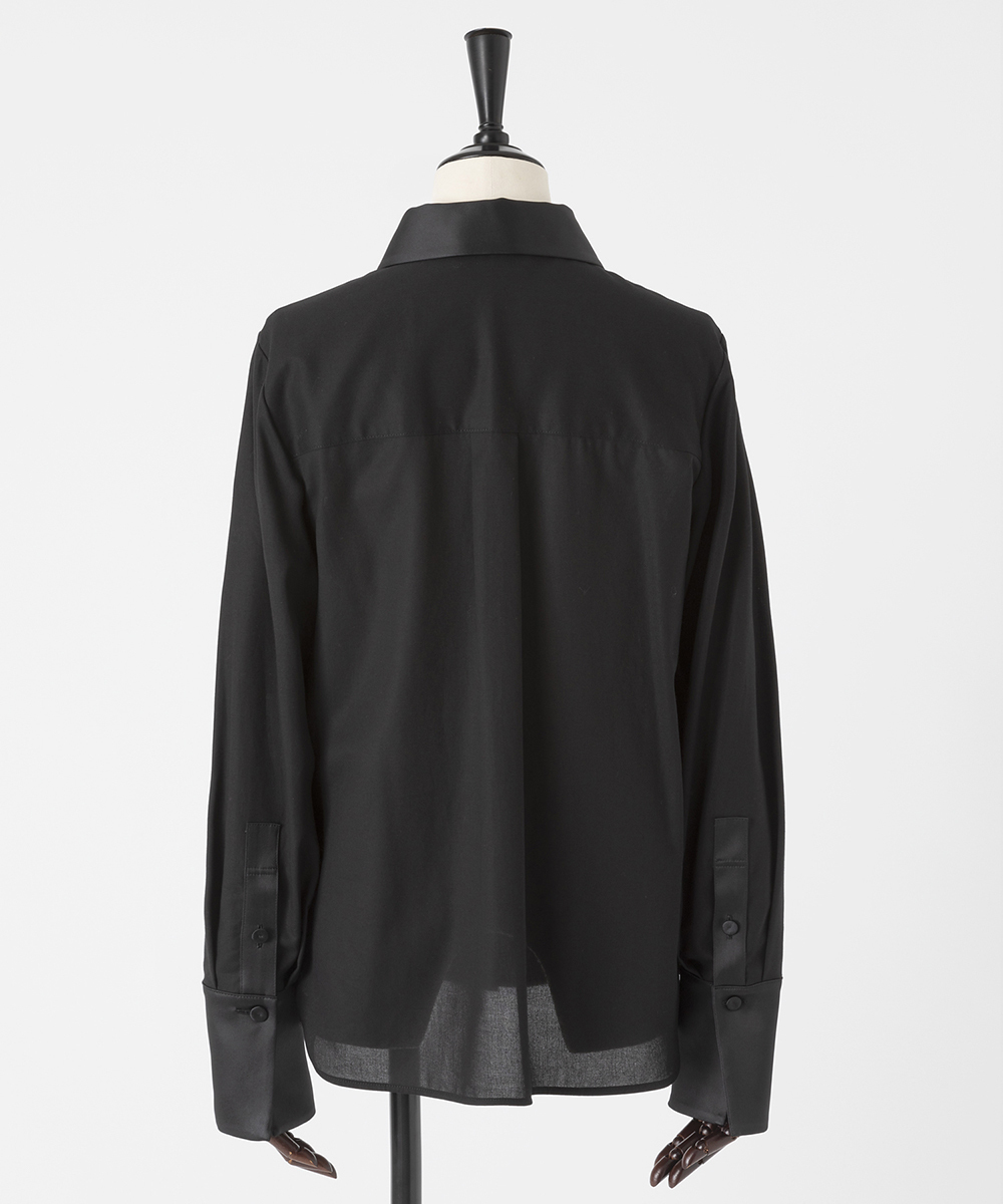 衿やカフス、前立てなどを身頃と同色のシルクコットンサテン生地で切り替え、ポイントにしたデザインシャツ。程よく体に寄り添うシルエットでジャケットインなどにも合わせやすく仕上げています。身頃はたて糸、緯糸ともにスーパー120の強撚糸を使用したウールボイル。軽くさらりとしたタッチで肌心地良い素材感です。特殊な加工により、ナチュラルなストレッチ感や防シワ性があり、ウール本来ソフトな風合いを持ち合いを楽しめます。日本製生地。