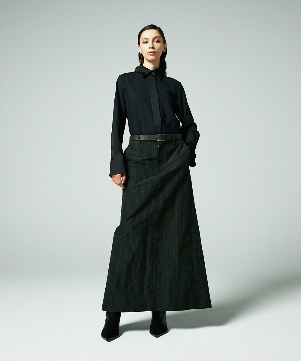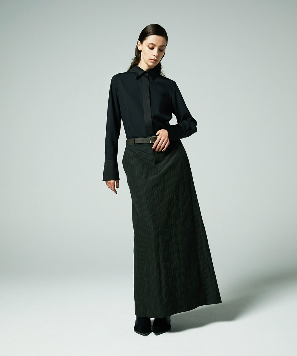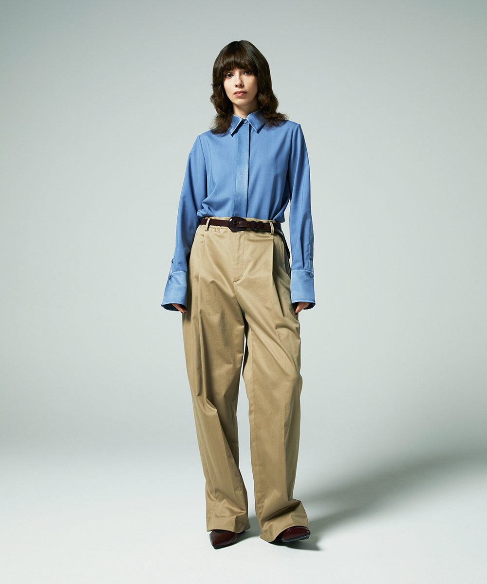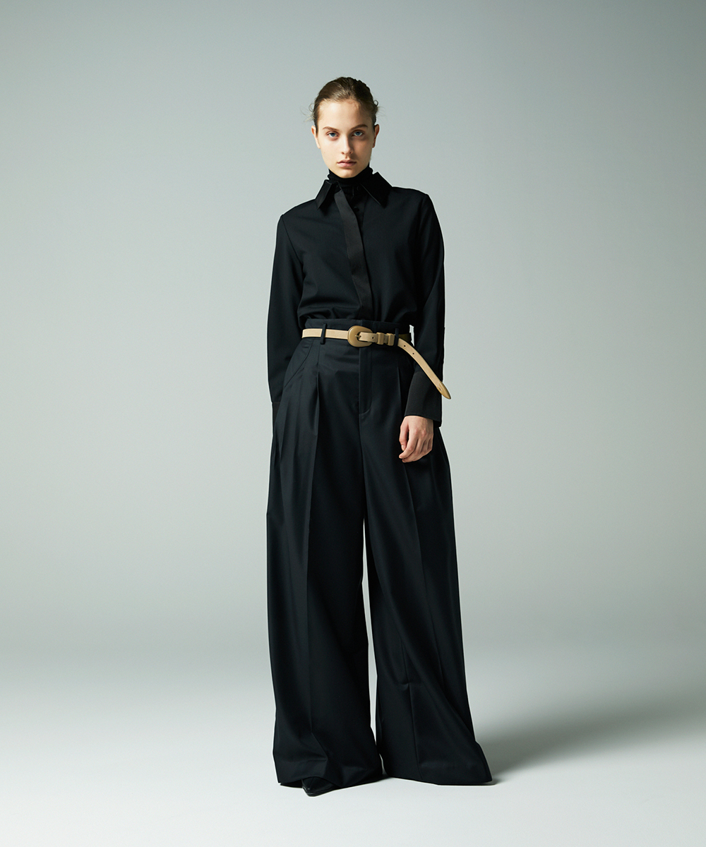 衿やカフス、前立てなどを身頃と同色のシルクコットンサテン生地で切り替え、ポイントにしたデザインシャツ。程よく体に寄り添うシルエットでジャケットインなどにも合わせやすく仕上げています。身頃はたて糸、緯糸ともにスーパー120の強撚糸を使用したウールボイル。軽くさらりとしたタッチで肌心地良い素材感です。特殊な加工により、ナチュラルなストレッチ感や防シワ性があり、ウール本来ソフトな風合いを持ち合いを楽しめます。日本製生地。