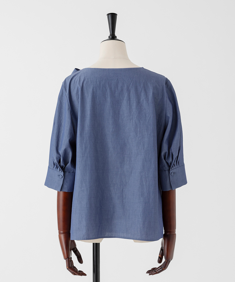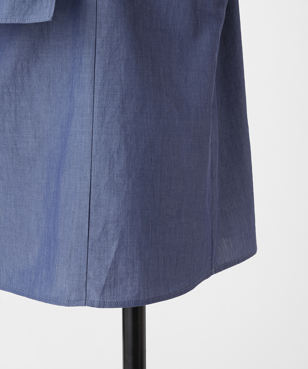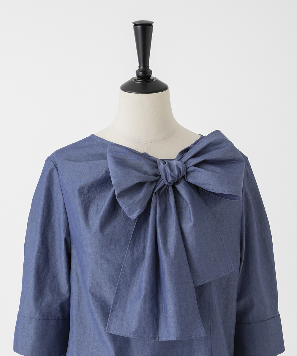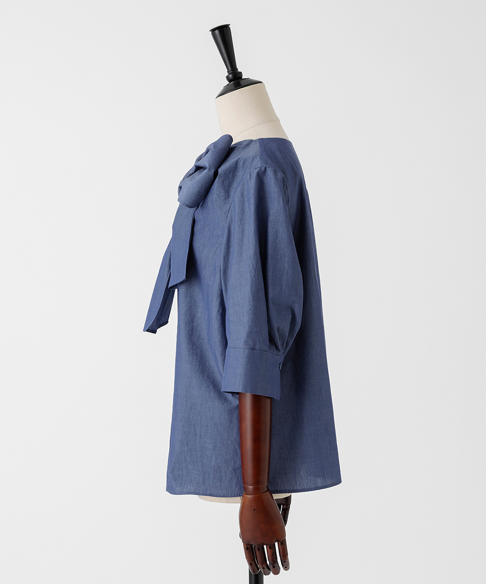 身頃から続くドレーピーなボウタイが特徴的なブラウス。アシンメトリーにドレープが生まれるよう計算されたデザイン。ジャケットインにも使いやすいサイジング。身頃から続くドレーピーなボウタイが特徴的なブラウス。アシンメトリーにドレープが生まれるよう計算されたデザイン。ジャケットインにも使いやすいサイジング。イタリア製素材を使用。細番手のコットンを高密度に織り上げ、さらに表情を生み出す加工を丁寧に施すことで、程よいナチュラルな印象を持った素材に仕上げました。同型・素材違い[FGBAG43430]もご用意いたしております。