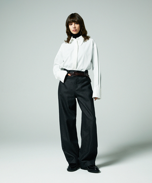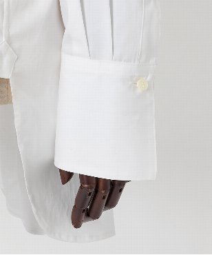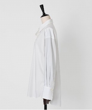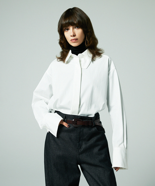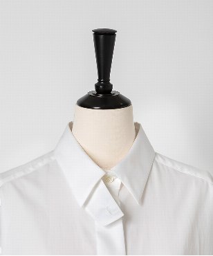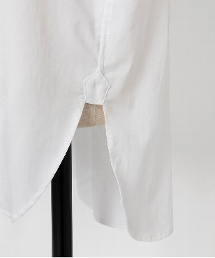 端正な表情のホワイトシャツは衿元に取り外しできるスロートタブをセット。タブを取り付ければ違った表情での着こなしが楽しめるデザインです。極細の100番手単糸のコットンを使用したサテン素材は光沢のあるシルキーなタッチが特徴。さらにハリ・コシを持たせる特殊な後加工によって程よい反発感を出しています。日本製生地。