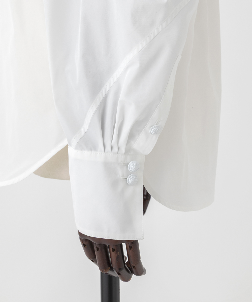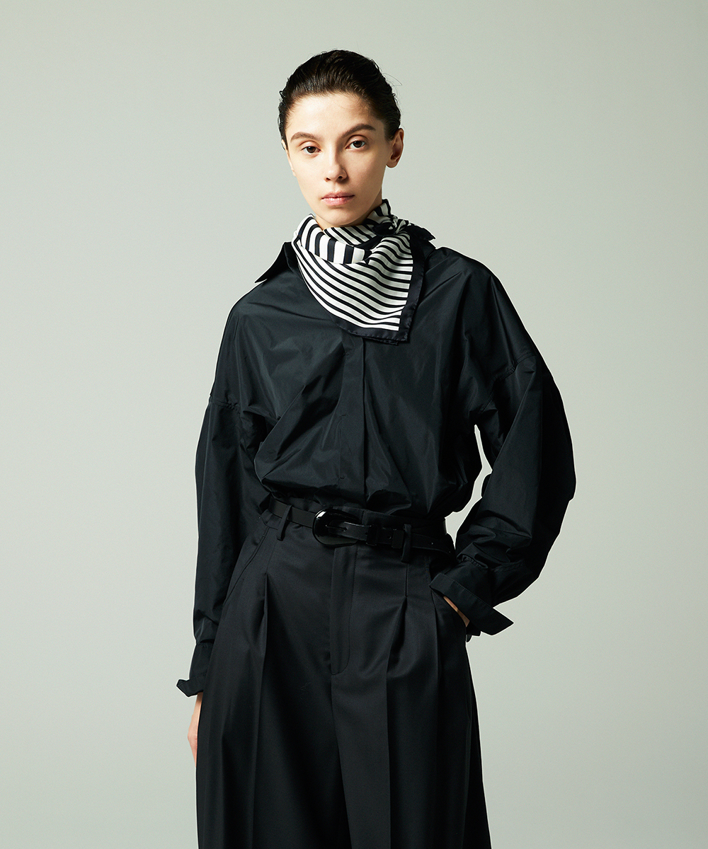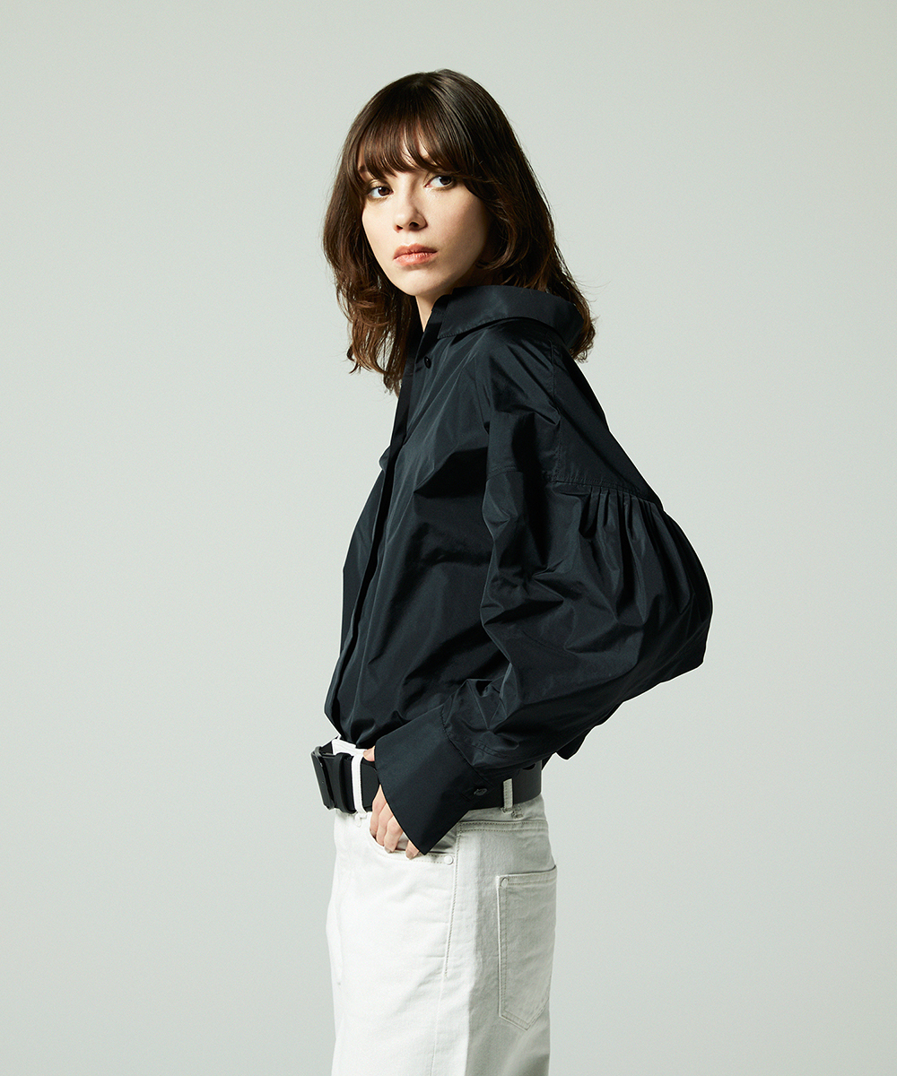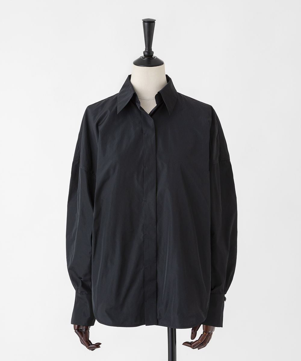 高めの衿腰がシャープな印象のドルマンスリーブシャツ。エンブレム塗装ボタンがアクセント。人気シャツをさらにブラッシュアップし再登場させました。イタリア製生地を使用。イタリアはコモ地方の老舗テキスタイルメーカーによる細番手高密度ポリエステルタフタ。シルクタフタのようなハリ感と程よい落ち感を併せ持つ素材です。