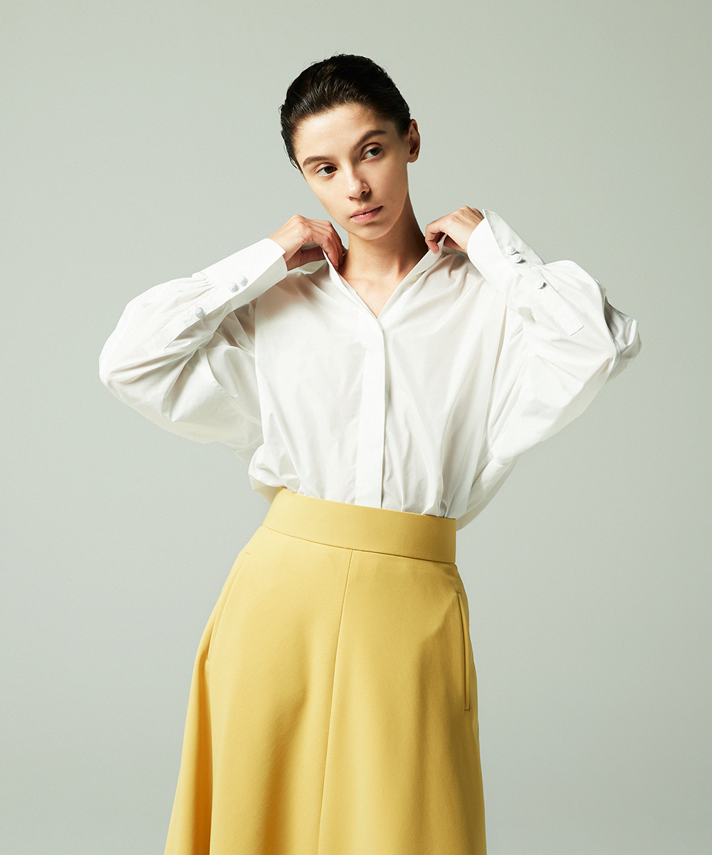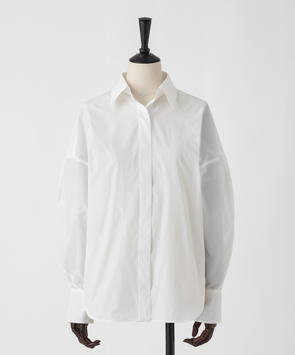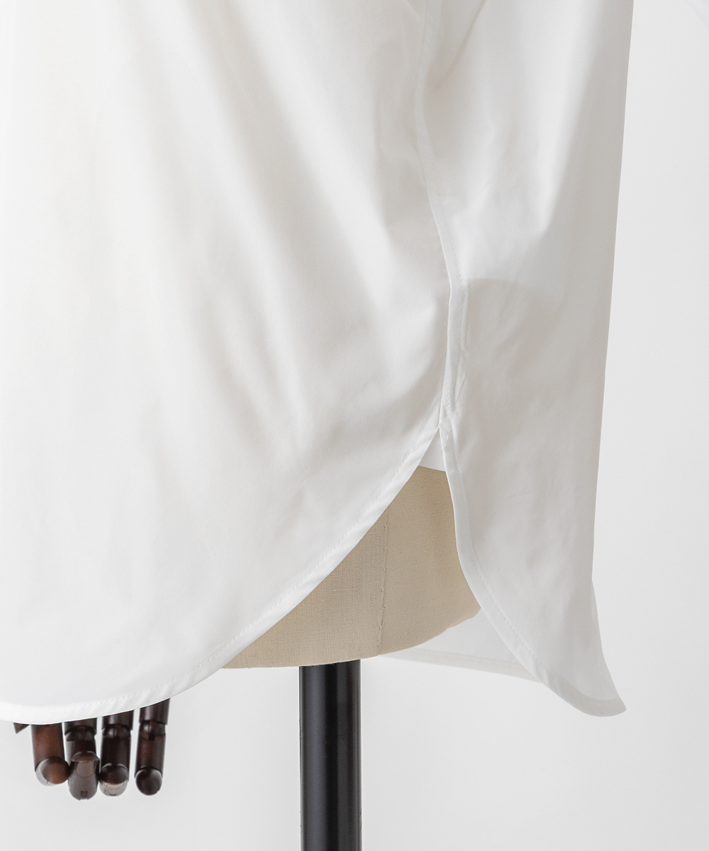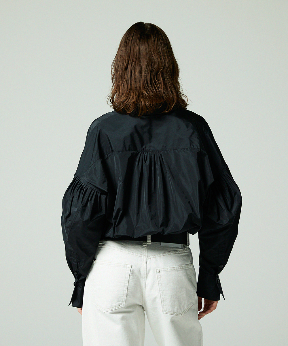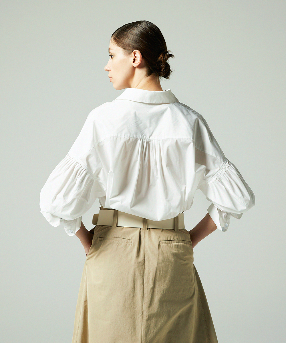 高めの衿腰がシャープな印象のドルマンスリーブシャツ。エンブレム塗装ボタンがアクセント。人気シャツをさらにブラッシュアップし再登場させました。イタリア製生地を使用。イタリアはコモ地方の老舗テキスタイルメーカーによる細番手高密度ポリエステルタフタ。シルクタフタのようなハリ感と程よい落ち感を併せ持つ素材です。