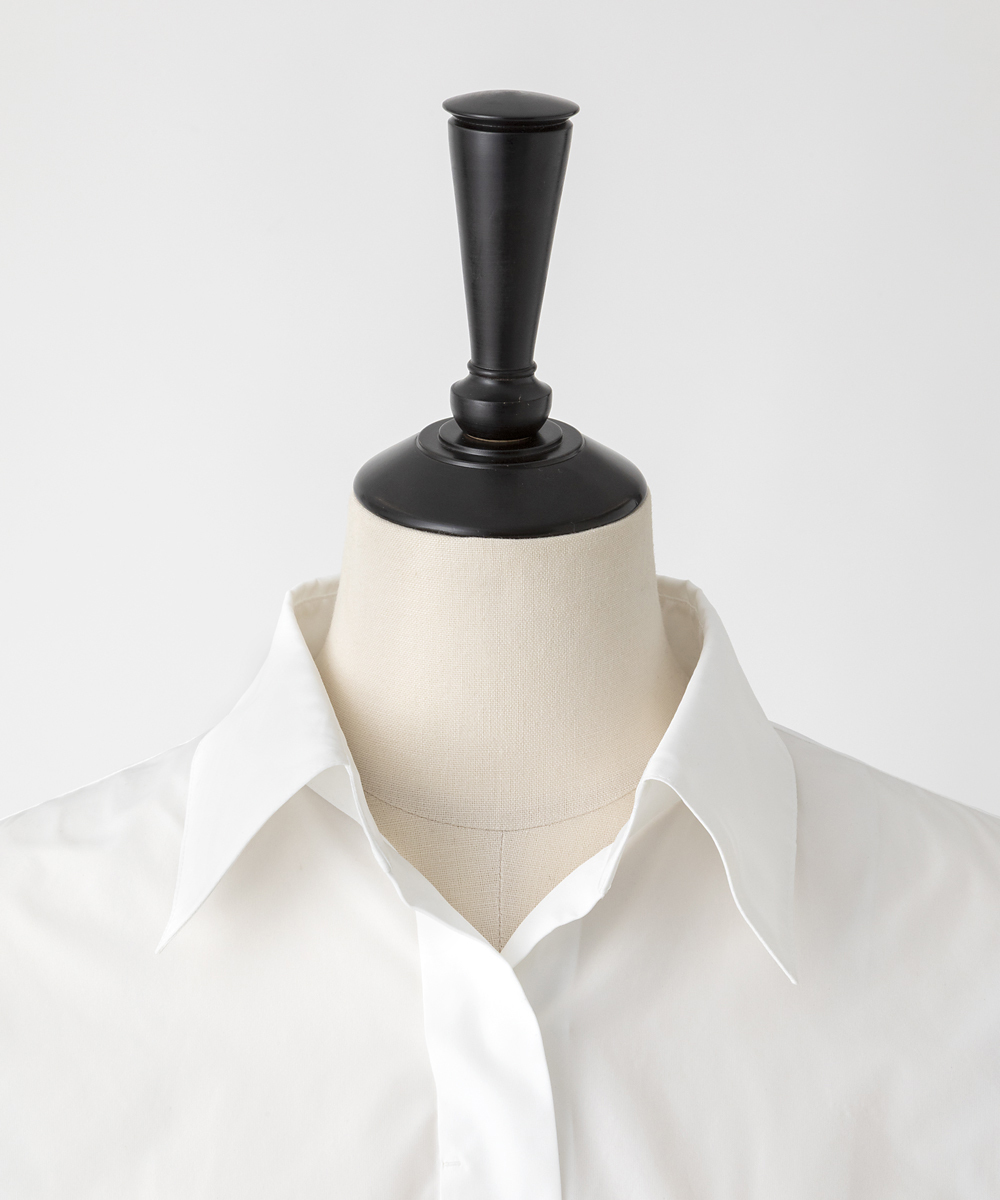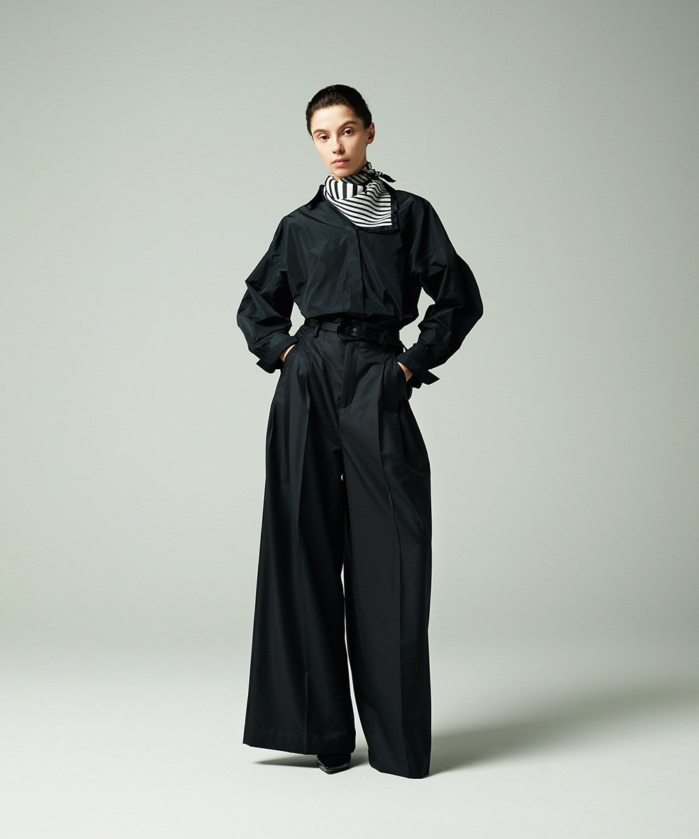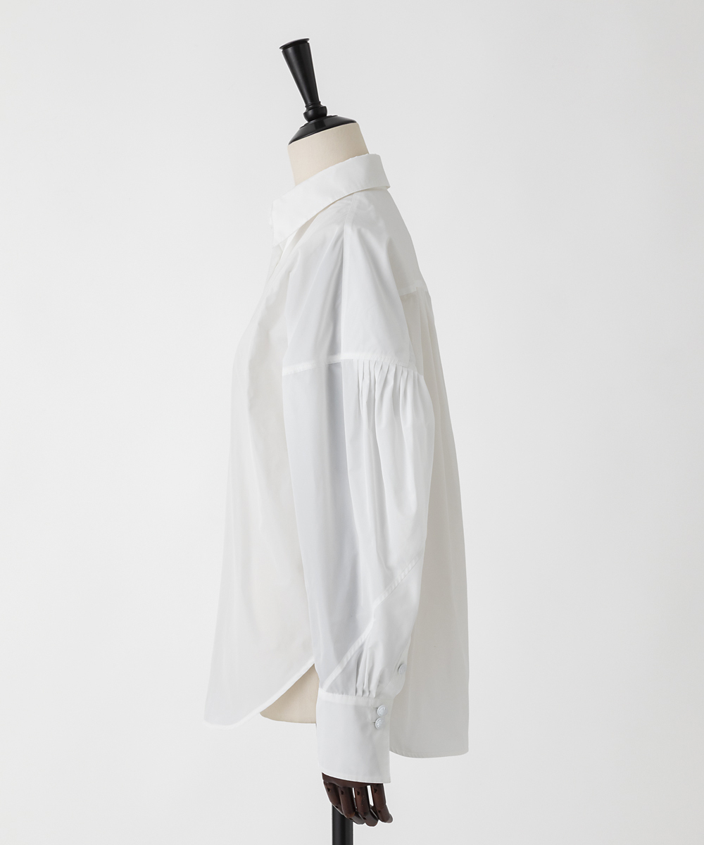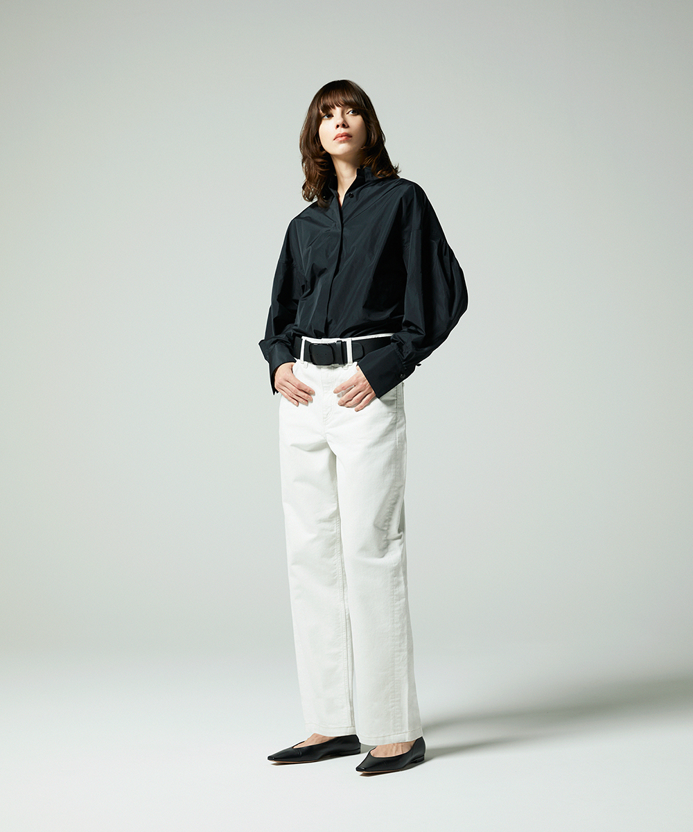 高めの衿腰がシャープな印象のドルマンスリーブシャツ。エンブレム塗装ボタンがアクセント。人気シャツをさらにブラッシュアップし再登場させました。イタリア製生地を使用。イタリアはコモ地方の老舗テキスタイルメーカーによる細番手高密度ポリエステルタフタ。シルクタフタのようなハリ感と程よい落ち感を併せ持つ素材です。