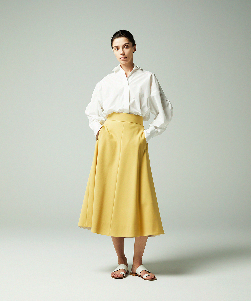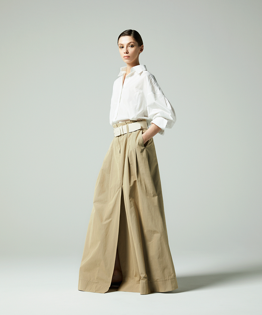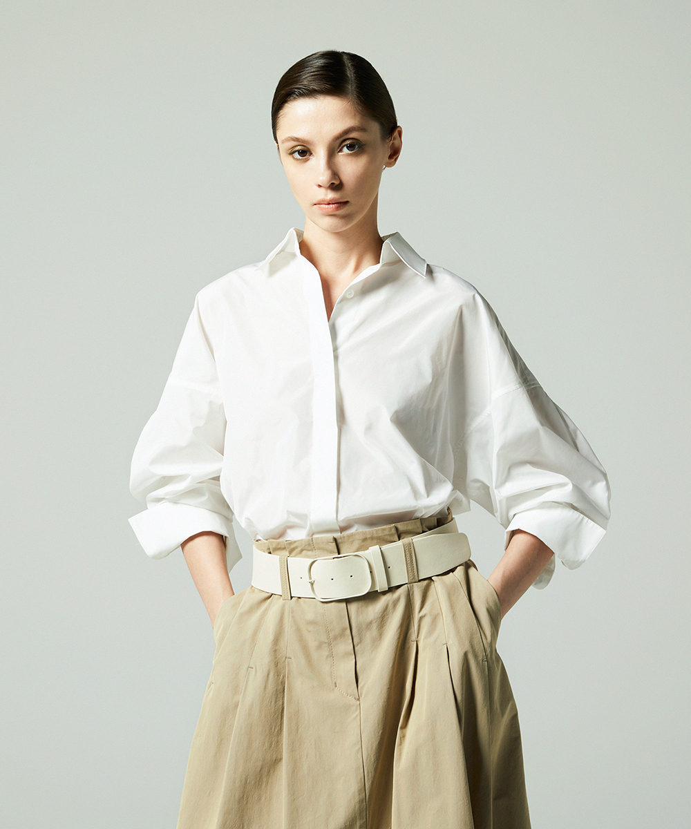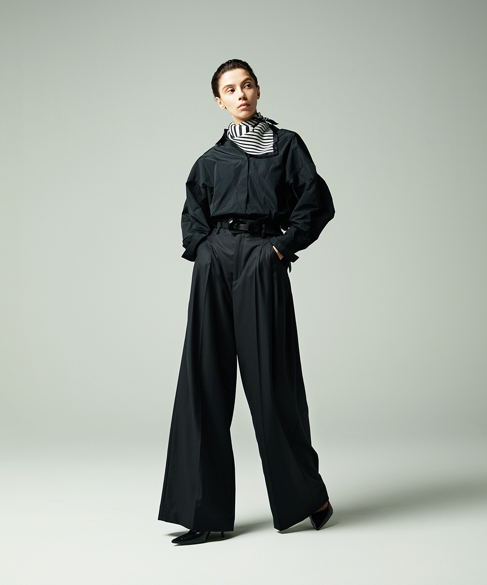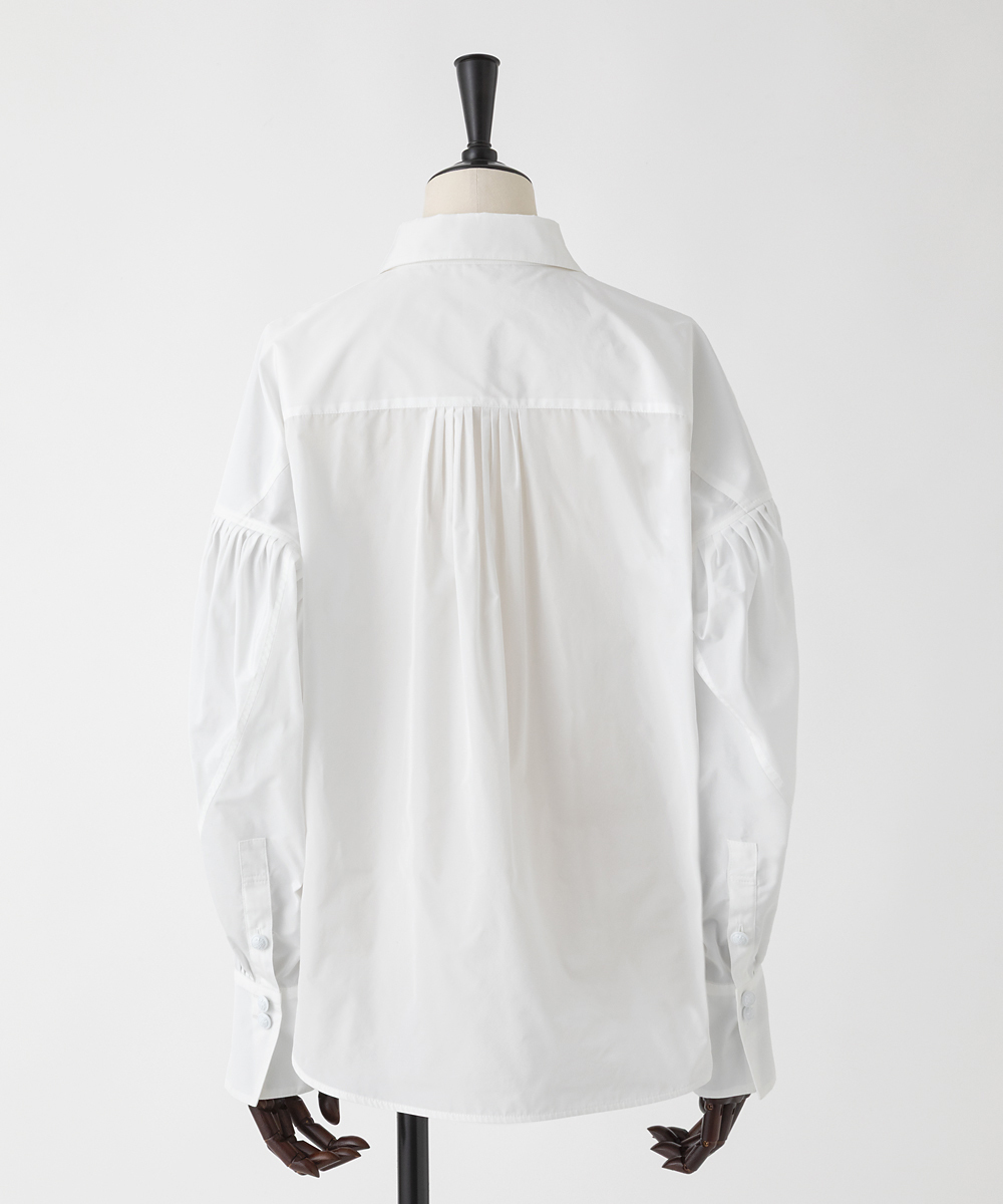 高めの衿腰がシャープな印象のドルマンスリーブシャツ。エンブレム塗装ボタンがアクセント。人気シャツをさらにブラッシュアップし再登場させました。イタリア製生地を使用。イタリアはコモ地方の老舗テキスタイルメーカーによる細番手高密度ポリエステルタフタ。シルクタフタのようなハリ感と程よい落ち感を併せ持つ素材です。