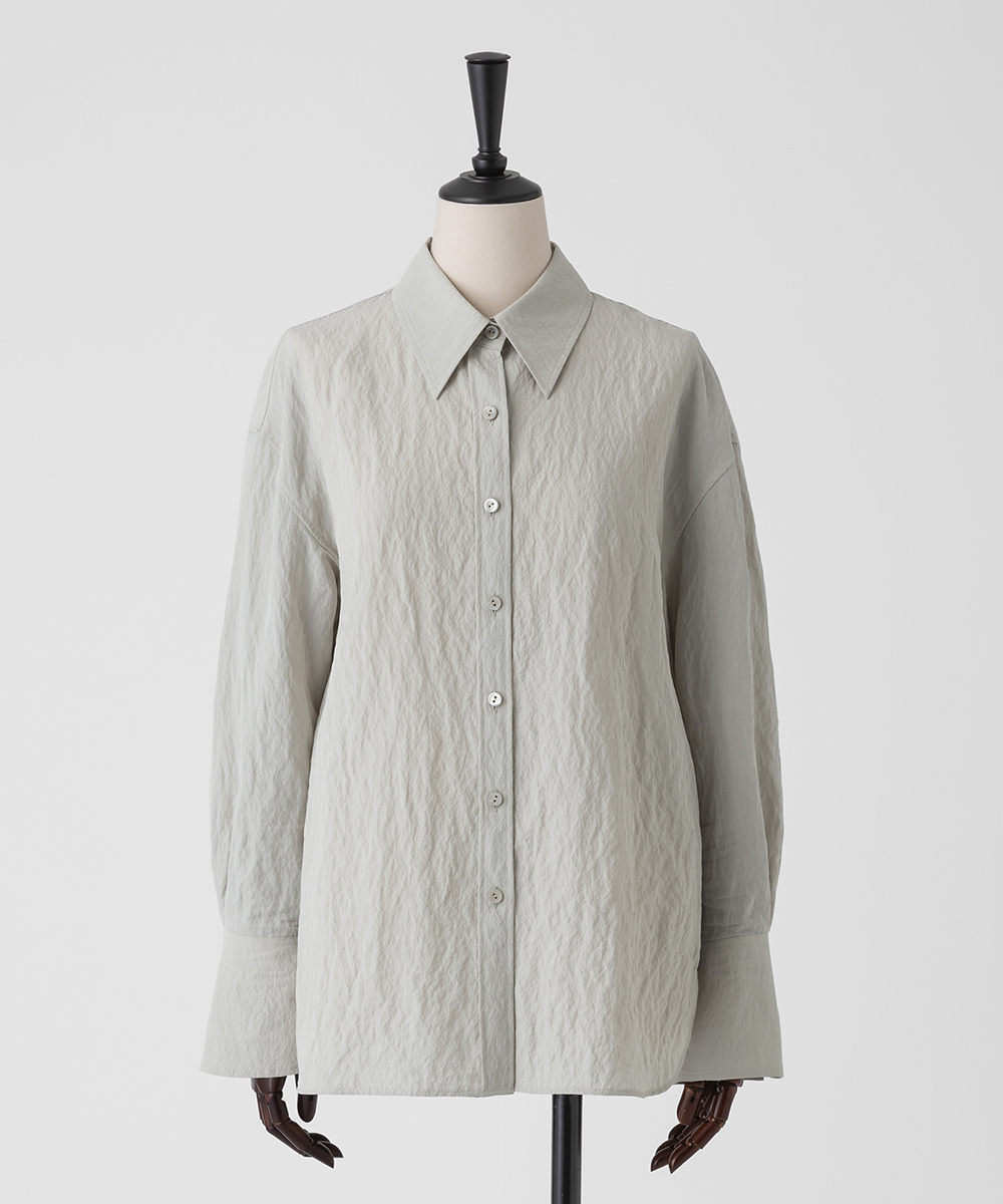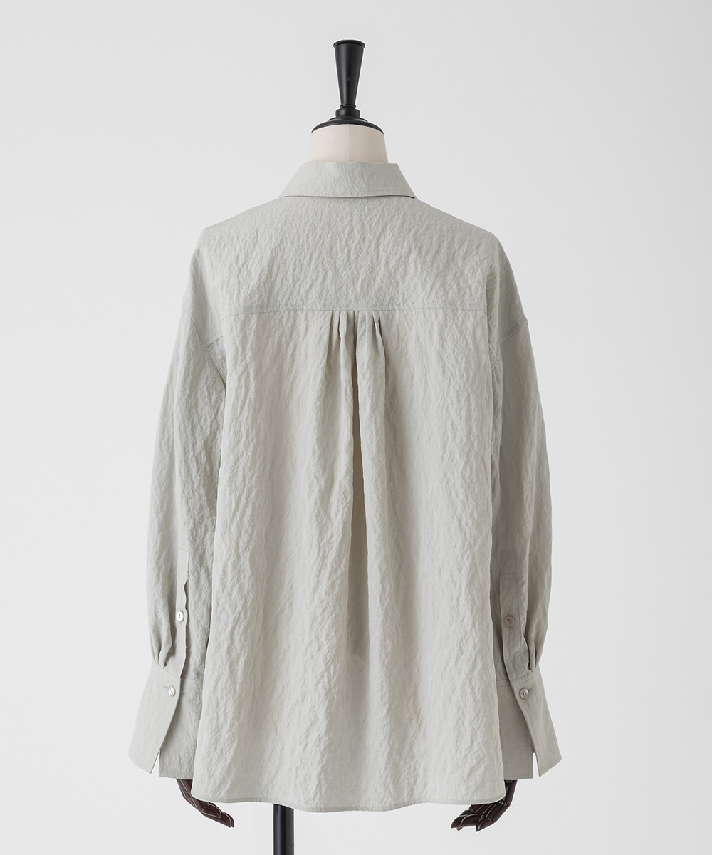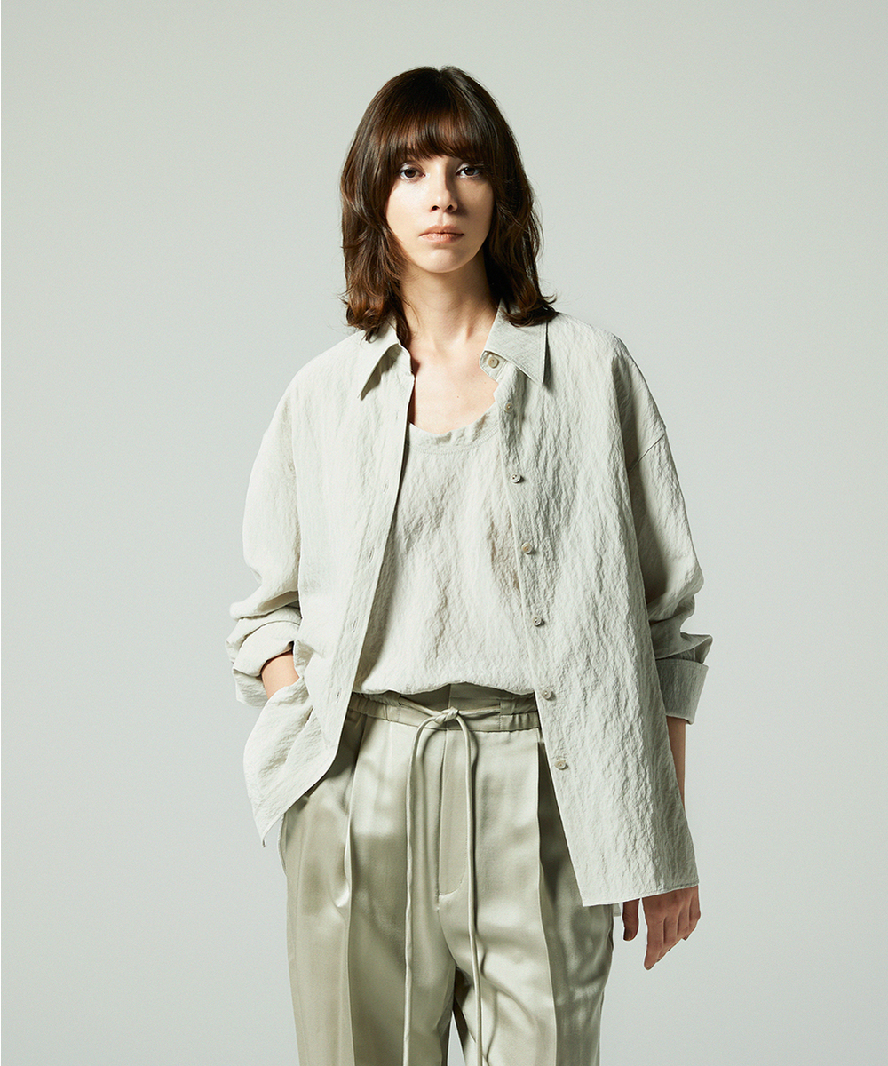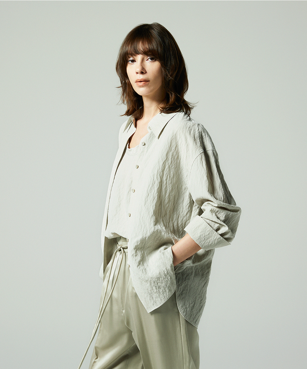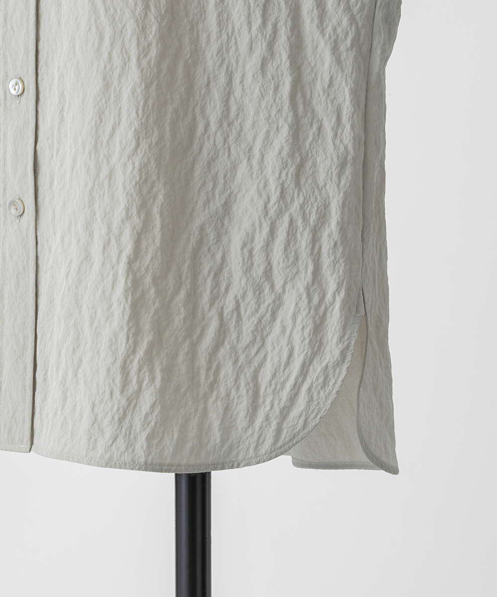 素材の表情をいかしたシンプルなシャツ。ジャケットインにも抜け感を出せ、羽織としても活用できるアイテムです。シルク・ナイロン糸を使用したワッシャー感が特徴の素材を使用。シルクスパン糸を使用したマット感のある生地を手仕事によりサンドウォッシュ、その後高温で洗うという手の込んだ仕上げにより特殊なワッシャー感を生み出しています。シルクナイロンワッシャーのシリーズとして、シルクナイロンシャツ[FGBGD13490]・シルクナイロンタンクトップ[FGBGD14330]・シルクナイロンロングスカート[FGHGD14900]をご用意いたしております。