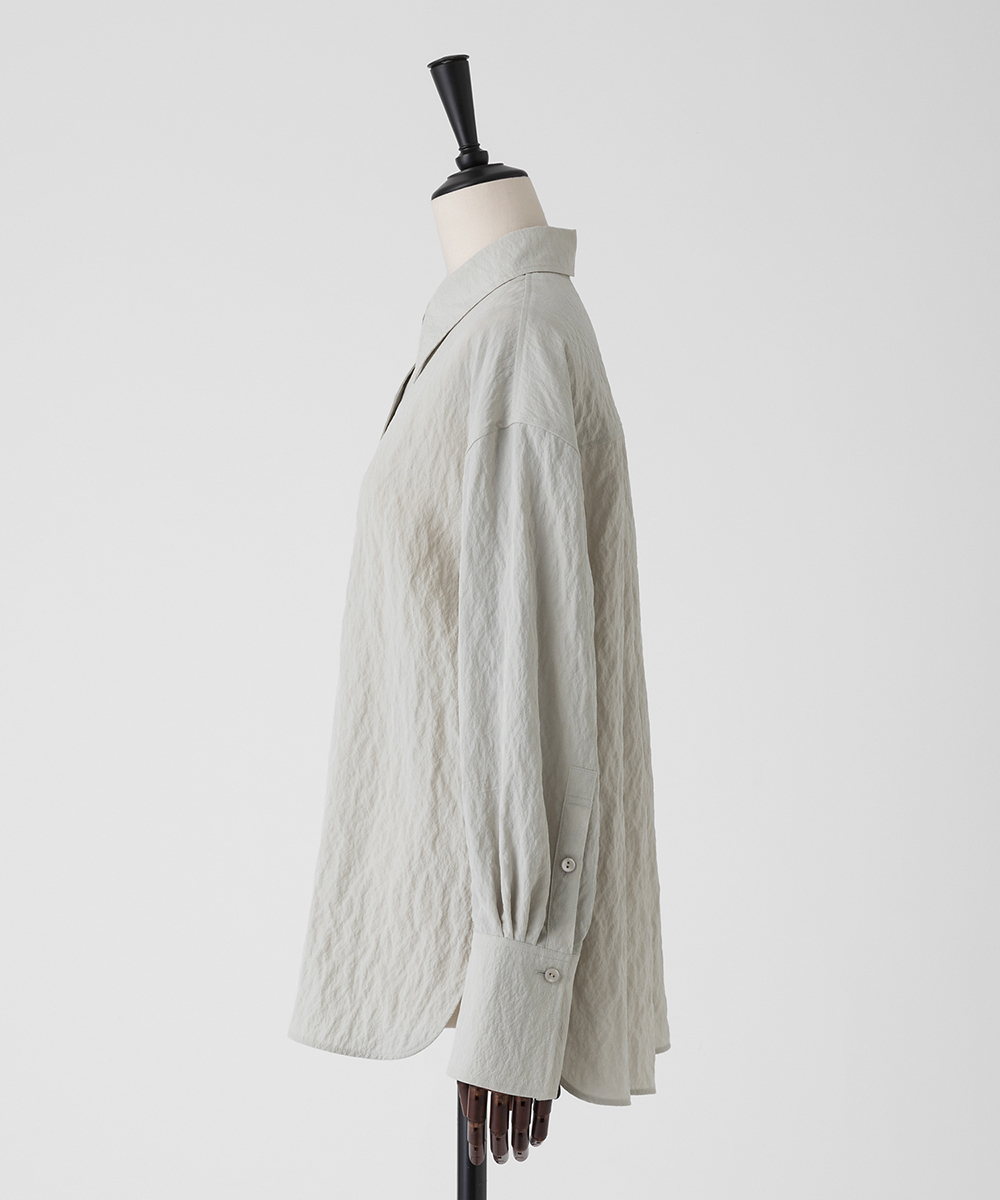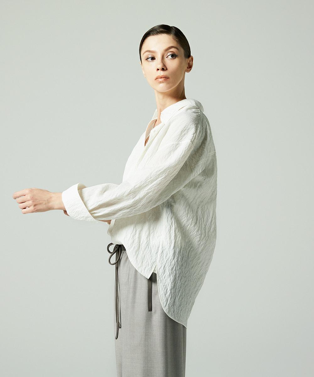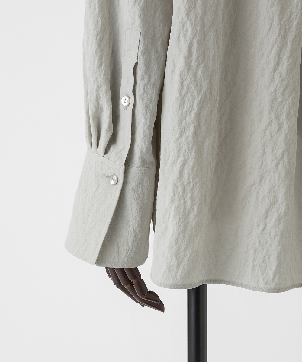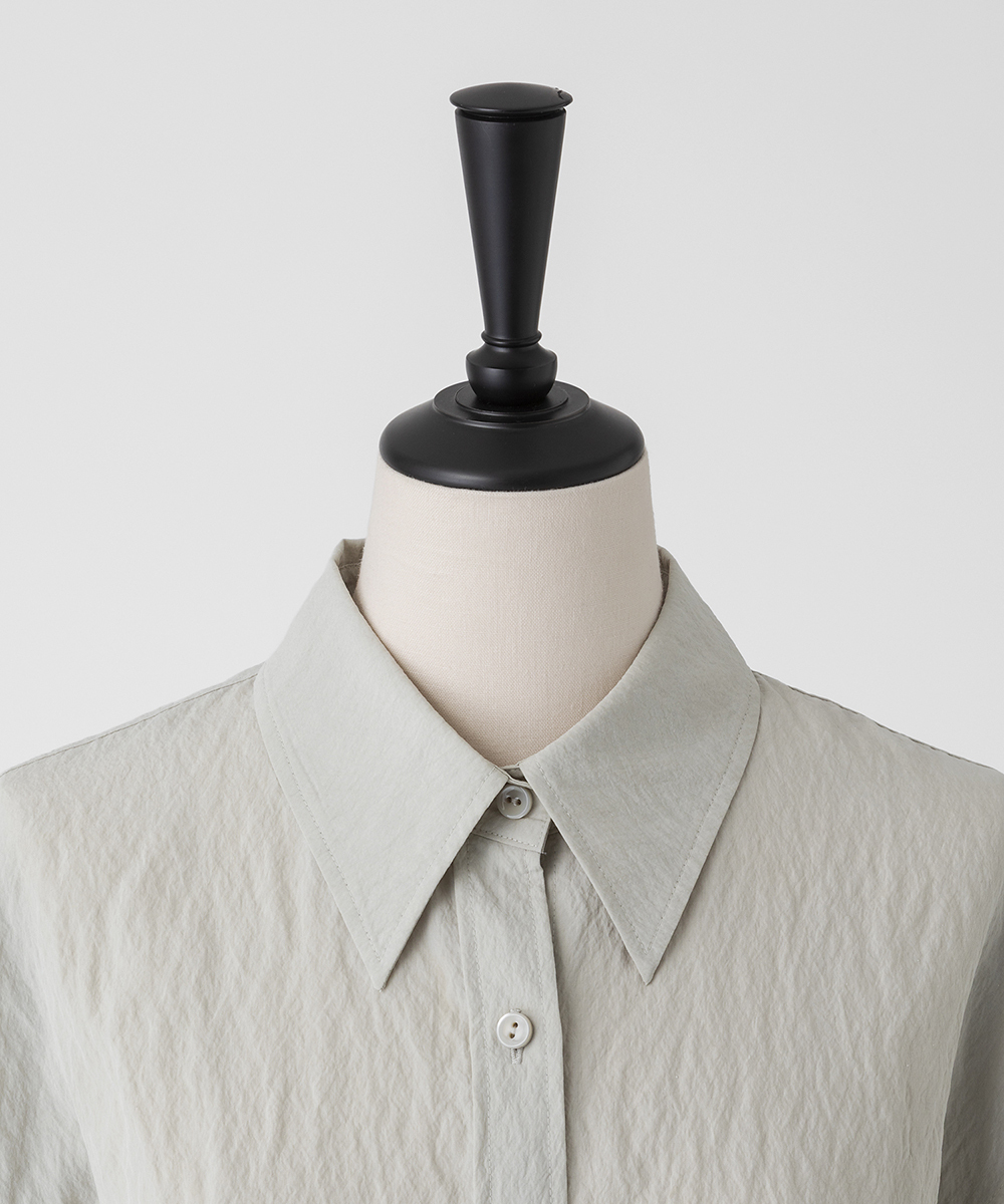 素材の表情をいかしたシンプルなシャツ。ジャケットインにも抜け感を出せ、羽織としても活用できるアイテムです。シルク・ナイロン糸を使用したワッシャー感が特徴の素材を使用。シルクスパン糸を使用したマット感のある生地を手仕事によりサンドウォッシュ、その後高温で洗うという手の込んだ仕上げにより特殊なワッシャー感を生み出しています。シルクナイロンワッシャーのシリーズとして、シルクナイロンシャツ[FGBGD13490]・シルクナイロンタンクトップ[FGBGD14330]・シルクナイロンロングスカート[FGHGD14900]をご用意いたしております。