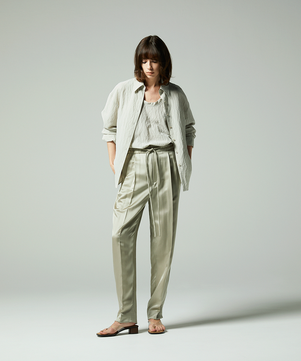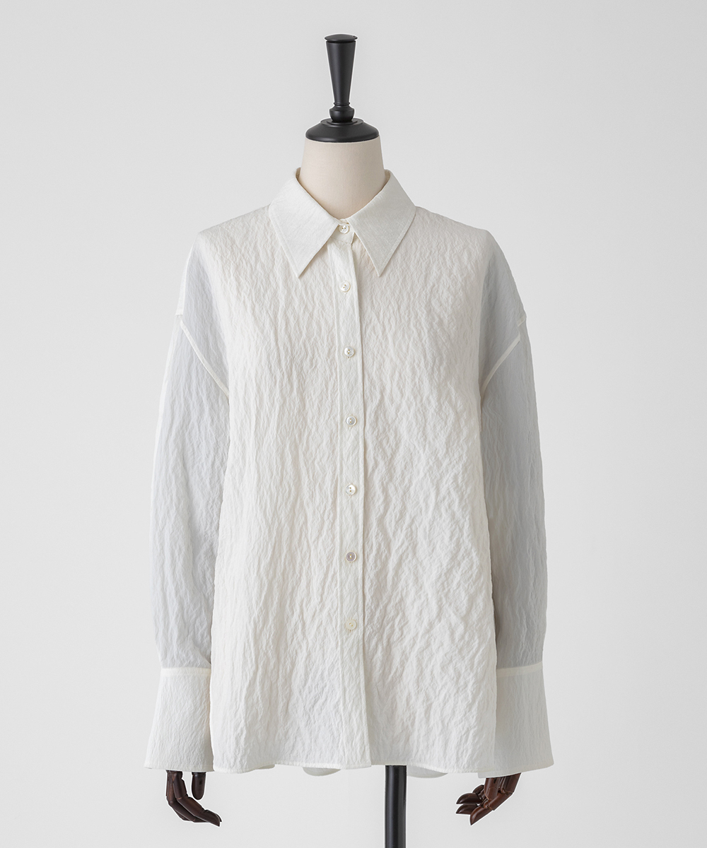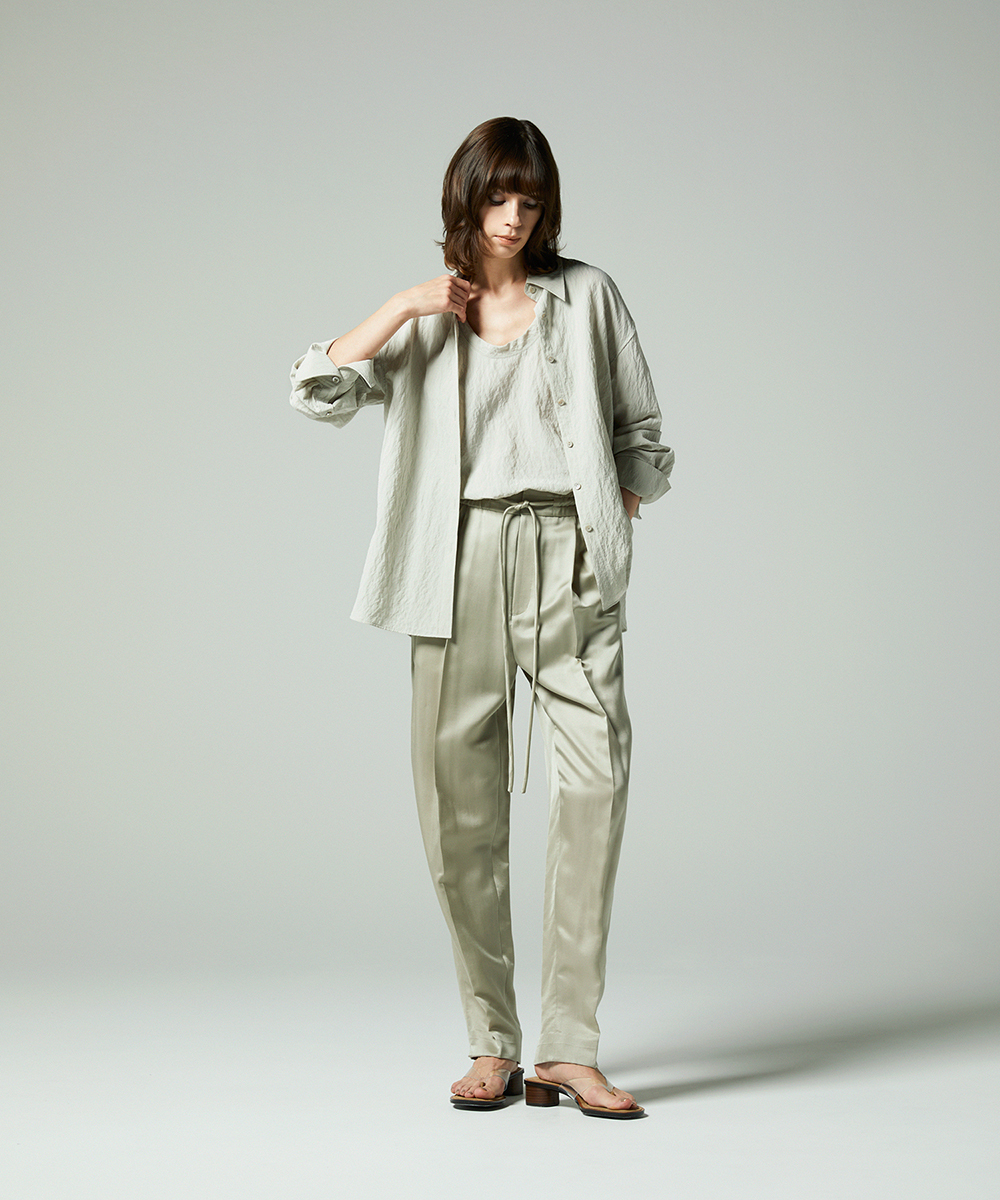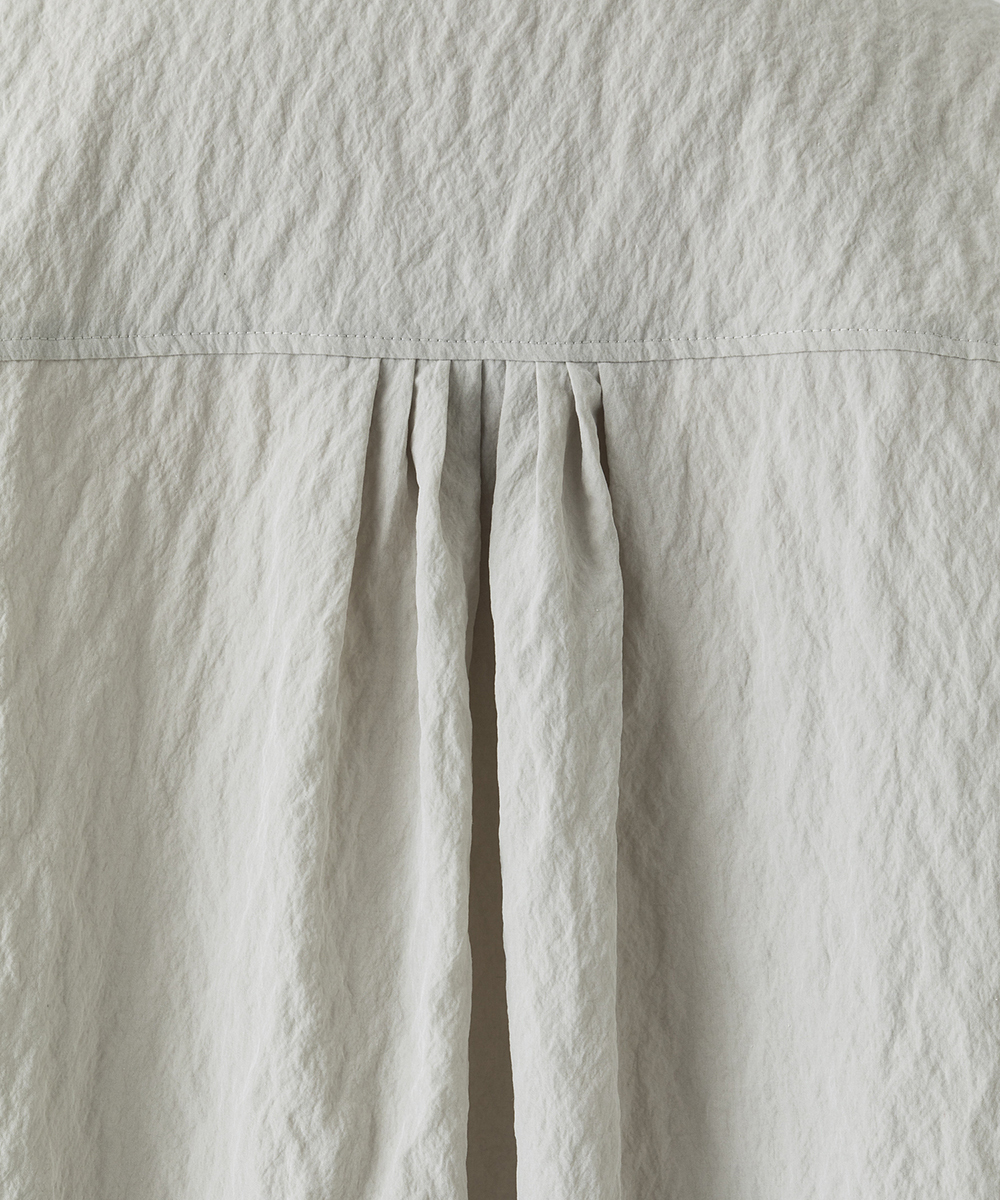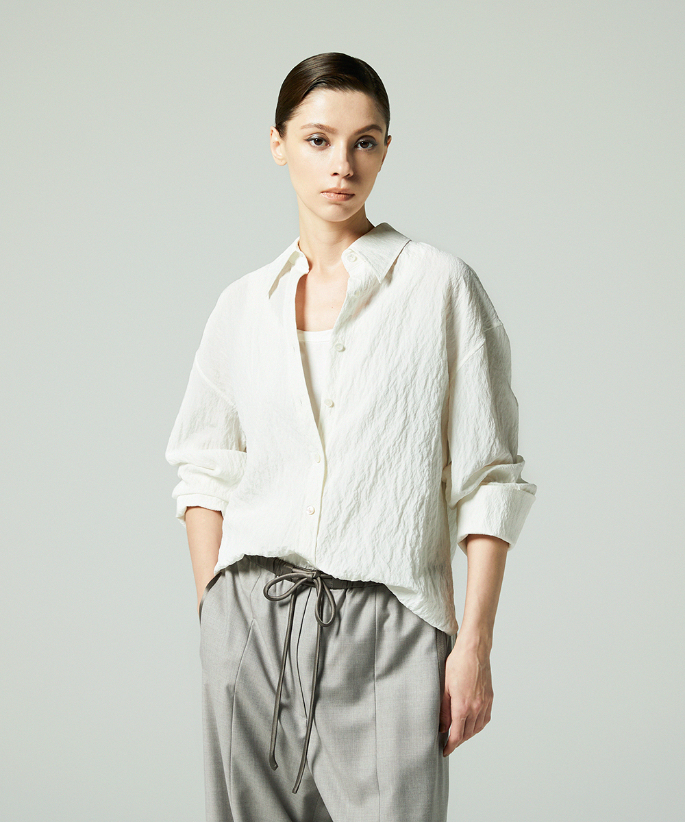 素材の表情をいかしたシンプルなシャツ。ジャケットインにも抜け感を出せ、羽織としても活用できるアイテムです。シルク・ナイロン糸を使用したワッシャー感が特徴の素材を使用。シルクスパン糸を使用したマット感のある生地を手仕事によりサンドウォッシュ、その後高温で洗うという手の込んだ仕上げにより特殊なワッシャー感を生み出しています。シルクナイロンワッシャーのシリーズとして、シルクナイロンシャツ[FGBGD13490]・シルクナイロンタンクトップ[FGBGD14330]・シルクナイロンロングスカート[FGHGD14900]をご用意いたしております。