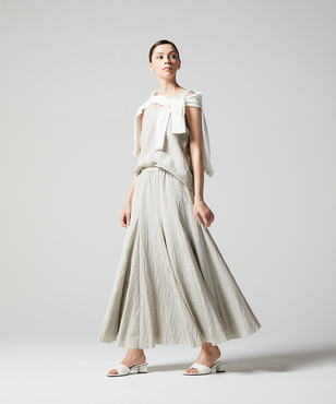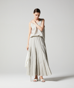 幅広のネック&アームホール切り替えがポイントのタンクトップブラウス。切り替えに振りミシンをいれて程よいカジュアル感を持たせています。シルク・ナイロン糸を使用したワッシャー感が特徴の素材を使用。シルクスパン糸を使用したマット感のある生地を手仕事によりサンドウォッシュ、その後高温で洗うという手の込んだ仕上げにより特殊なワッシャー感を生み出しています。シルクナイロンワッシャーのシリーズとして、シルクナイロンシャツ[FGBGD13490]・シルクナイロンタンクトップ[FGBGD14330]・シルクナイロンロングスカート[FGHGD14900]をご用意いたしております。