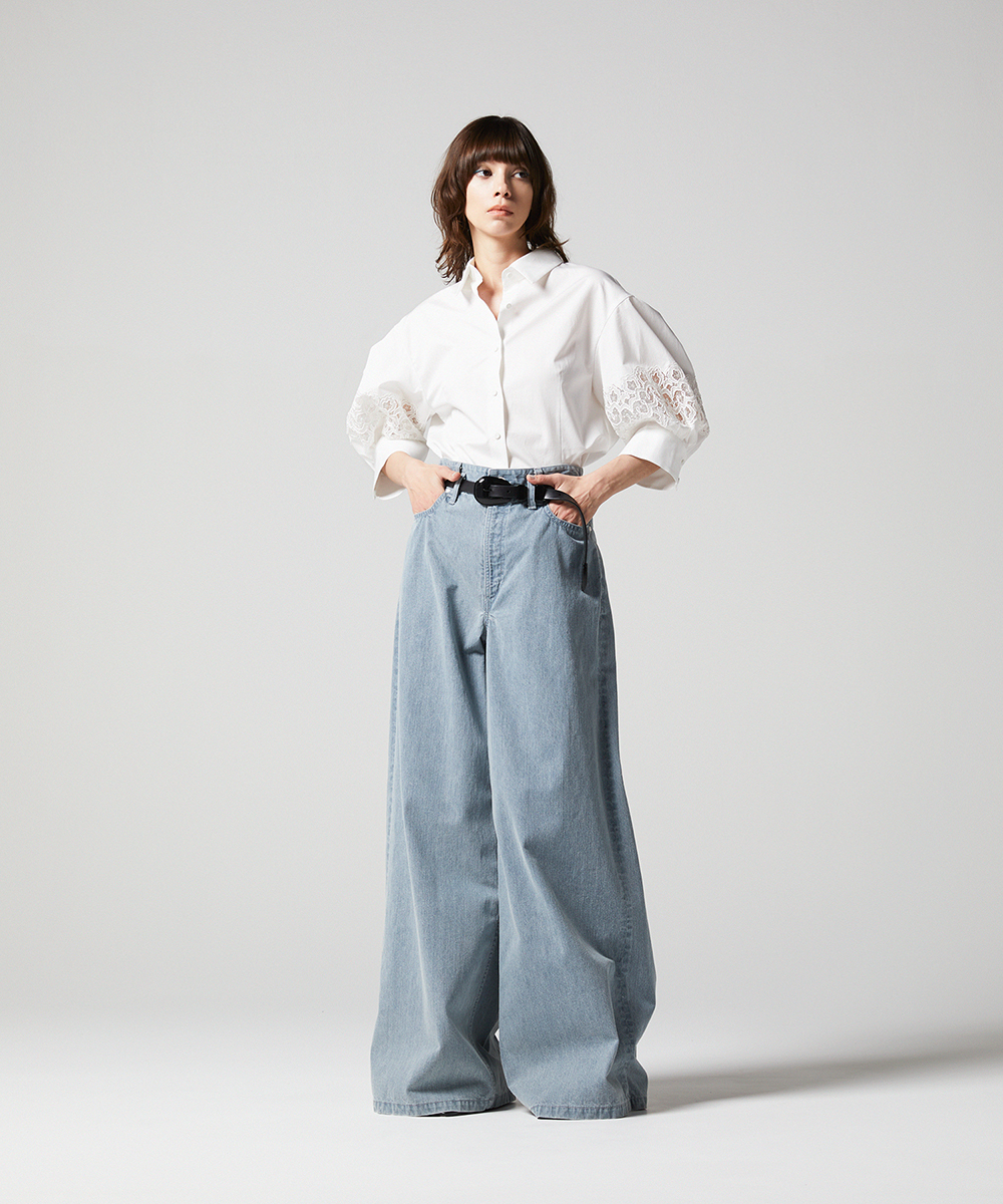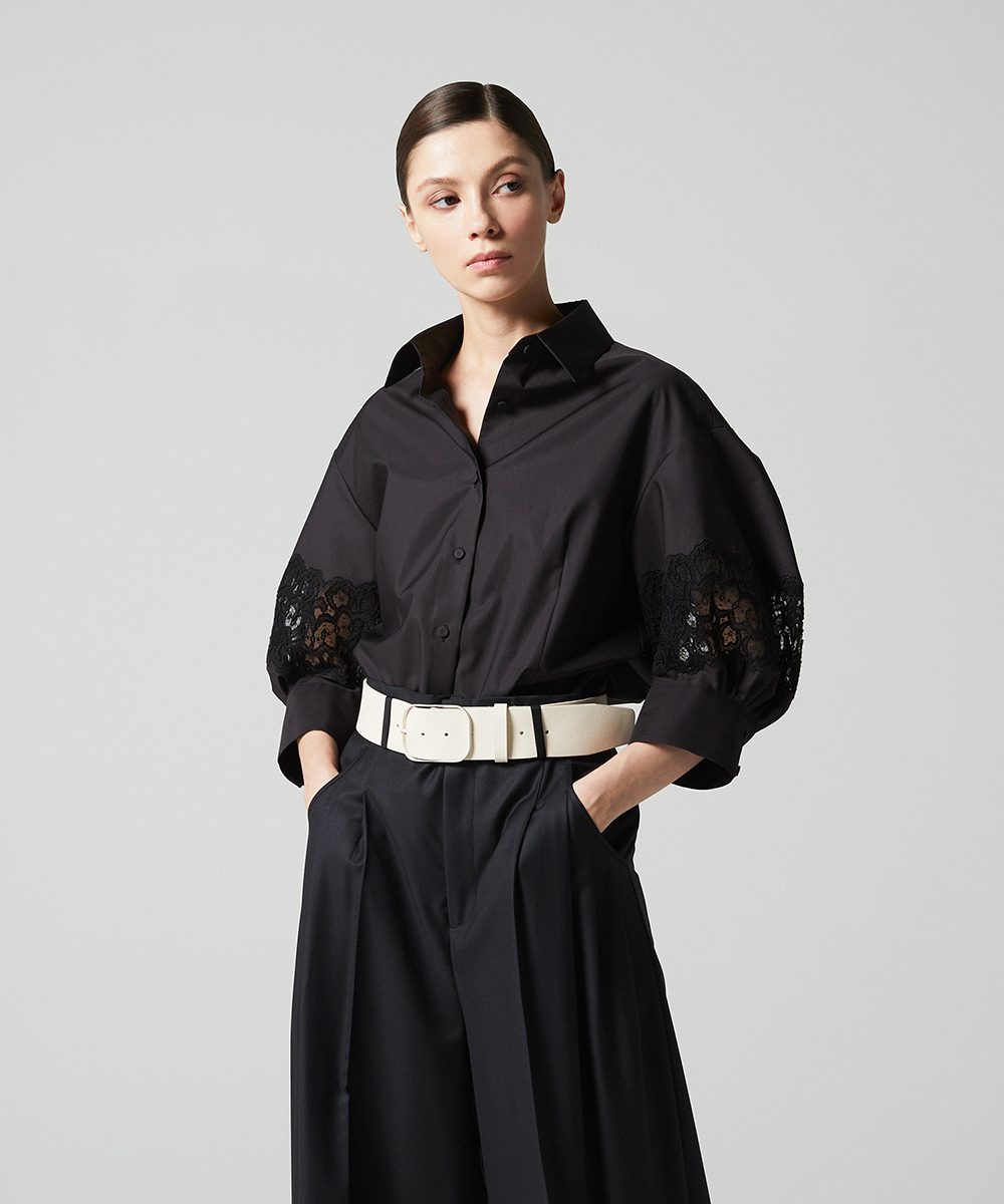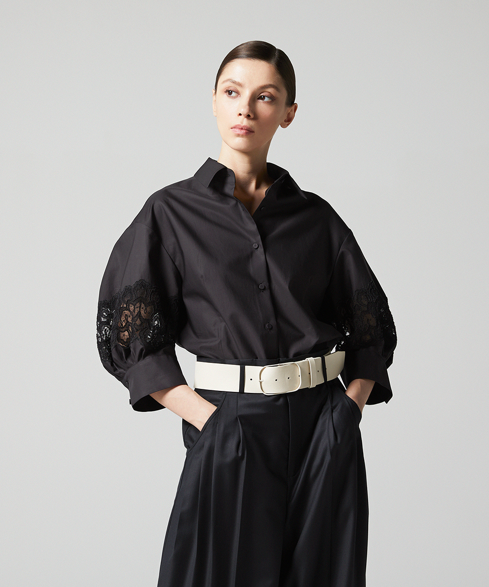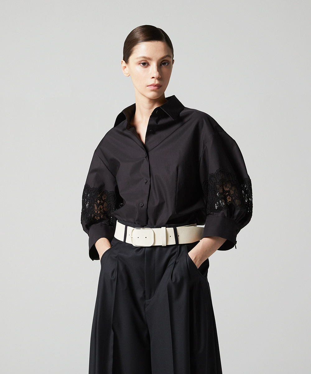 別注したフランスの繊細なレースを袖にあしらった7分袖のシャツ。シャープな衿元で甘くなりすぎないエレガントなシャツです。日本製素材。100/-の細番手コットンを使用したサテン素材は光沢のあるシルキーなタッチが特徴。さらにハリ・コシを持たせる特殊な後加工によって程よい反発感を出しています。EAUVIRE定番の素材です。