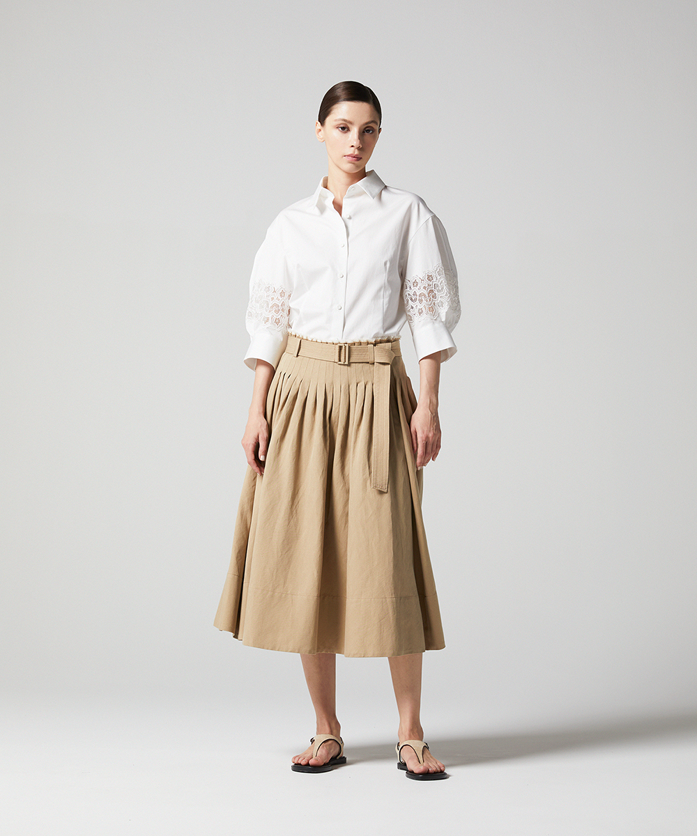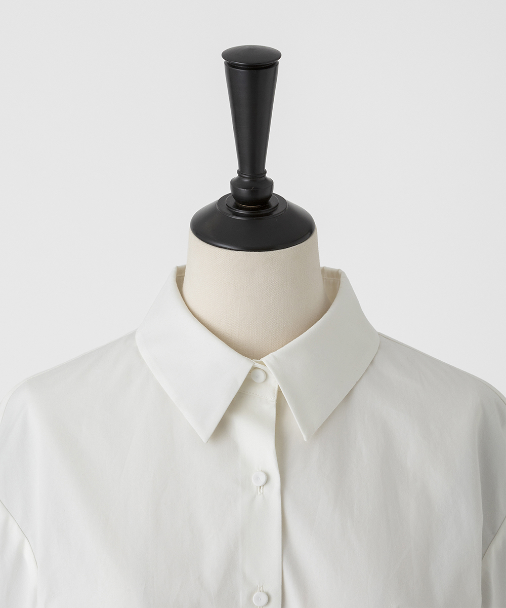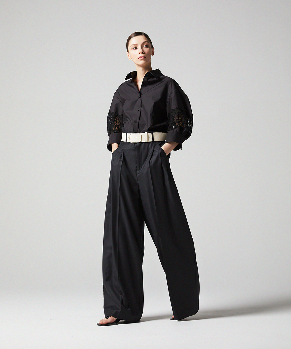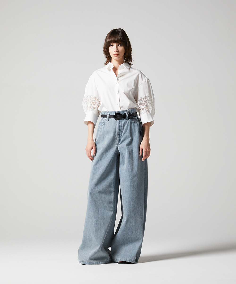 別注したフランスの繊細なレースを袖にあしらった7分袖のシャツ。シャープな衿元で甘くなりすぎないエレガントなシャツです。日本製素材。100/-の細番手コットンを使用したサテン素材は光沢のあるシルキーなタッチが特徴。さらにハリ・コシを持たせる特殊な後加工によって程よい反発感を出しています。EAUVIRE定番の素材です。
