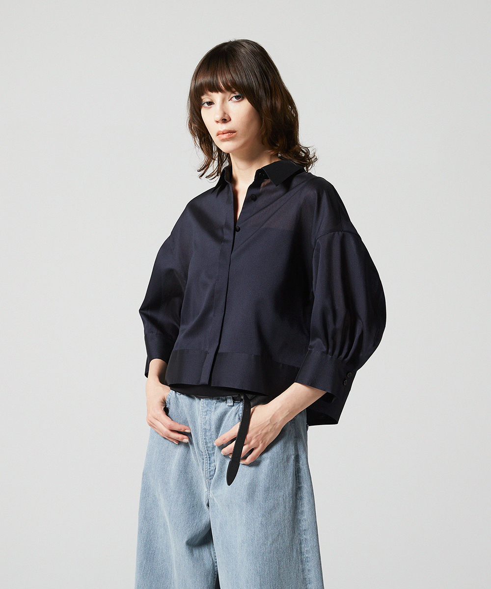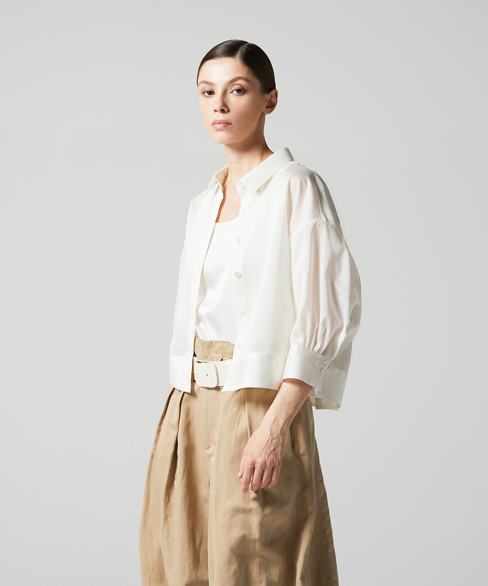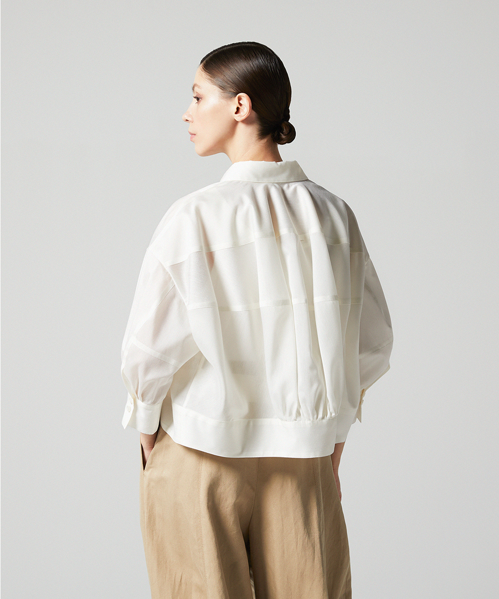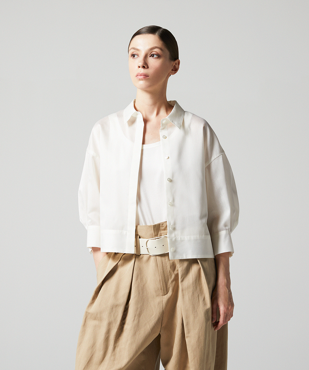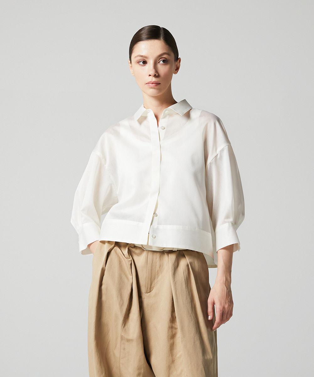 < EAUVIRE EXCLUSIVE >6分袖の短丈シャツ。ふくらみ・立体感のある後身頃が特徴的なデザインで、羽織りとしても使えるデザインシャツです。EAUVIREエクスクルーシヴの日本製生地。軽い透け感と凹凸感のある表情、程よいハリ感が特徴の見た目にも涼し気な素材です。横糸に極細のポリエステル糸と少し太めのレーヨン糸を交互に打ち込むことにより細かいストライプのような凹凸感が生まれ、それがさらりとした肌離れの良さにつながっています。同素材オープンカラーシャツ[FGBGD41450]もご用意いたしております。