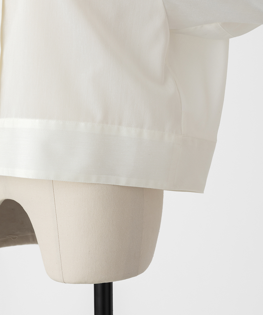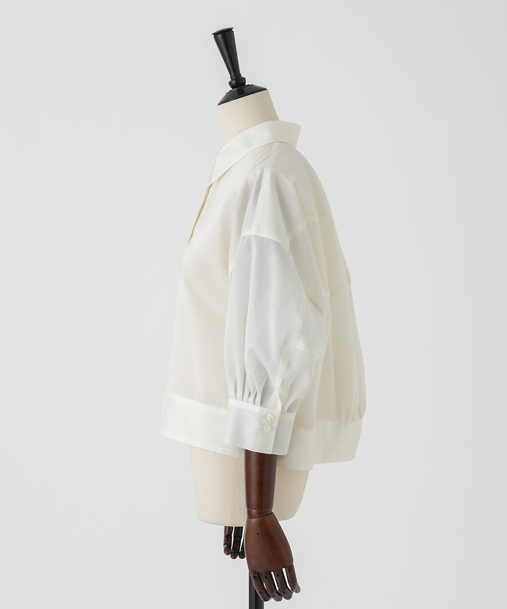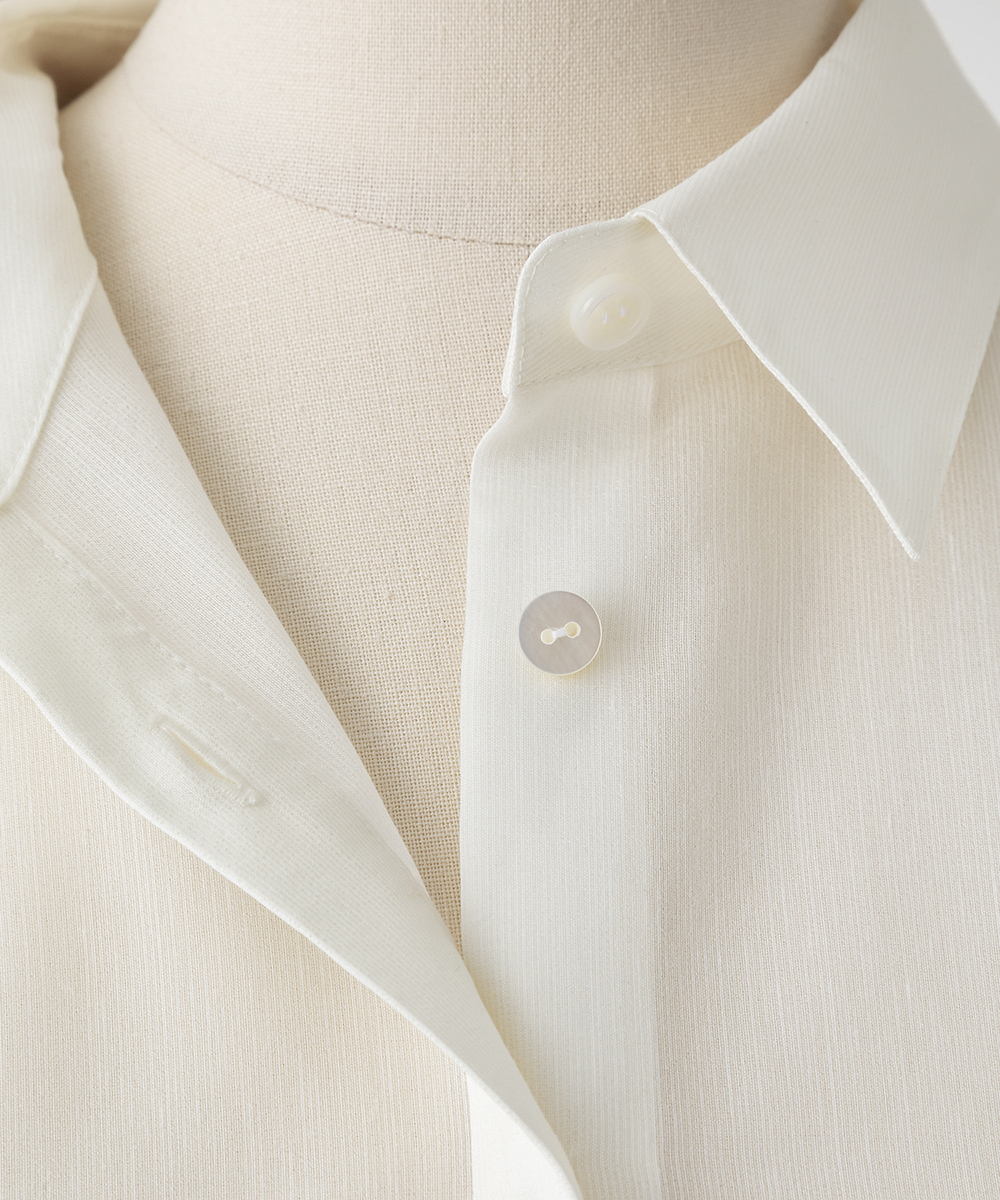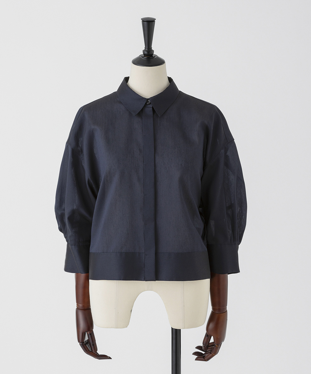 < EAUVIRE EXCLUSIVE >6分袖の短丈シャツ。ふくらみ・立体感のある後身頃が特徴的なデザインで、羽織りとしても使えるデザインシャツです。EAUVIREエクスクルーシヴの日本製生地。軽い透け感と凹凸感のある表情、程よいハリ感が特徴の見た目にも涼し気な素材です。横糸に極細のポリエステル糸と少し太めのレーヨン糸を交互に打ち込むことにより細かいストライプのような凹凸感が生まれ、それがさらりとした肌離れの良さにつながっています。同素材オープンカラーシャツ[FGBGD41450]もご用意いたしております。