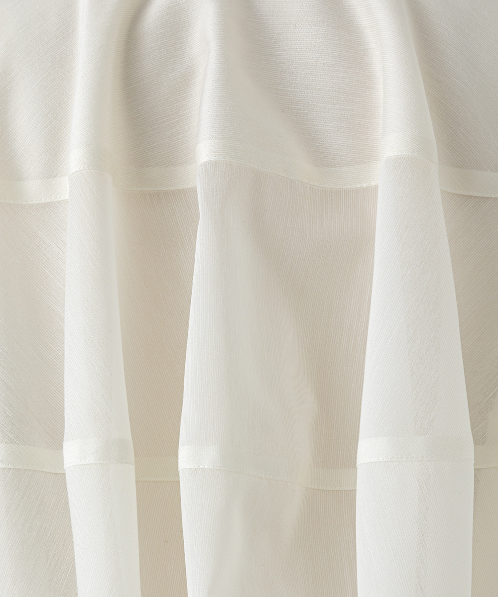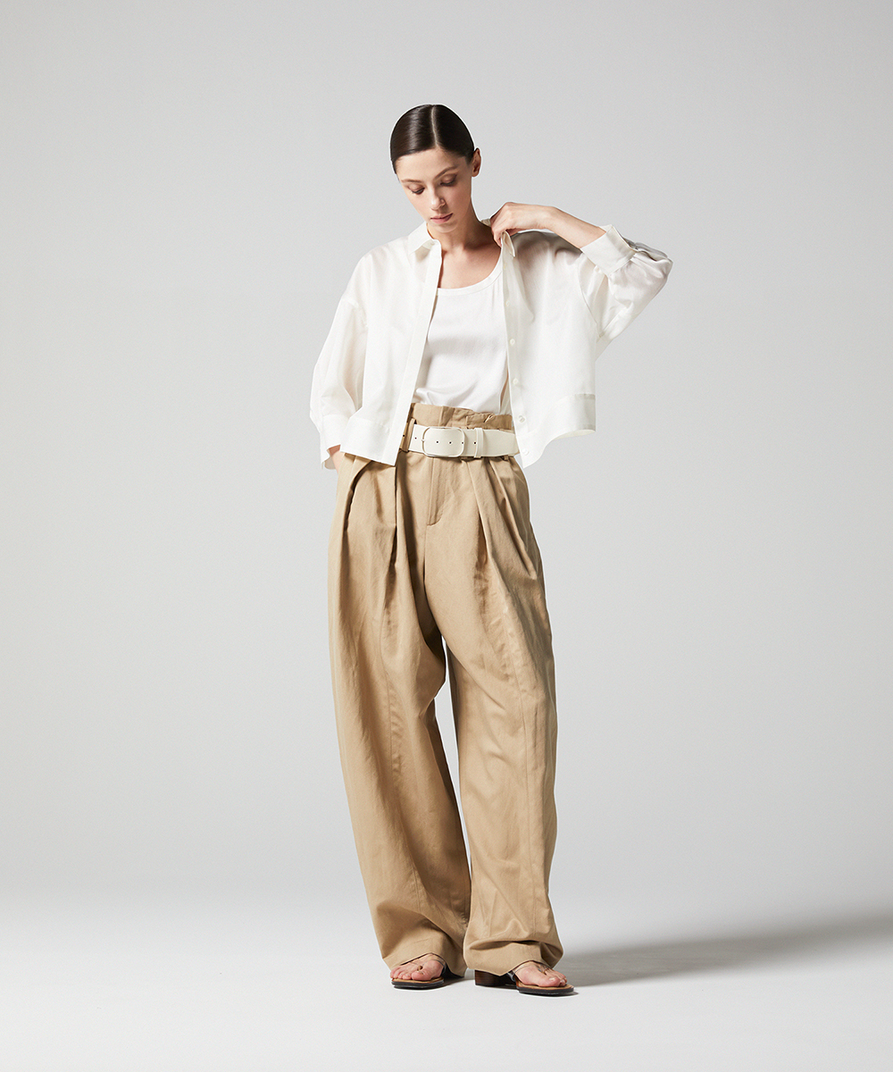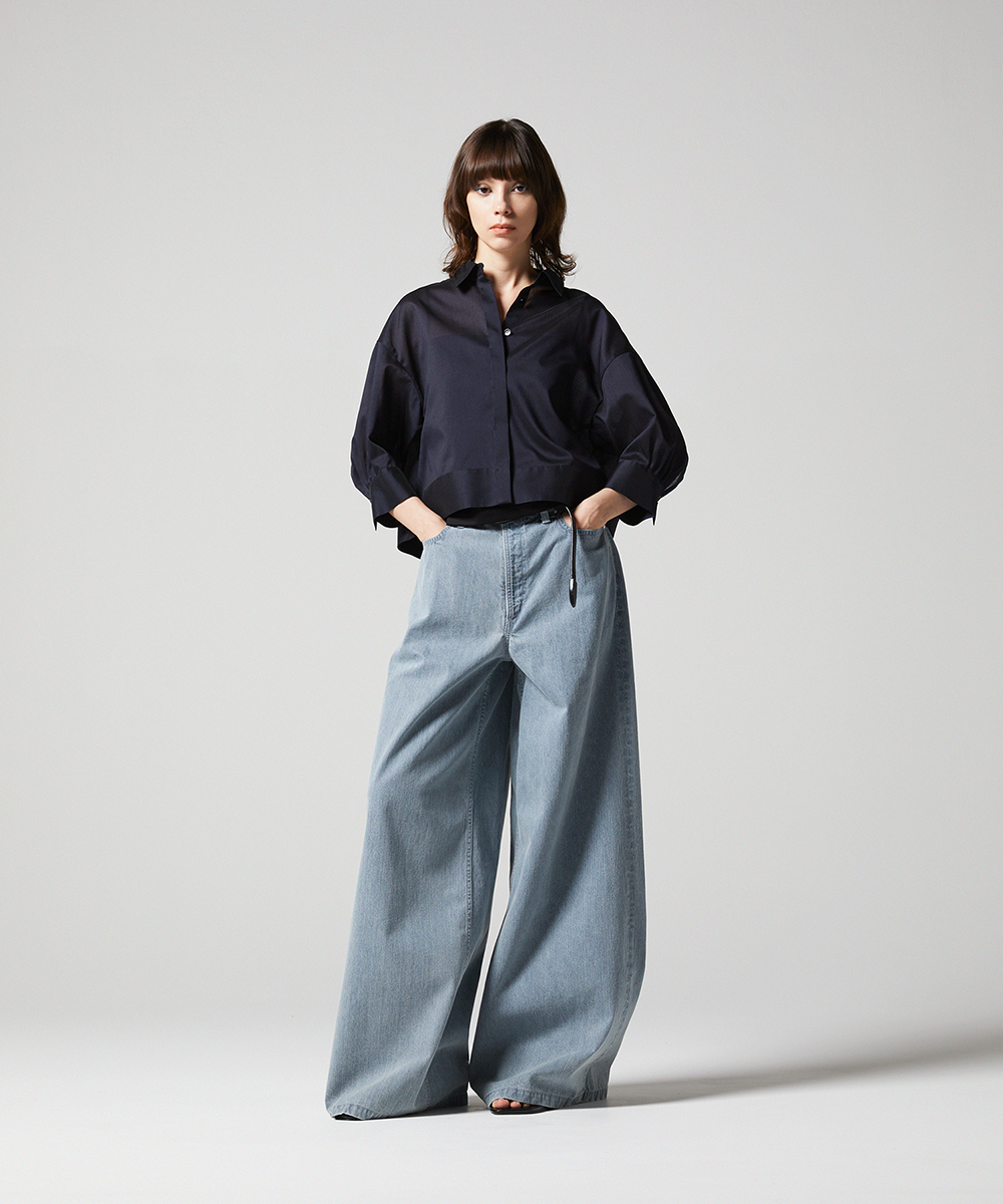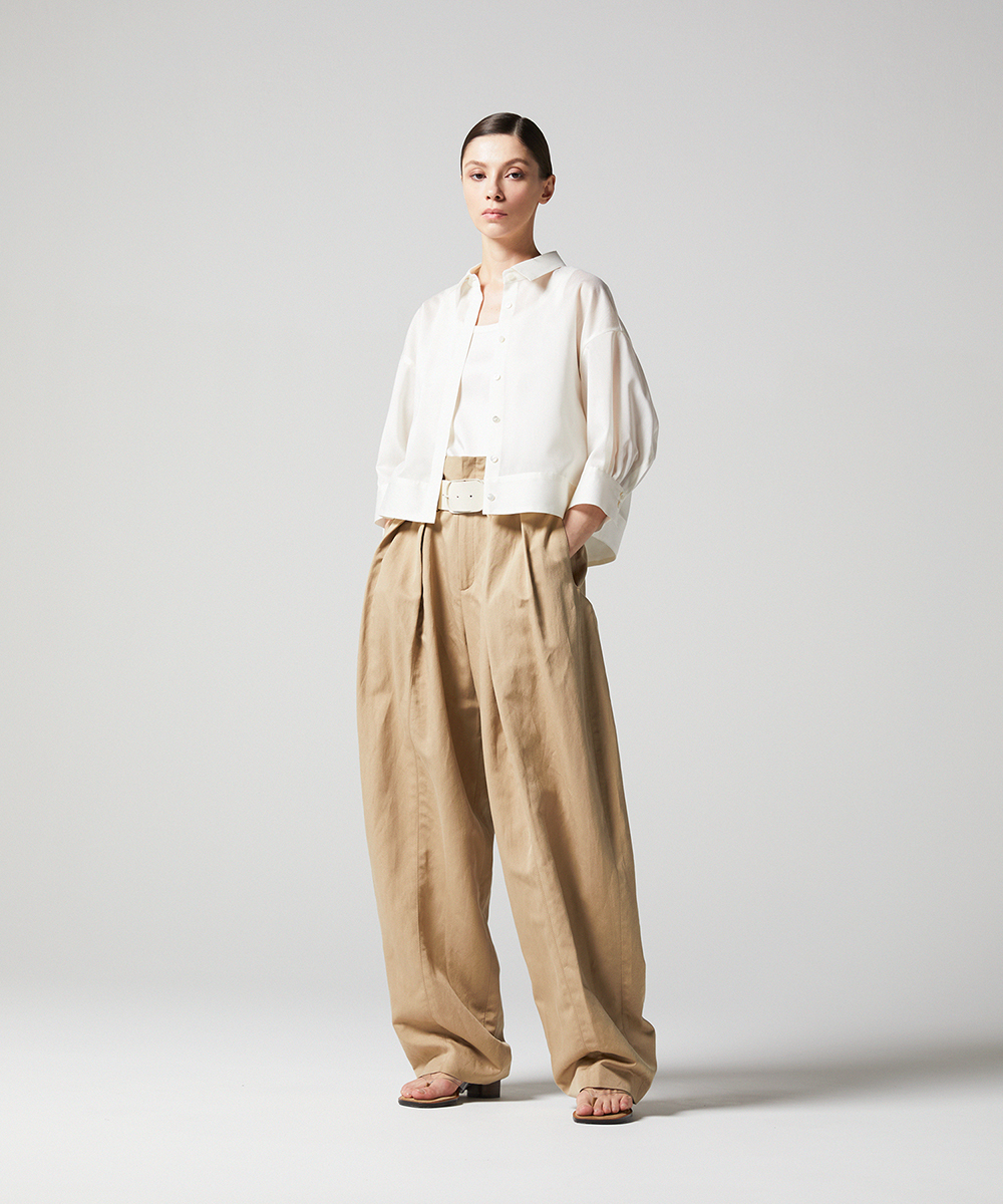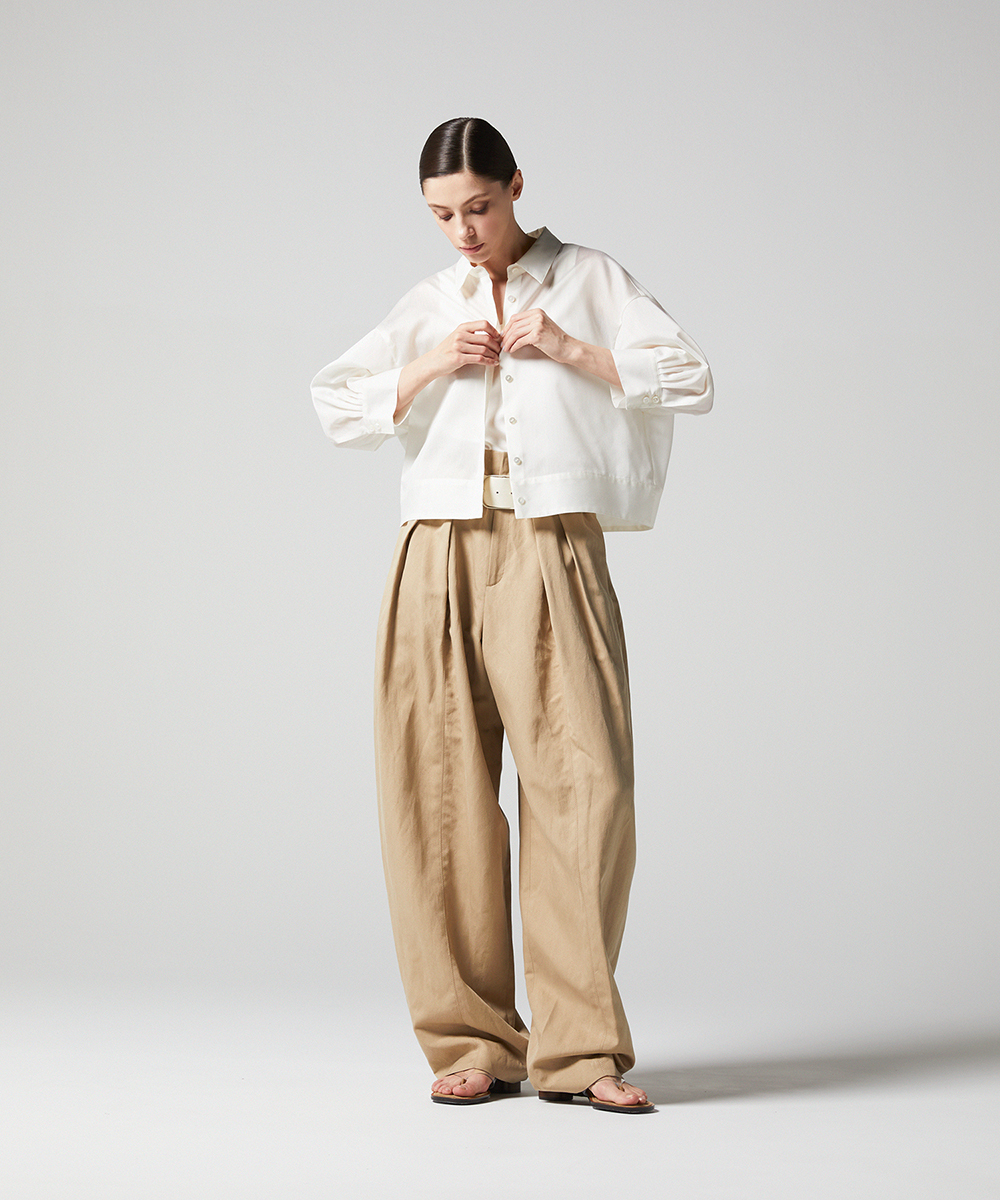 < EAUVIRE EXCLUSIVE >6分袖の短丈シャツ。ふくらみ・立体感のある後身頃が特徴的なデザインで、羽織りとしても使えるデザインシャツです。EAUVIREエクスクルーシヴの日本製生地。軽い透け感と凹凸感のある表情、程よいハリ感が特徴の見た目にも涼し気な素材です。横糸に極細のポリエステル糸と少し太めのレーヨン糸を交互に打ち込むことにより細かいストライプのような凹凸感が生まれ、それがさらりとした肌離れの良さにつながっています。同素材オープンカラーシャツ[FGBGD41450]もご用意いたしております。