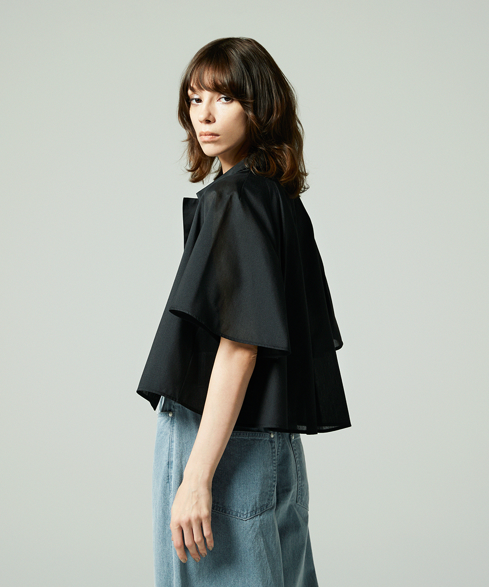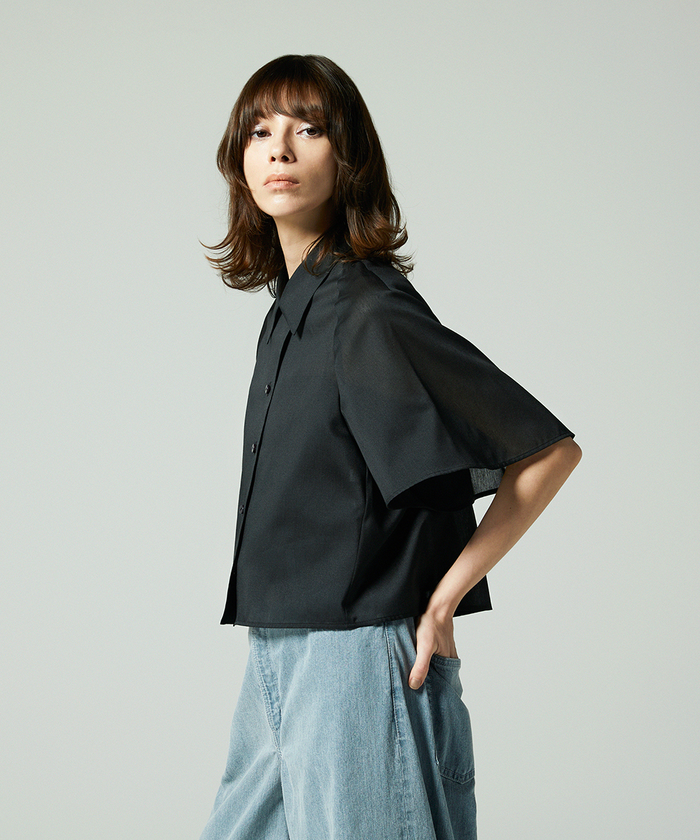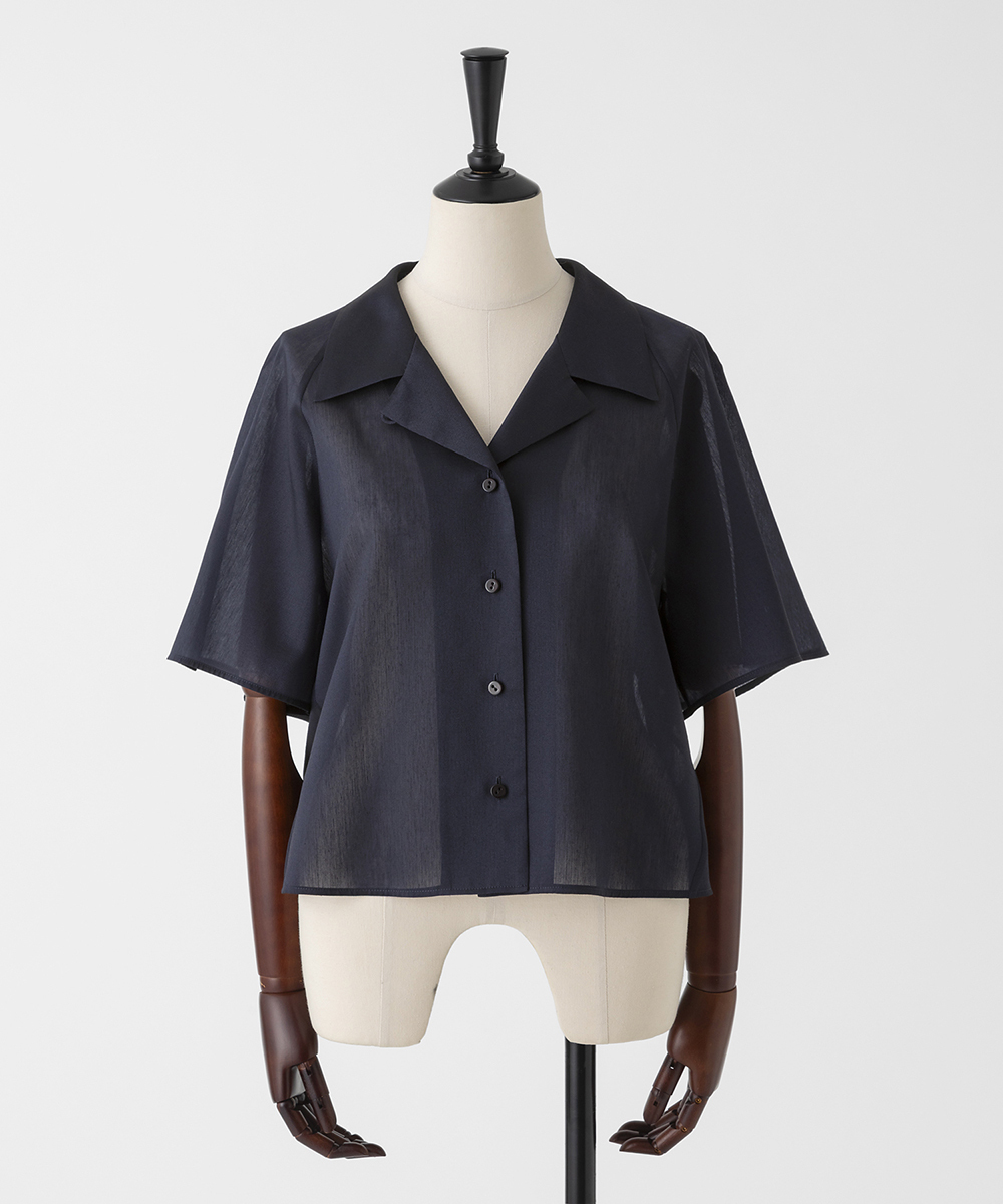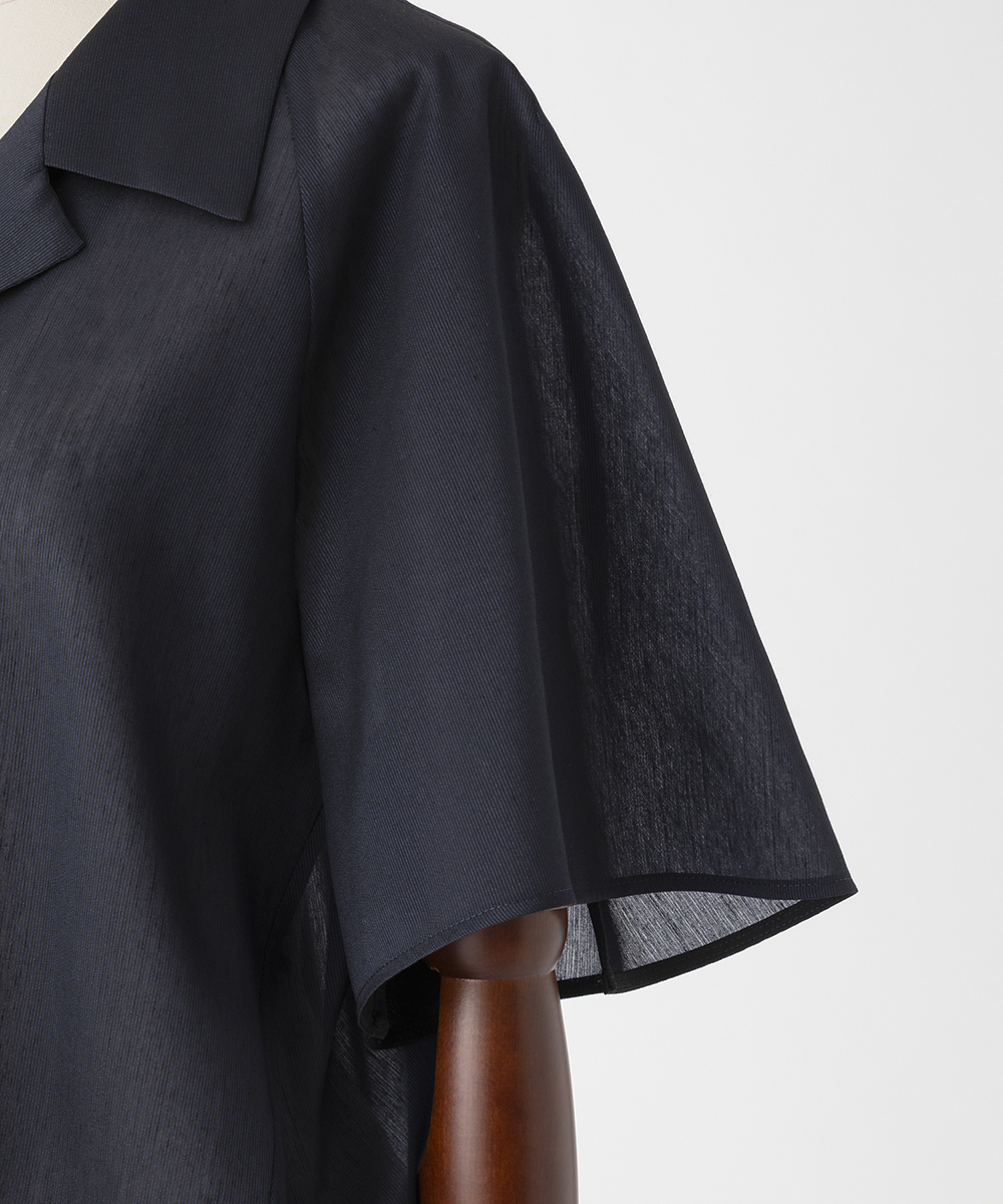< EAUVIRE EXCLUSIVE >短めの丈感が軽やかなオープンカラーシャツ。タックフレアで生み出した袖や後身頃は着用時に動きが生まれ軽やかな印象です。羽織としても着用できます。EAUVIREエクスクルーシヴの日本製生地。軽い透け感と凹凸感のある表情、程よいハリ感が特徴の見た目にも涼し気な素材です。横糸に極細のポリエステル糸と少し太めのレーヨン糸を交互に打ち込むことにより細かいストライプのような凹凸感が生まれ、それがさらりとした肌離れの良さにつながっています。同素材バックボリュームシャツ[FGBGD40580]もご用意いたしております。