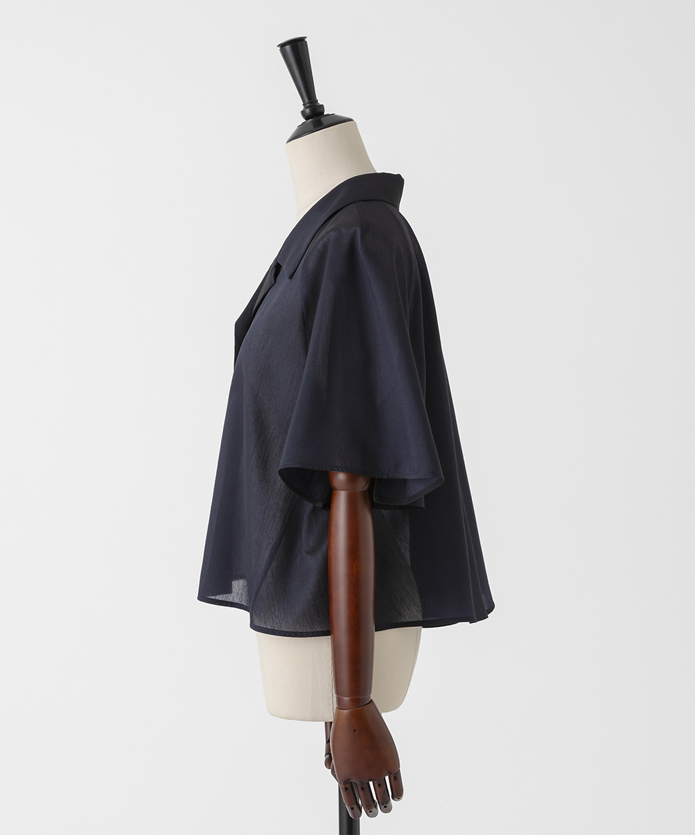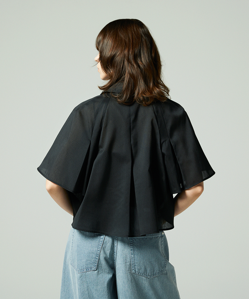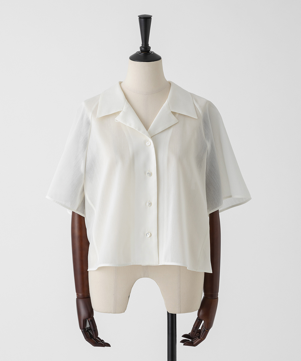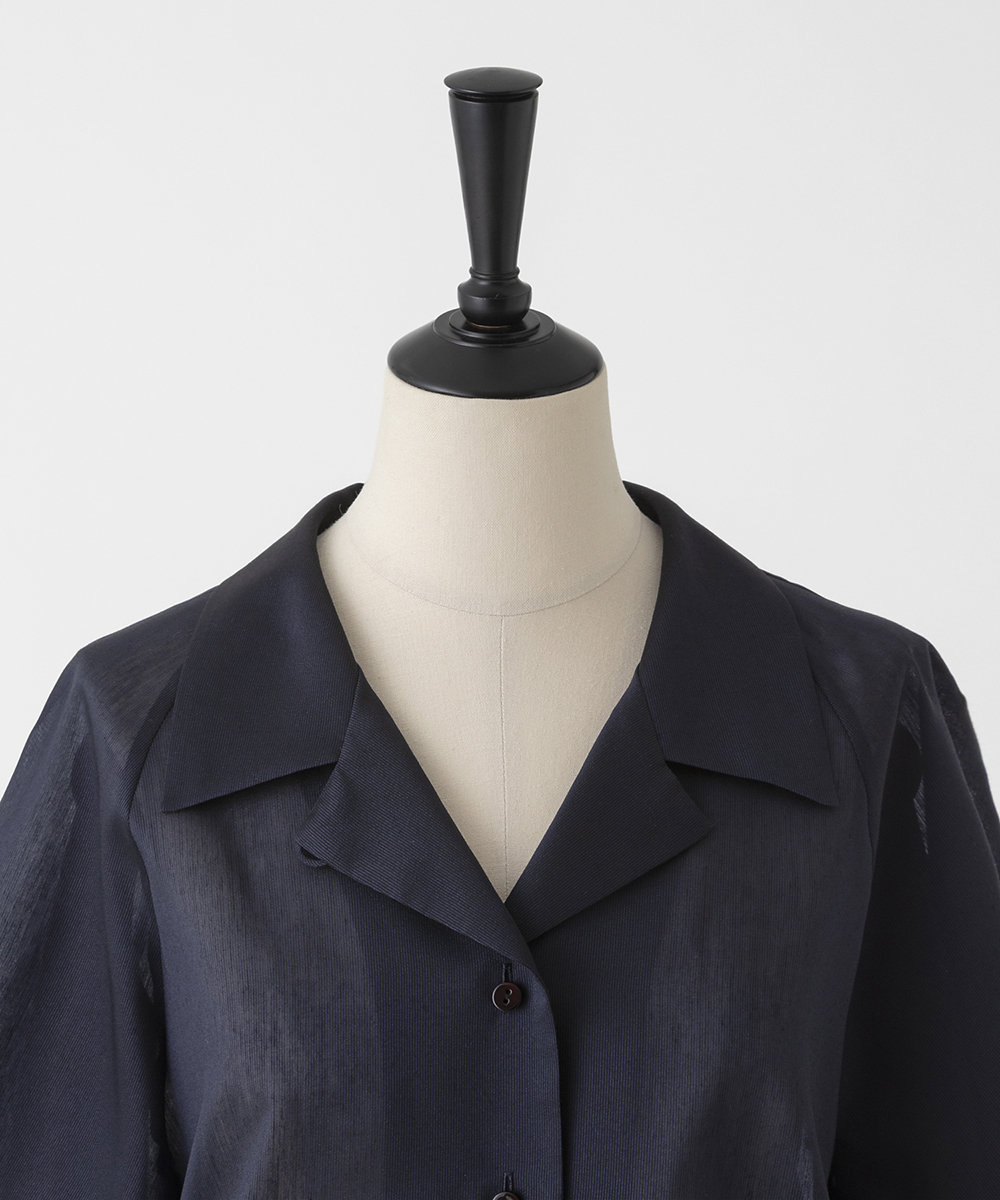 < EAUVIRE EXCLUSIVE >短めの丈感が軽やかなオープンカラーシャツ。タックフレアで生み出した袖や後身頃は着用時に動きが生まれ軽やかな印象です。羽織としても着用できます。EAUVIREエクスクルーシヴの日本製生地。軽い透け感と凹凸感のある表情、程よいハリ感が特徴の見た目にも涼し気な素材です。横糸に極細のポリエステル糸と少し太めのレーヨン糸を交互に打ち込むことにより細かいストライプのような凹凸感が生まれ、それがさらりとした肌離れの良さにつながっています。同素材バックボリュームシャツ[FGBGD40580]もご用意いたしております。
