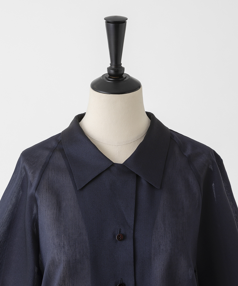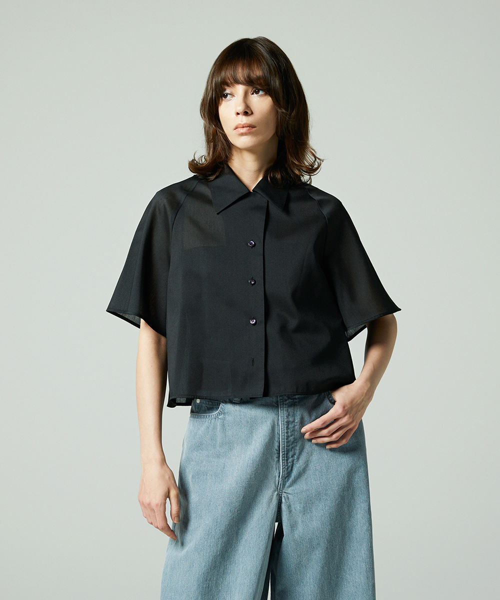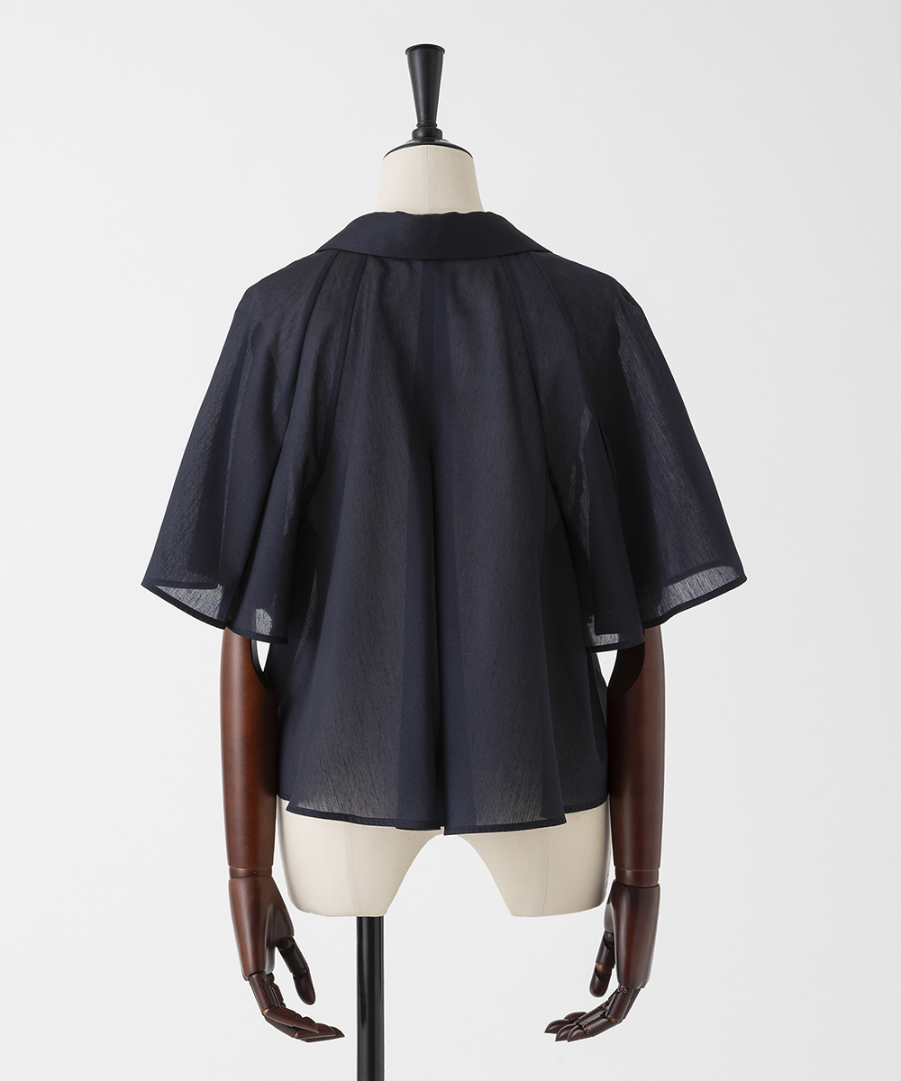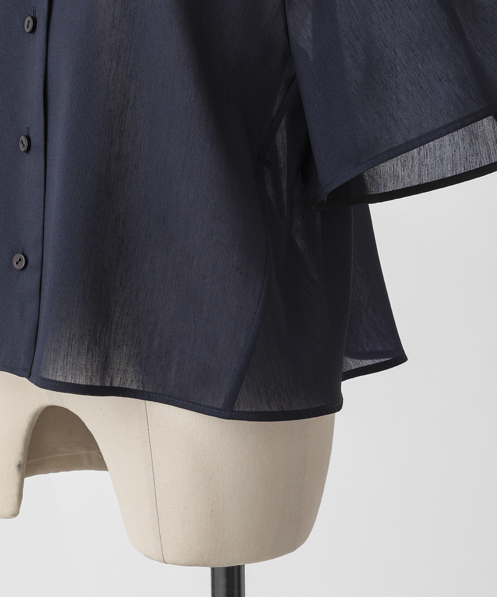 < EAUVIRE EXCLUSIVE >短めの丈感が軽やかなオープンカラーシャツ。タックフレアで生み出した袖や後身頃は着用時に動きが生まれ軽やかな印象です。羽織としても着用できます。EAUVIREエクスクルーシヴの日本製生地。軽い透け感と凹凸感のある表情、程よいハリ感が特徴の見た目にも涼し気な素材です。横糸に極細のポリエステル糸と少し太めのレーヨン糸を交互に打ち込むことにより細かいストライプのような凹凸感が生まれ、それがさらりとした肌離れの良さにつながっています。同素材バックボリュームシャツ[FGBGD40580]もご用意いたしております。