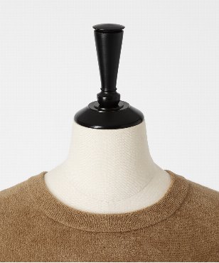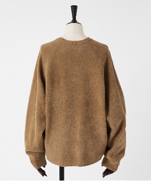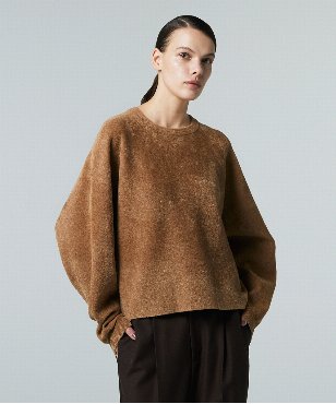 構築的な立体フォルムに仕立てたスタイリッシュなクルーネックのプルオーバー。スウェードのような見た目に反して、ストレッチ性が良く着心地の良いアイテムです。特別に紡績されたイタリア糸を使用し、編み目を極力詰め、緻密に編み立てることでスウェードの様なマットな起毛感のある素材に編み上げました。しっかりとしたハリ感とストレッチ感を持つ滑らかな素材です。