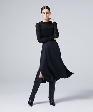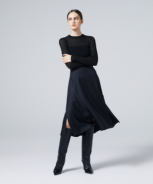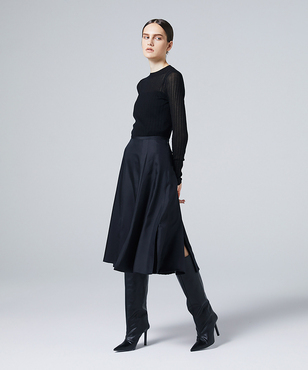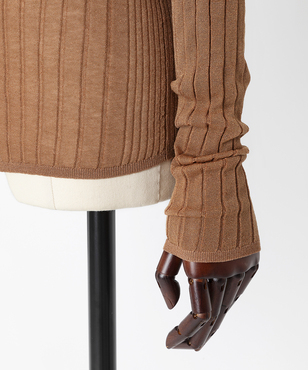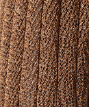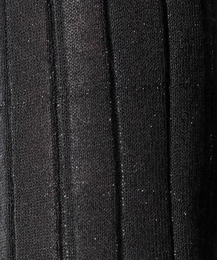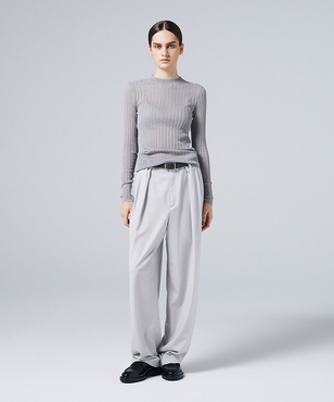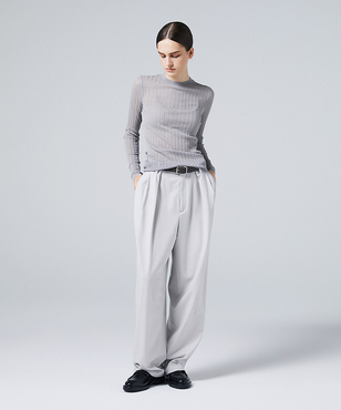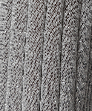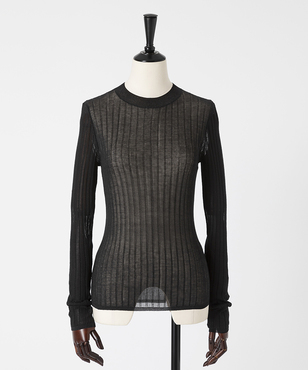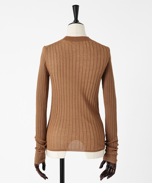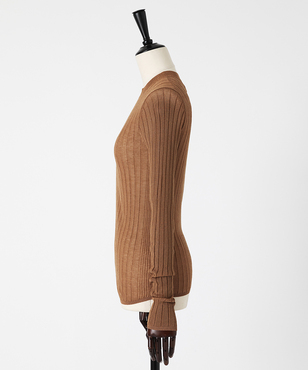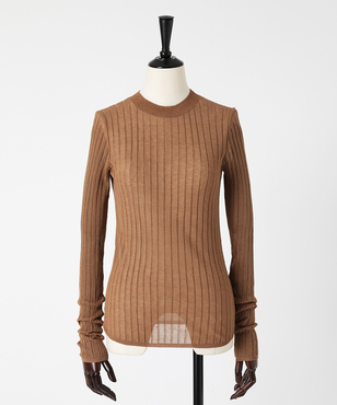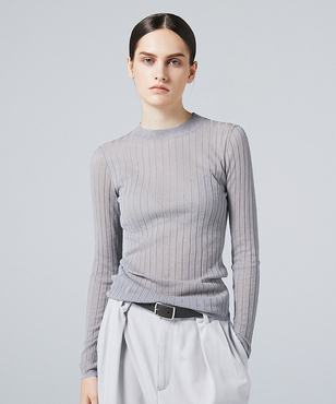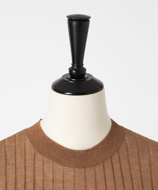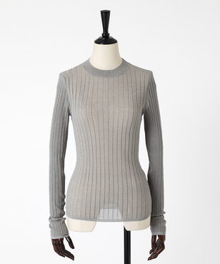 上品なラメの光沢をもつシアーなワイドリブのクルーネックプルオーバー。伸縮のあるソフトな素材に編み上げることで、フィット感が心地よいストレスフリーな着用感。立体的に編み上げるテクニックで着用時のフォルムを美しく見せる細見え効果のあるデザインです。上質なオーガニックコットンの極細綿糸に繊細なラメをブレンドしたイタリア紡績糸を使用しています。非常に軽く柔らかい質感に加え、ストレッチの効いた透け感のあるリブ編みのニットです。