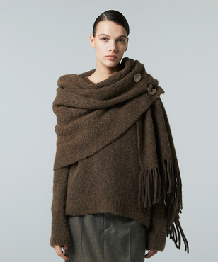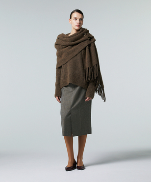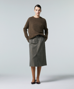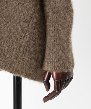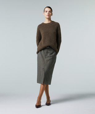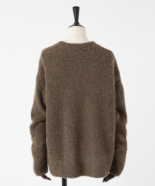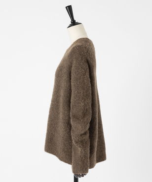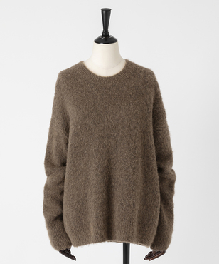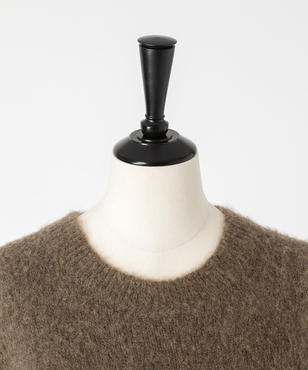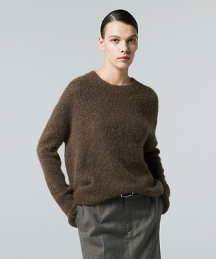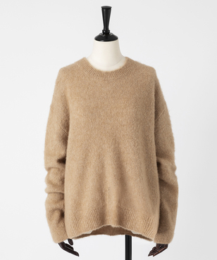 ゆとりのあるシルエット、多様な着こなしに映えるシンプルなデザインのクルーネックプルオーバー。ソフトで膨らみのあるベビーキャメルに極細繊維のスーパーファインウールをブレンドし、ストレッチ性のある糸に仕上げたイタリア糸を使用。エアリーで優しい質感のニット素材です。同素材ファインキャメルストール[FG3AA29710]とスタイリング可能です。