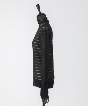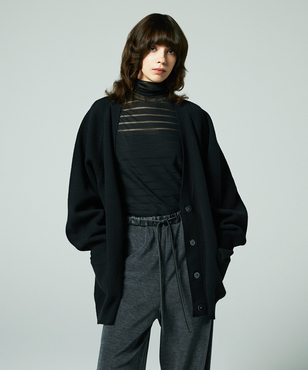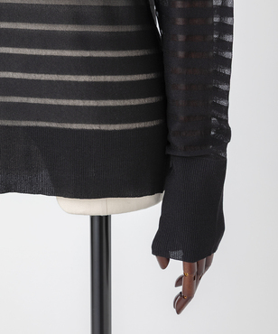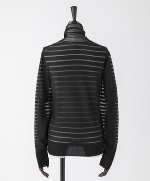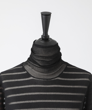 上質な極細シルクの糸を編み地変化で透け感のあるシアーボーダーに仕上げています。身頃と袖のボーダーピッチを敢えて変えることで、シンプルなタートルネックでも柄変化のあるデザイントップスとなっています。インナーにも一枚着としても汎用性のある一枚です。イタリア製、高級ラグジュアリーラインの中のロングセラー素材の一つ。繭玉からとれる1本の連続した繊維(フィラメントシルク)が原料。スパンシルクよりもハリと艶のある上質なシルクを使用しています。