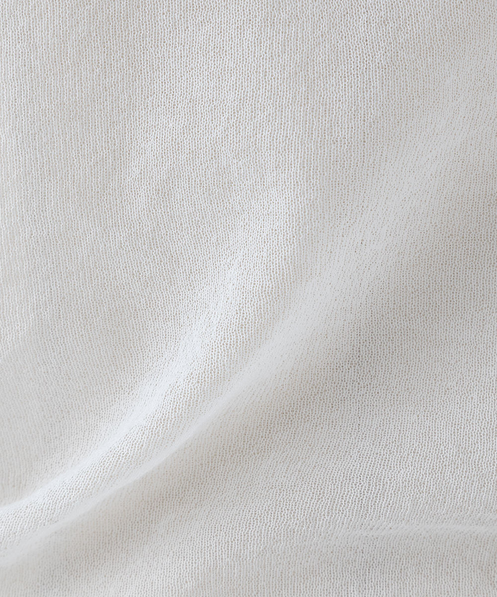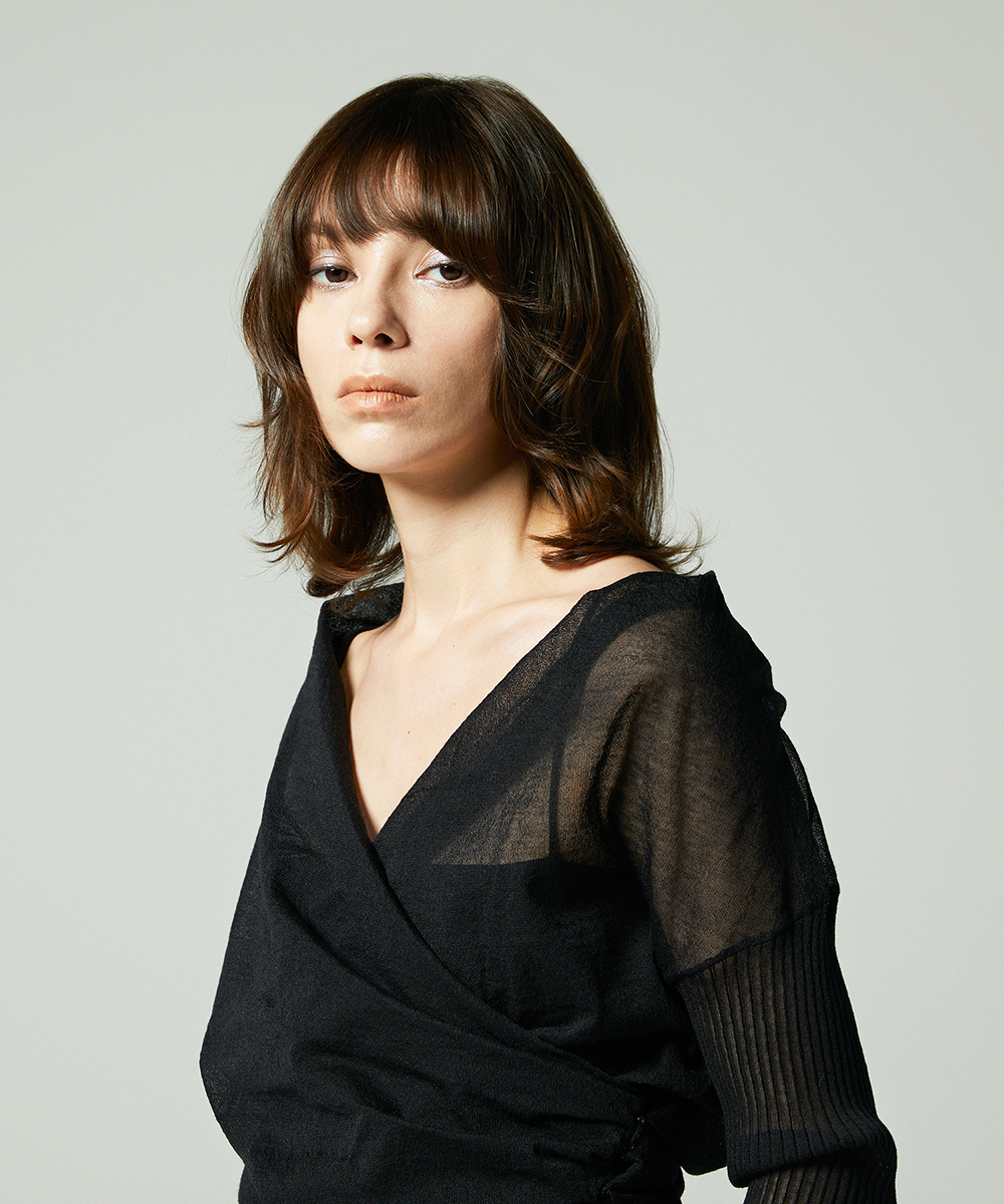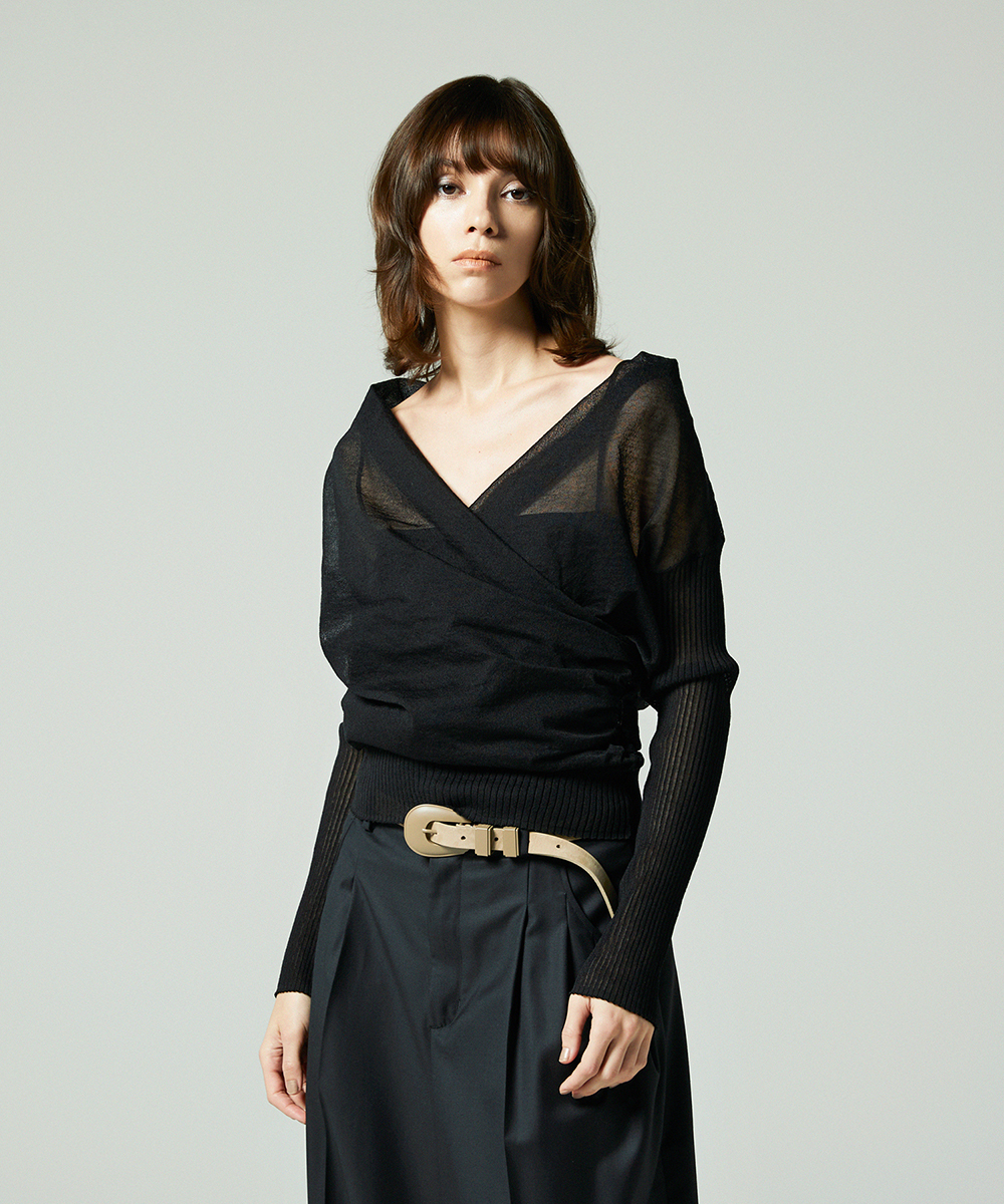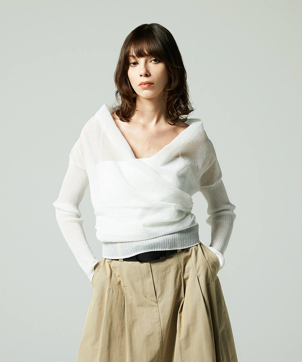 衿開きのニュアンスが大人の女性らしさを演出するカシュクールプルオーバーニット。袖はリブ編みでフィットさせメリハリのあるデザインに仕上げています。インナーにはキャミソールを合わせるのがおすすめ。日本製の糸を使用。麻とポリエステルを組み合わせた素材です。ポリエステルを高い割合で組み合わせたことにより編み地にした時に1本取りでもドライで清涼感のあるタッチに加えハリ感を出しています。