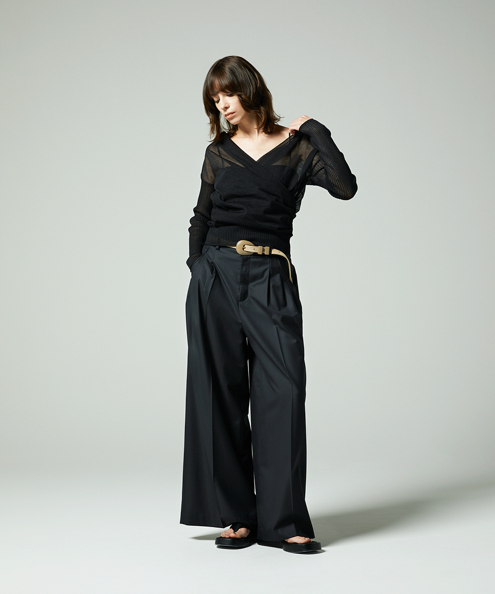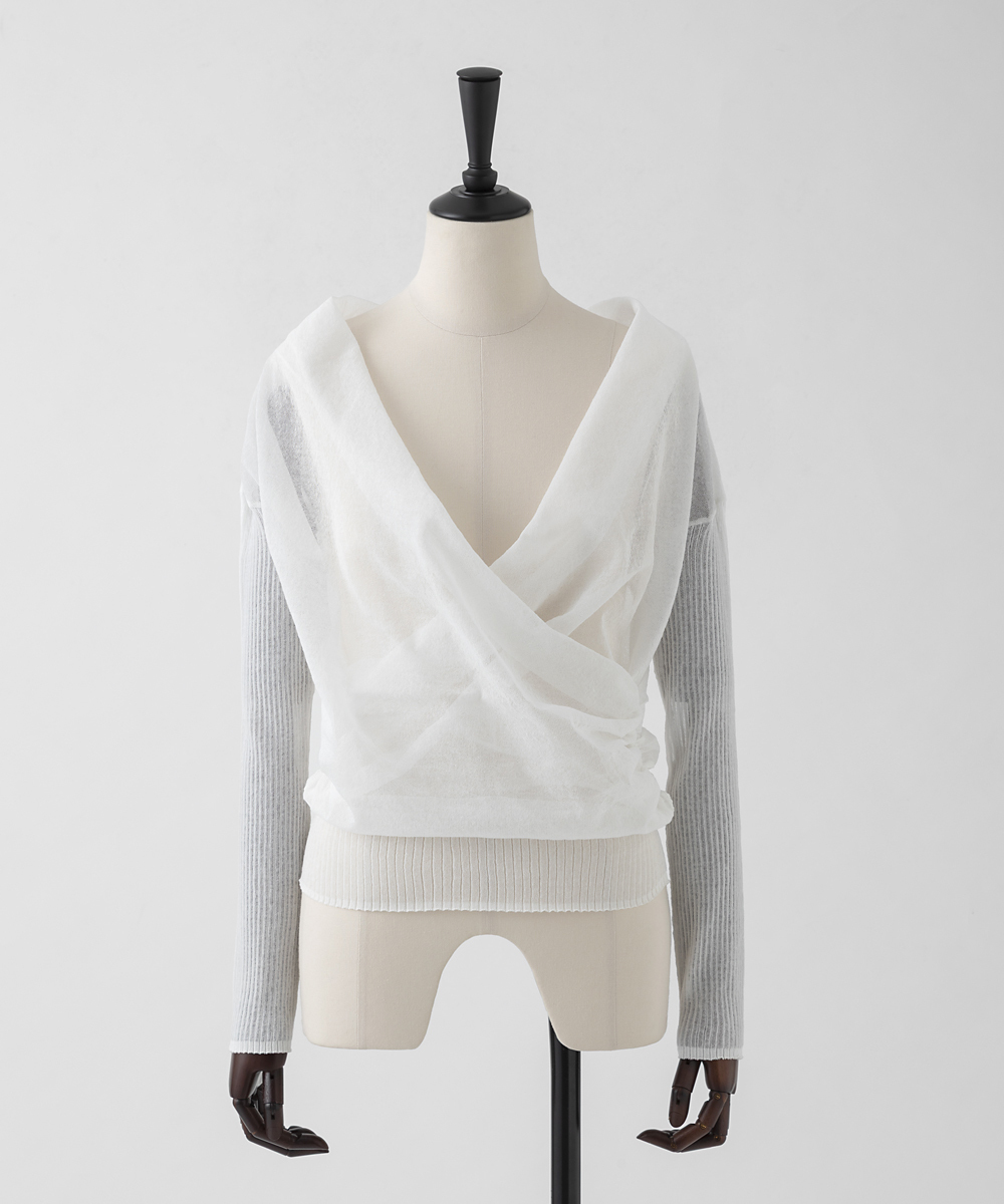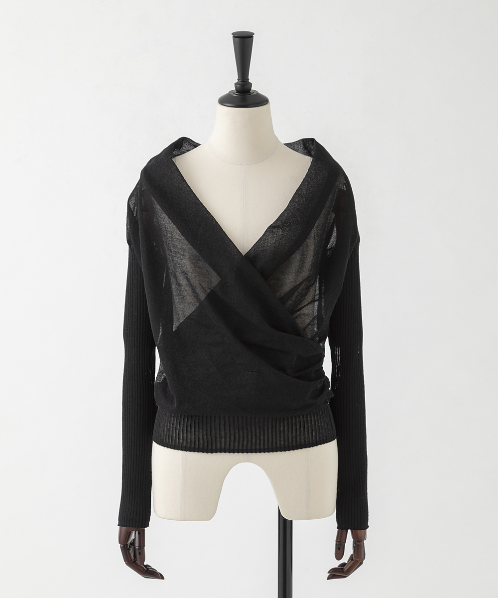 衿開きのニュアンスが大人の女性らしさを演出するカシュクールプルオーバーニット。袖はリブ編みでフィットさせメリハリのあるデザインに仕上げています。インナーにはキャミソールを合わせるのがおすすめ。日本製の糸を使用。麻とポリエステルを組み合わせた素材です。ポリエステルを高い割合で組み合わせたことにより編み地にした時に1本取りでもドライで清涼感のあるタッチに加えハリ感を出しています。