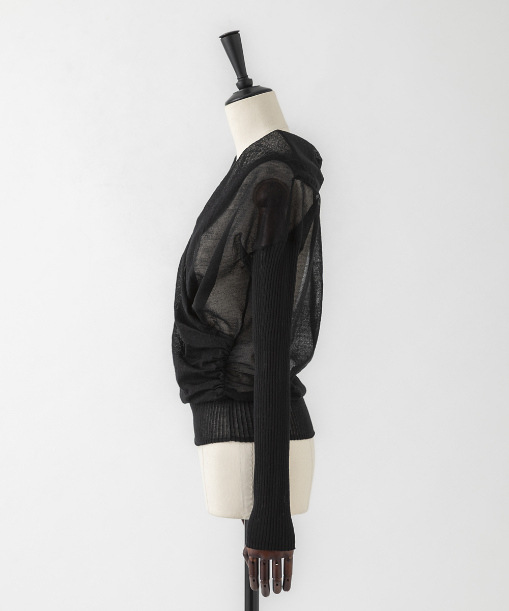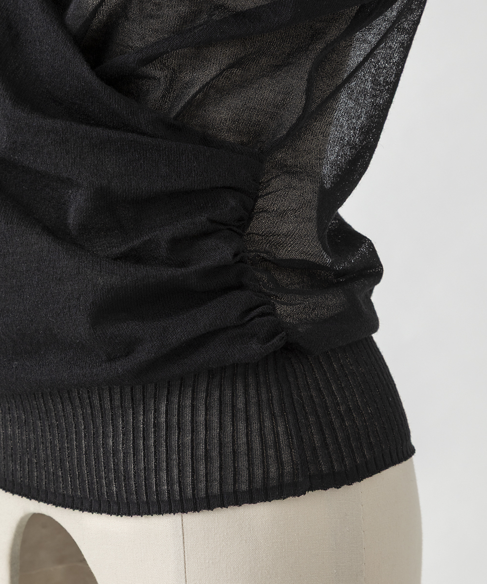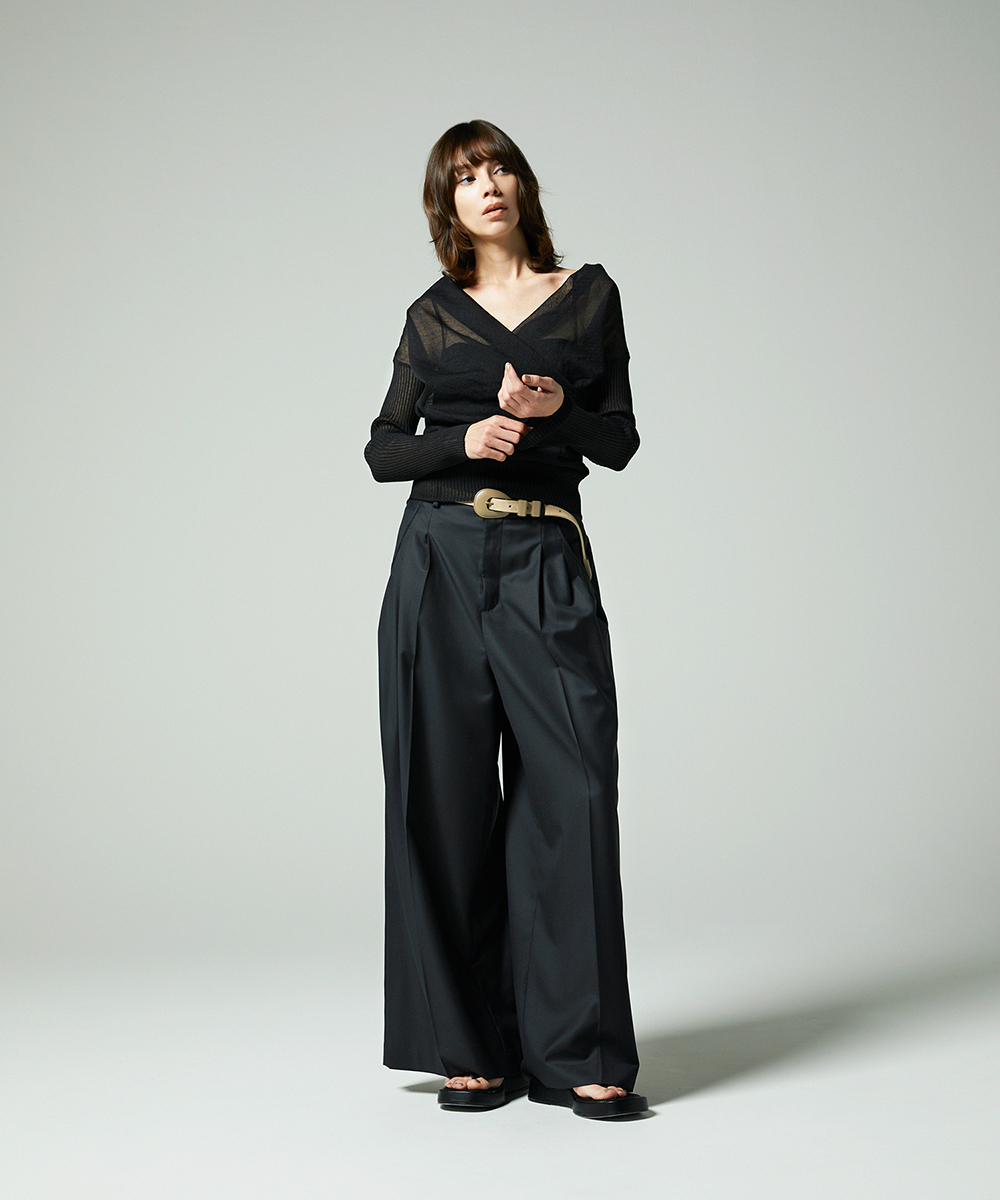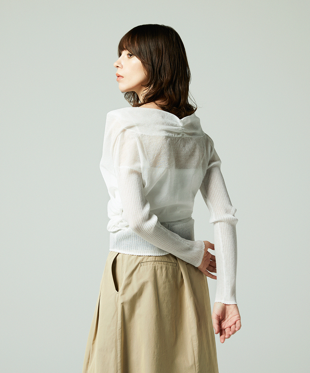 衿開きのニュアンスが大人の女性らしさを演出するカシュクールプルオーバーニット。袖はリブ編みでフィットさせメリハリのあるデザインに仕上げています。インナーにはキャミソールを合わせるのがおすすめ。日本製の糸を使用。麻とポリエステルを組み合わせた素材です。ポリエステルを高い割合で組み合わせたことにより編み地にした時に1本取りでもドライで清涼感のあるタッチに加えハリ感を出しています。