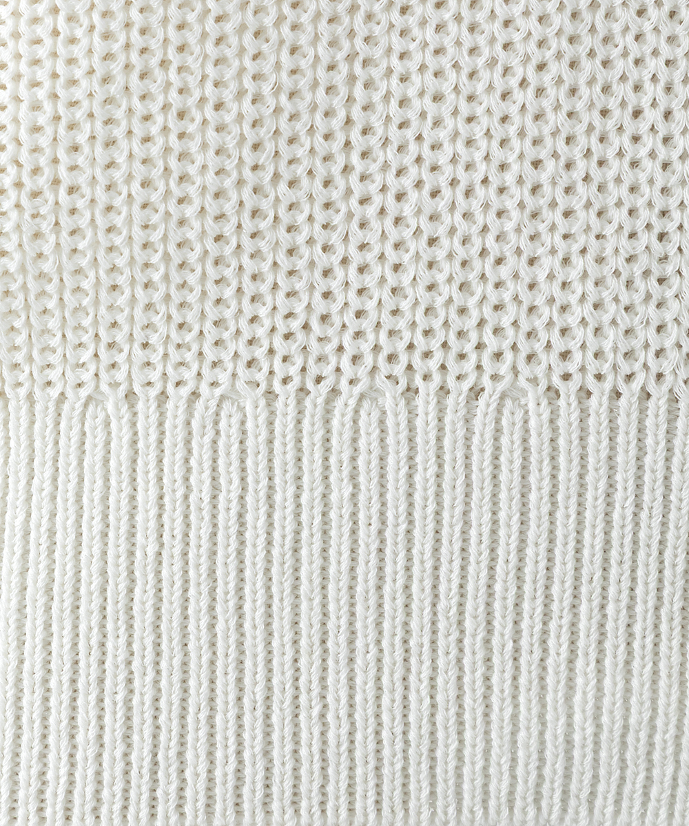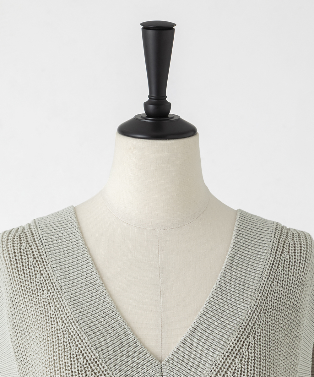 5ゲージ畦編みの程よい厚みのあるVネックベスト。春はシャツの上に重ね着できて、盛夏は1枚着でも可能なコーディネートバリエーションの広いアイテム。日本製糸超⾧綿と麻の混紡糸にポリエステルを撚糸した素材。毛羽の少ない綺麗な目面で、清涼感のあるさらっとした風合いで盛夏にも着用できます。ポリエステルを合わせたことでシワになりにくく、縮率も安定し手洗いが可能になりました。同素材のシリーズでコットンリネンニットタンク[FGFGD11490]・コットンリネンカーディガン[FGSGD10590]・コットンリネンVネックベスト[FGFGD10490]をご用意いたしております。