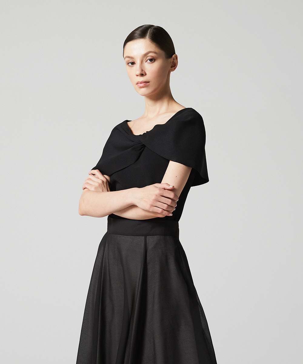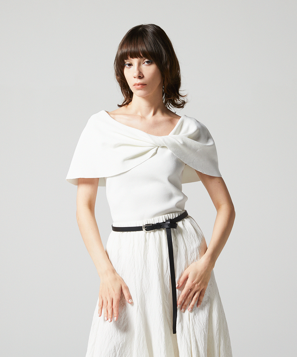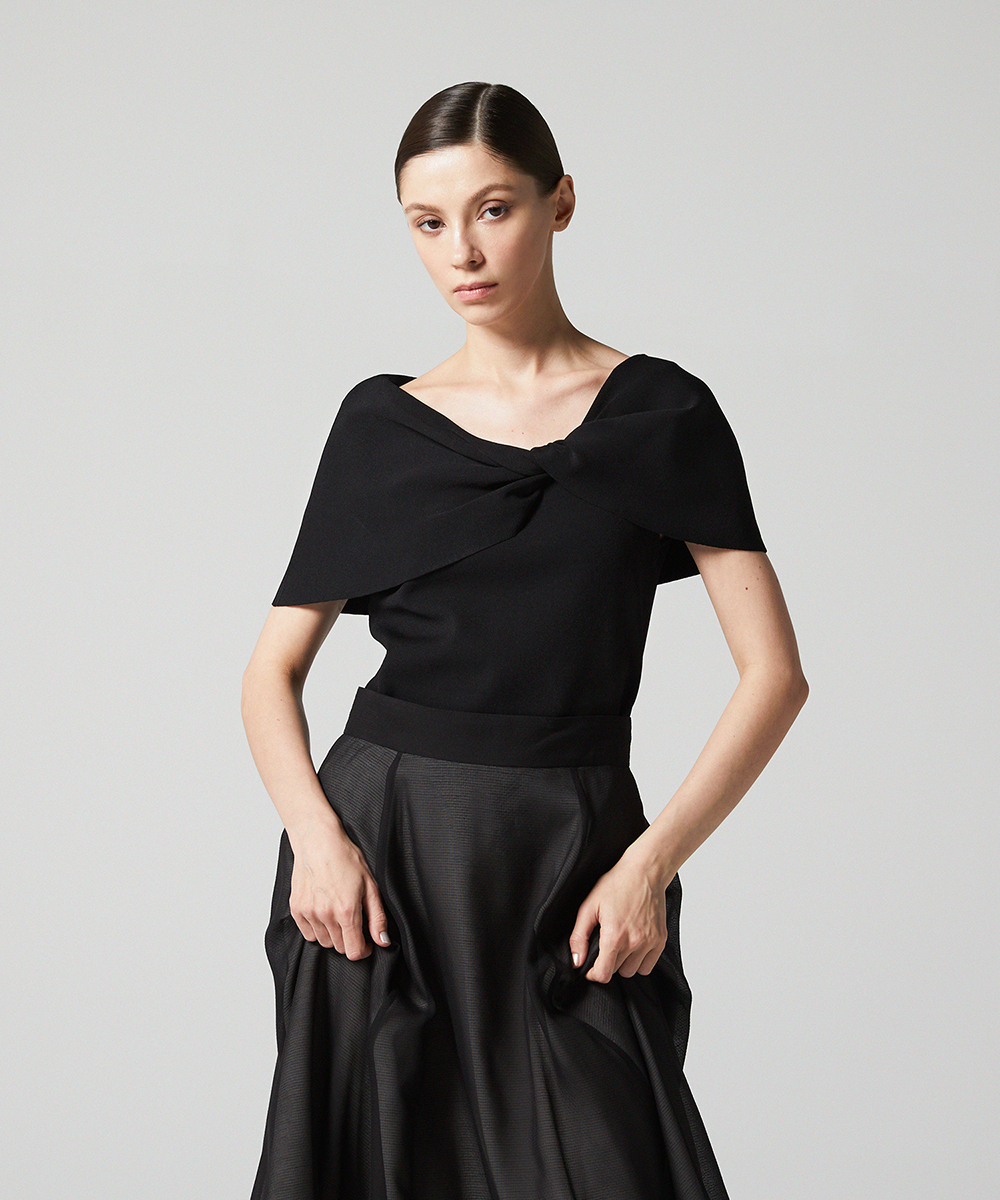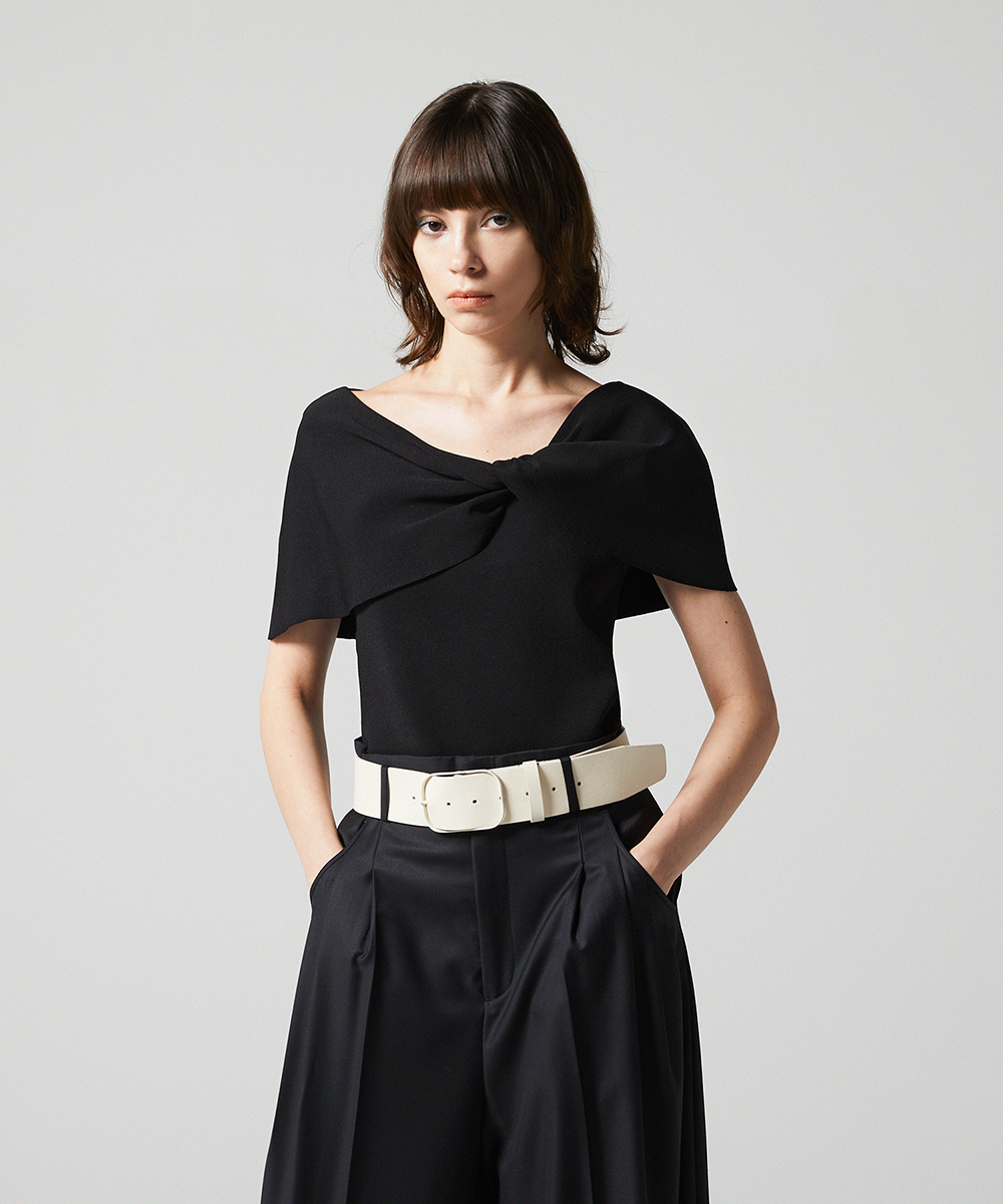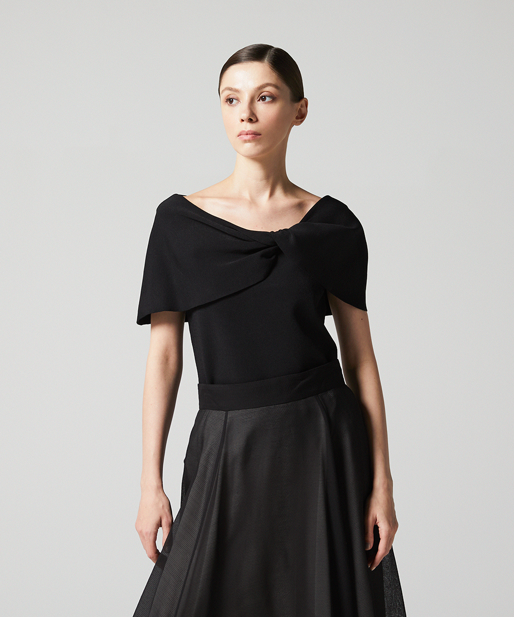 滑らかにハリのある18Gスムース編みで肩や二の腕を包み込むケープのデザインです。昨年好評だったケーププルオーバーから衿元にツイストディテールを加え新たなケープデザインにバーションアップしました。レーヨン糸とストレッチナイロンをミックスした国内紡績糸を使用。コンパクトでドライな質感が特徴で、綺麗なシルエットを保つキックバックの優れた素材です。