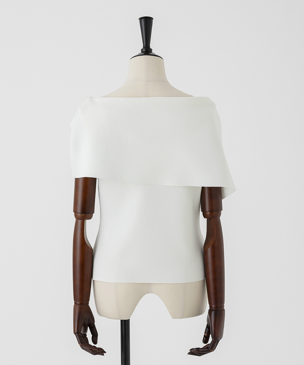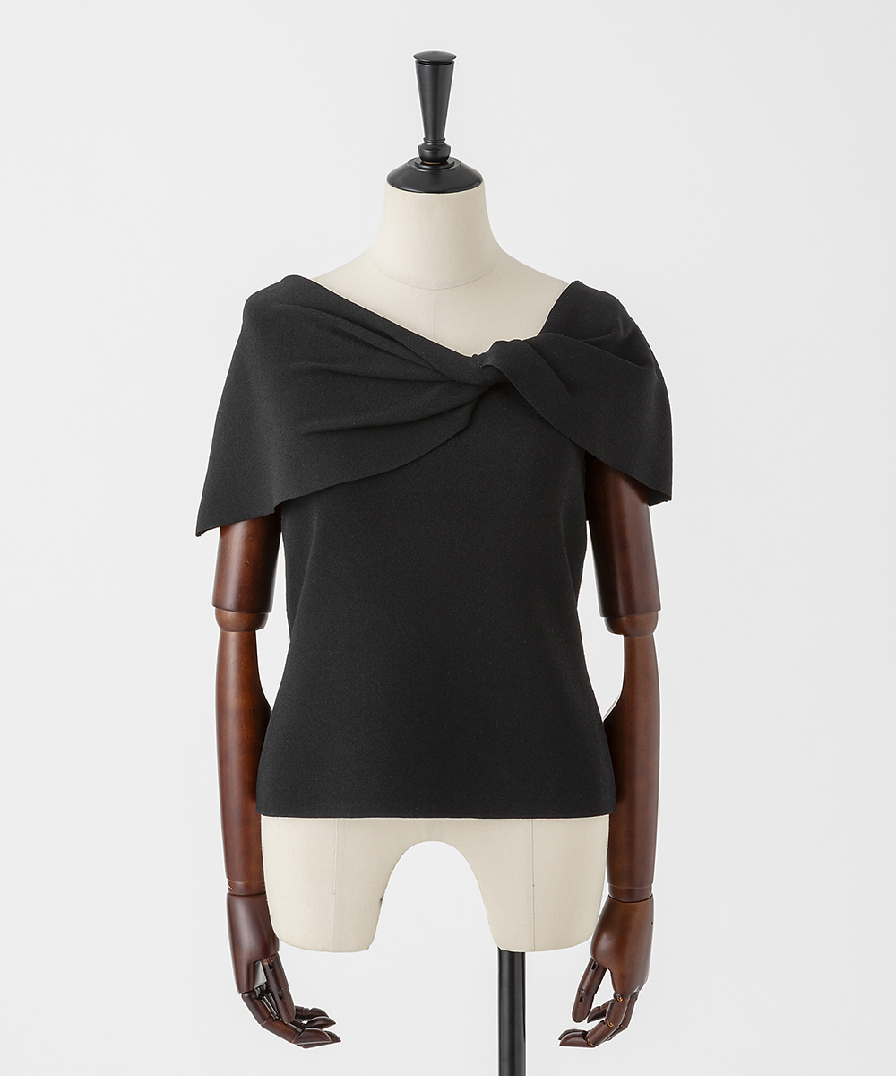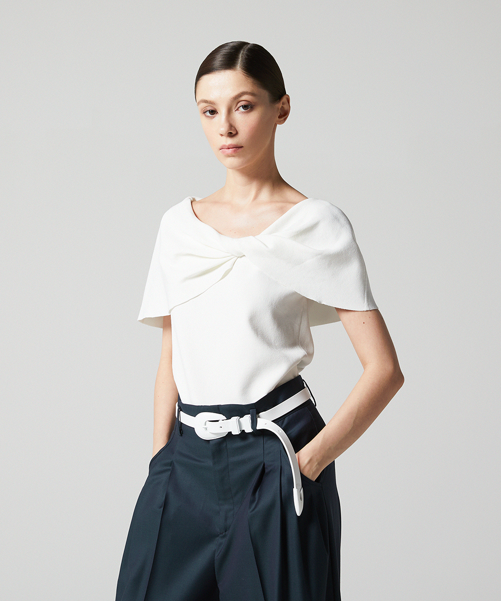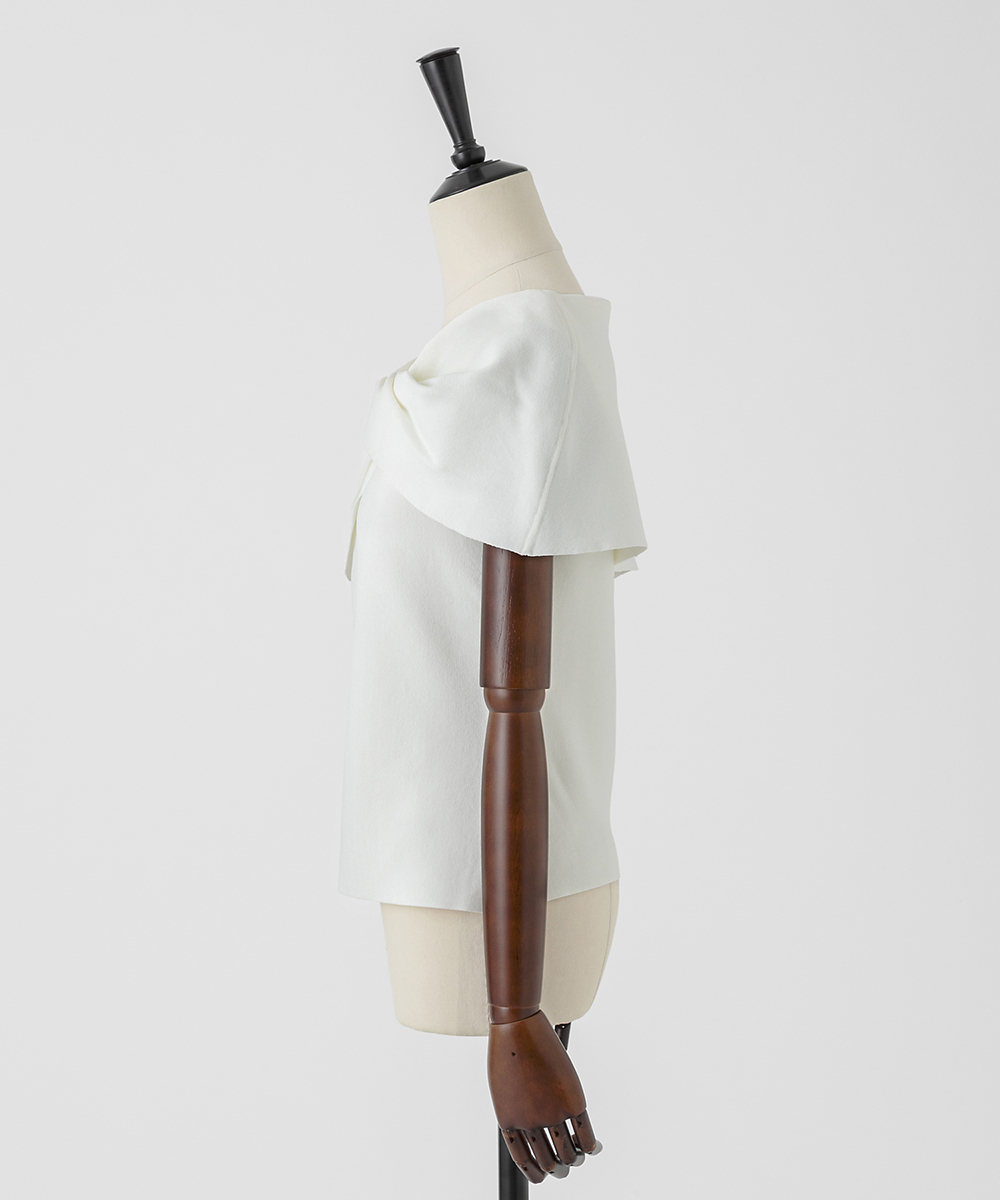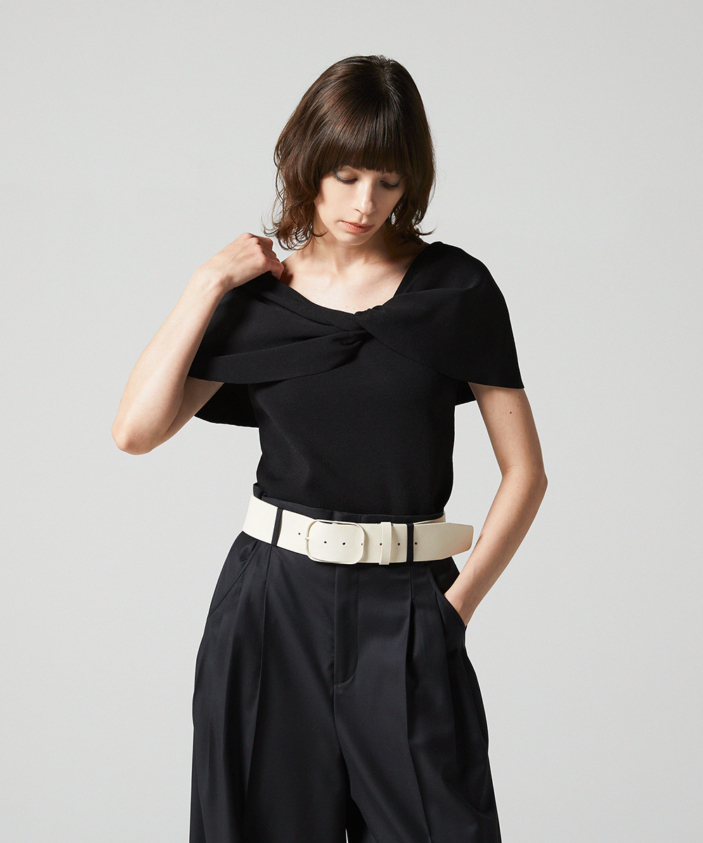 滑らかにハリのある18Gスムース編みで肩や二の腕を包み込むケープのデザインです。昨年好評だったケーププルオーバーから衿元にツイストディテールを加え新たなケープデザインにバーションアップしました。レーヨン糸とストレッチナイロンをミックスした国内紡績糸を使用。コンパクトでドライな質感が特徴で、綺麗なシルエットを保つキックバックの優れた素材です。