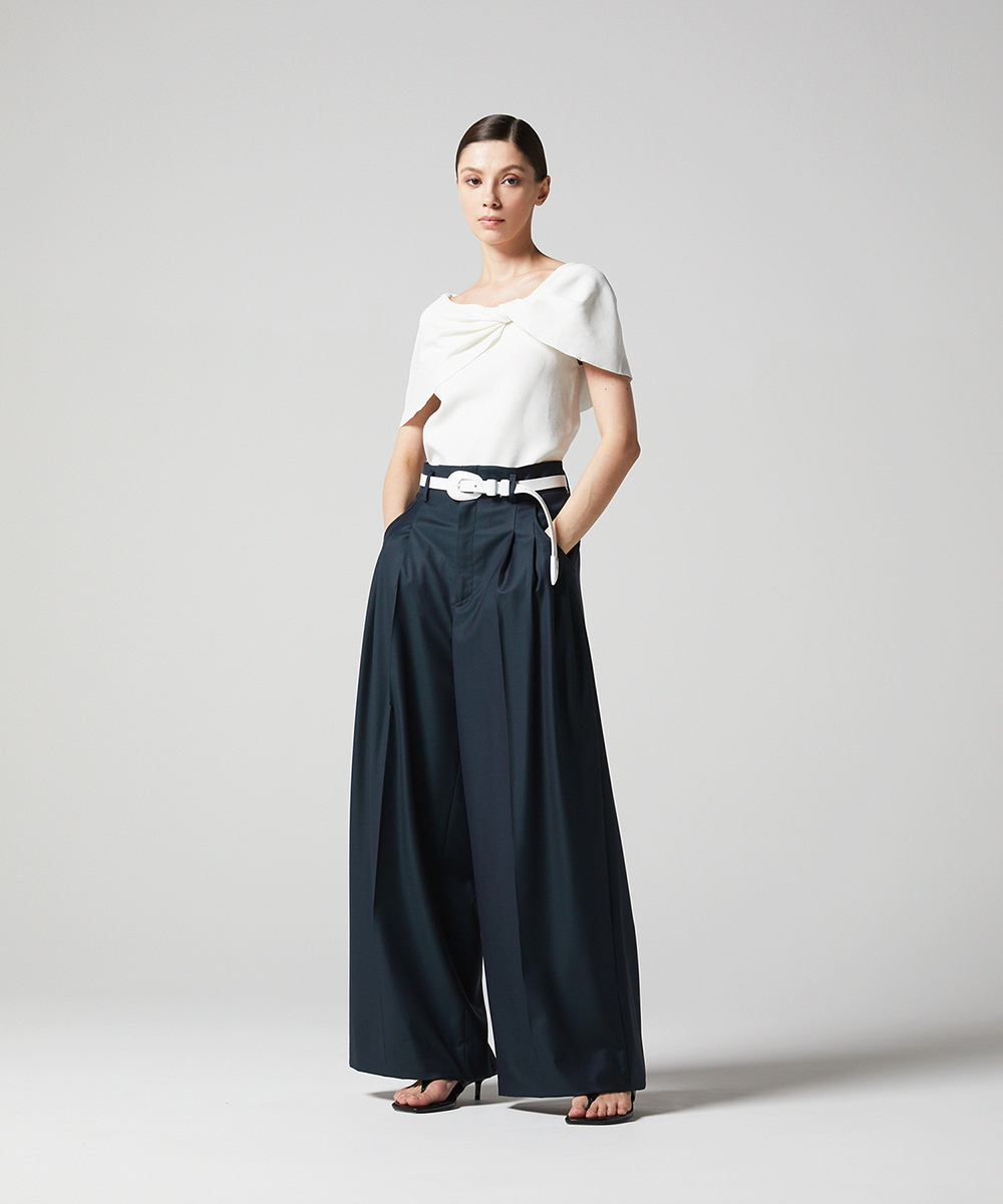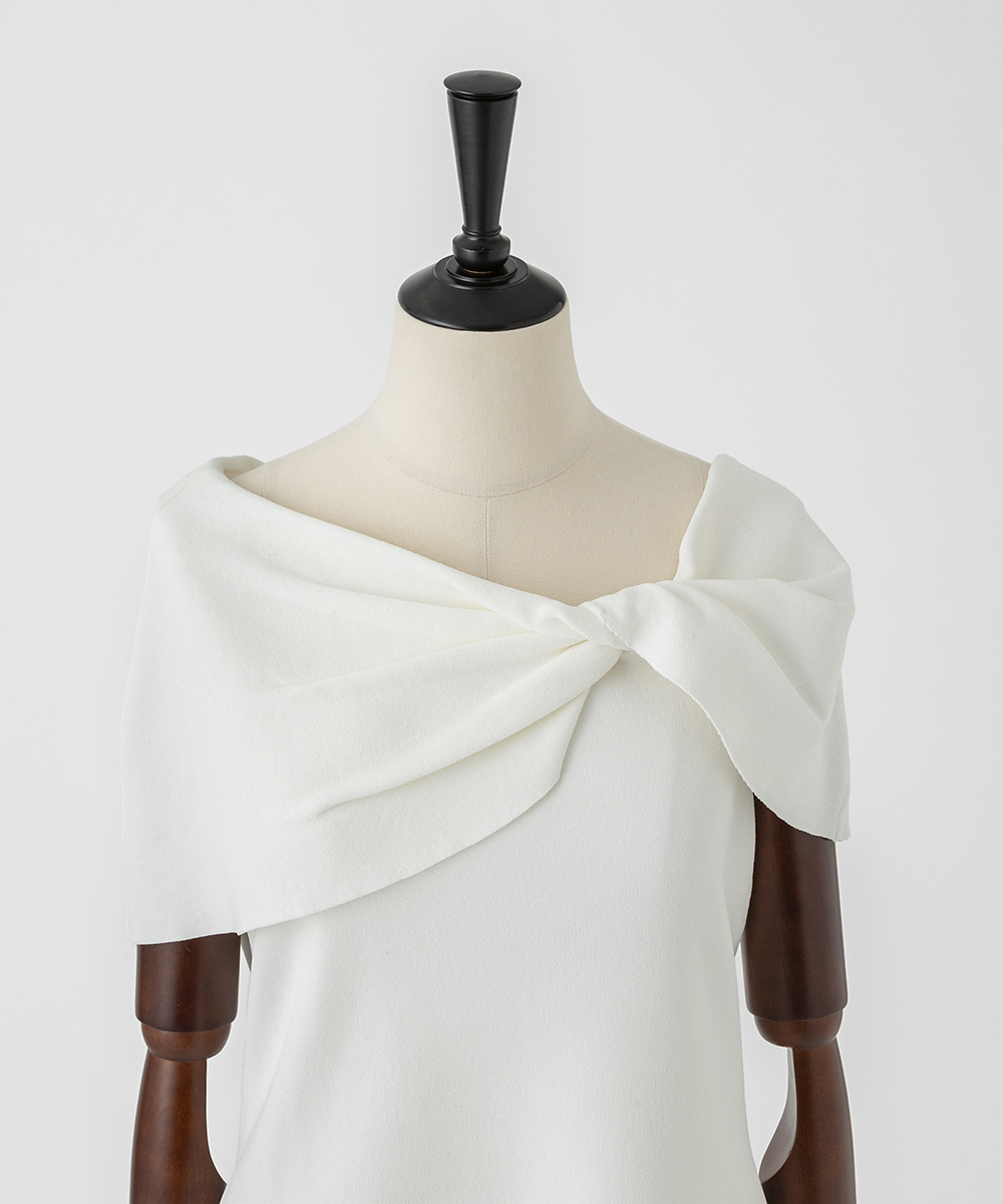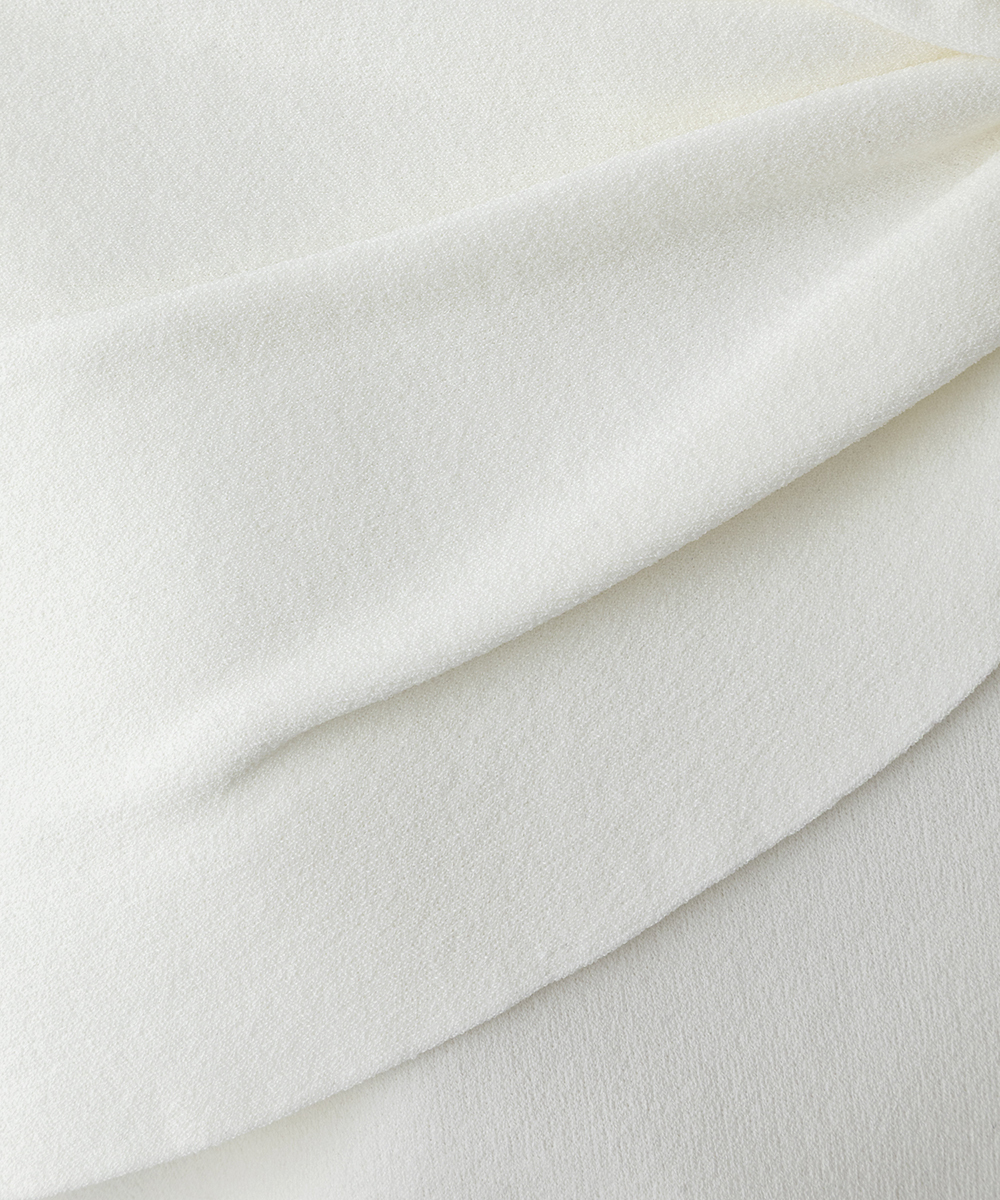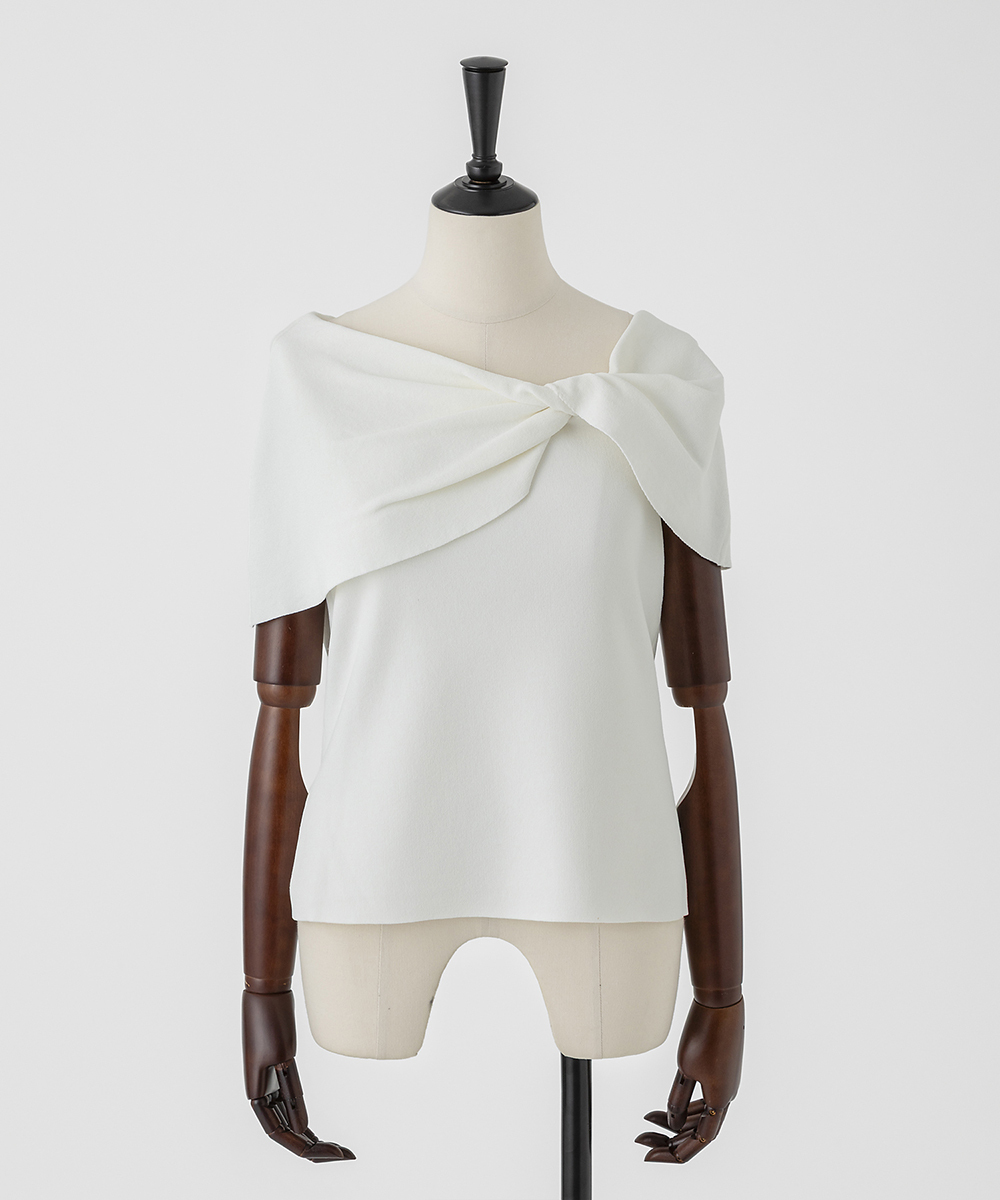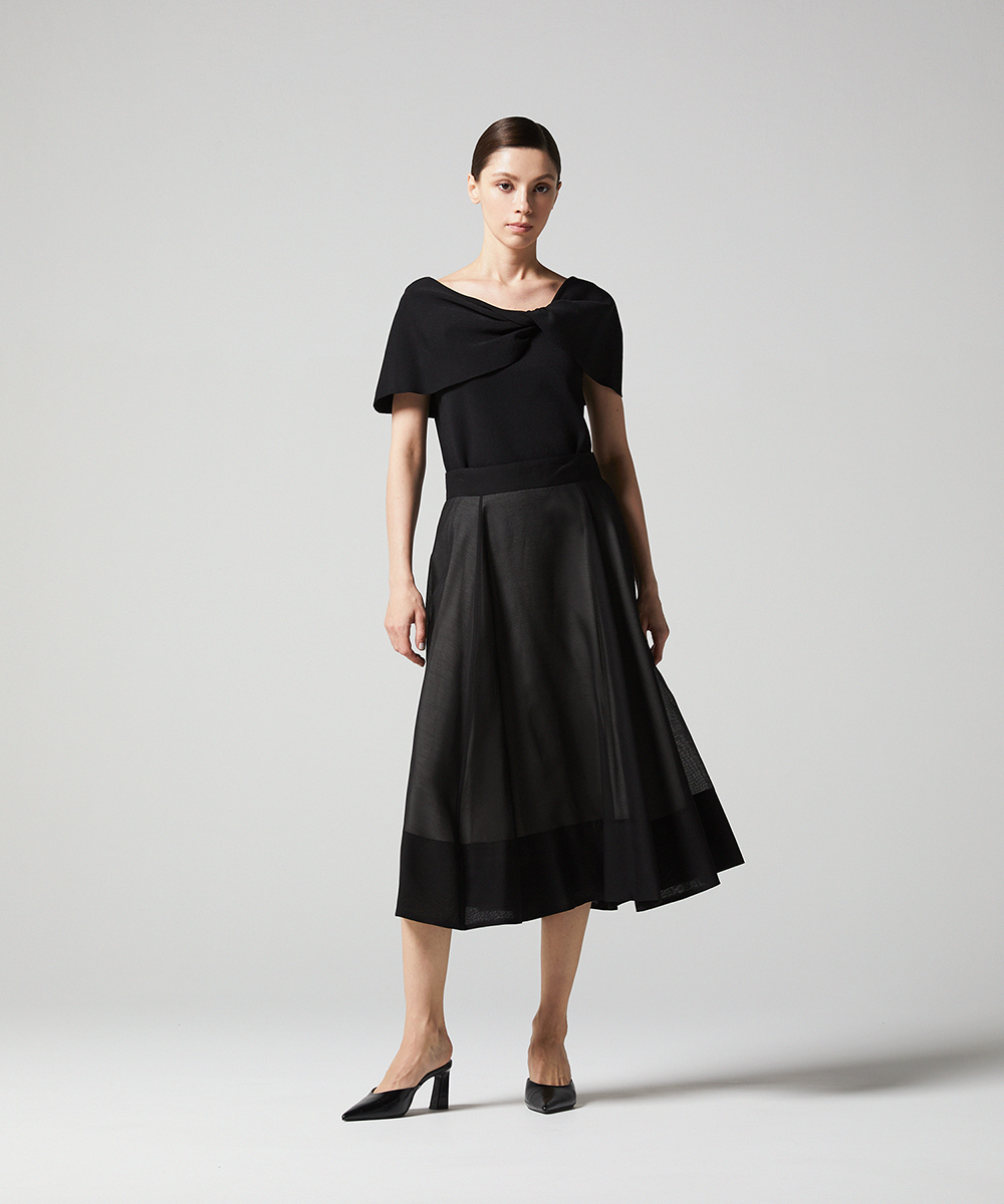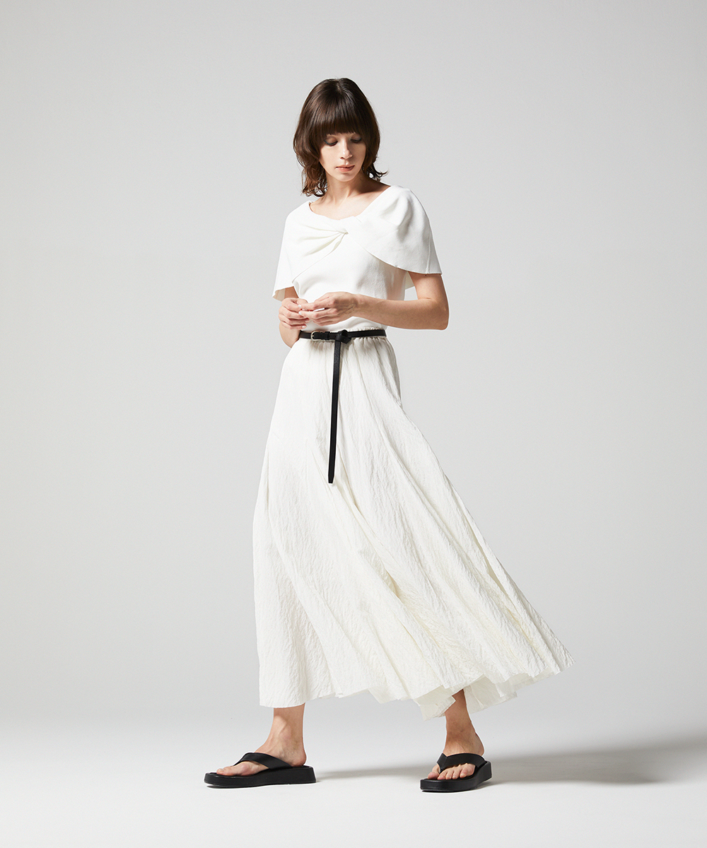 滑らかにハリのある18Gスムース編みで肩や二の腕を包み込むケープのデザインです。昨年好評だったケーププルオーバーから衿元にツイストディテールを加え新たなケープデザインにバーションアップしました。レーヨン糸とストレッチナイロンをミックスした国内紡績糸を使用。コンパクトでドライな質感が特徴で、綺麗なシルエットを保つキックバックの優れた素材です。