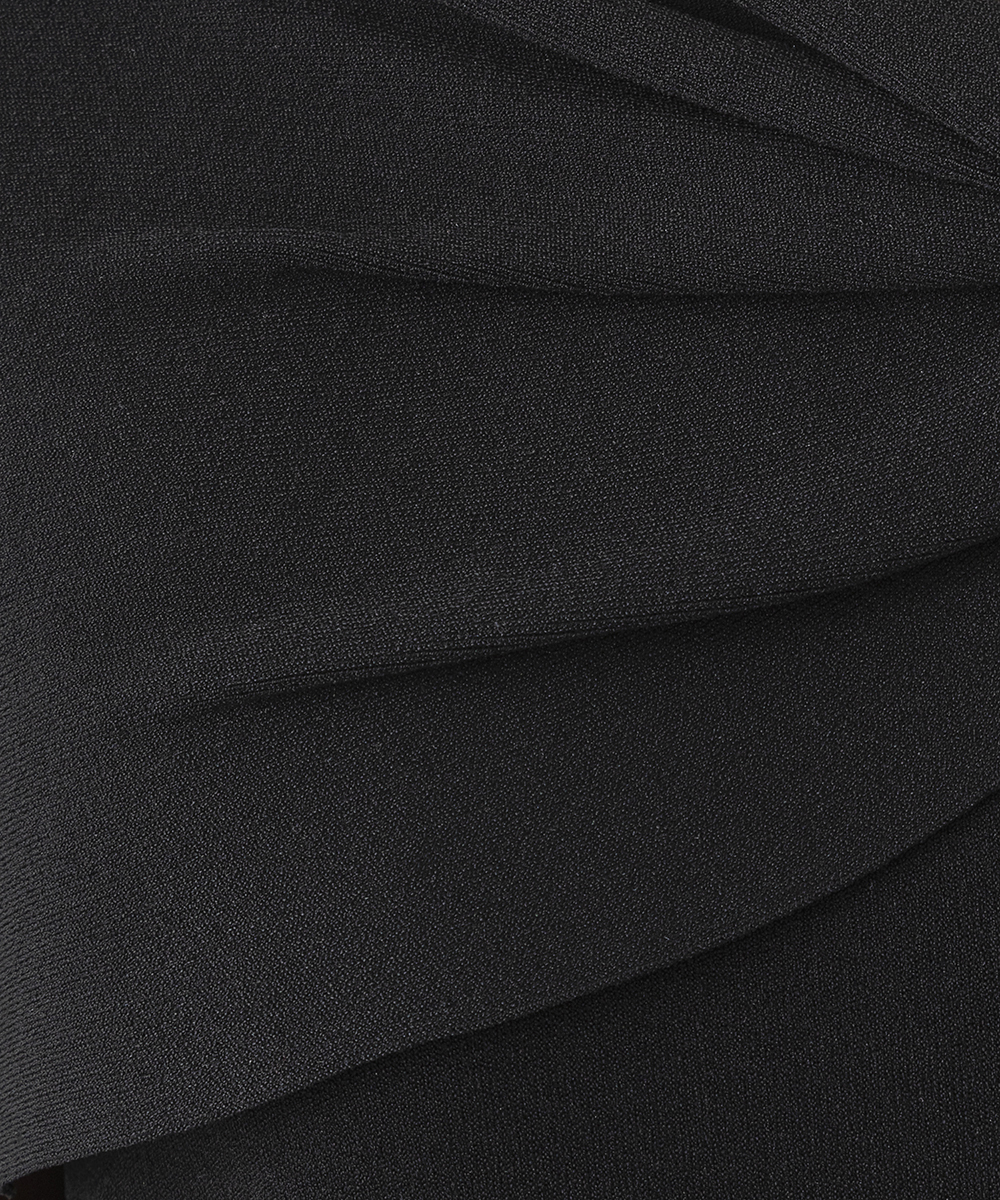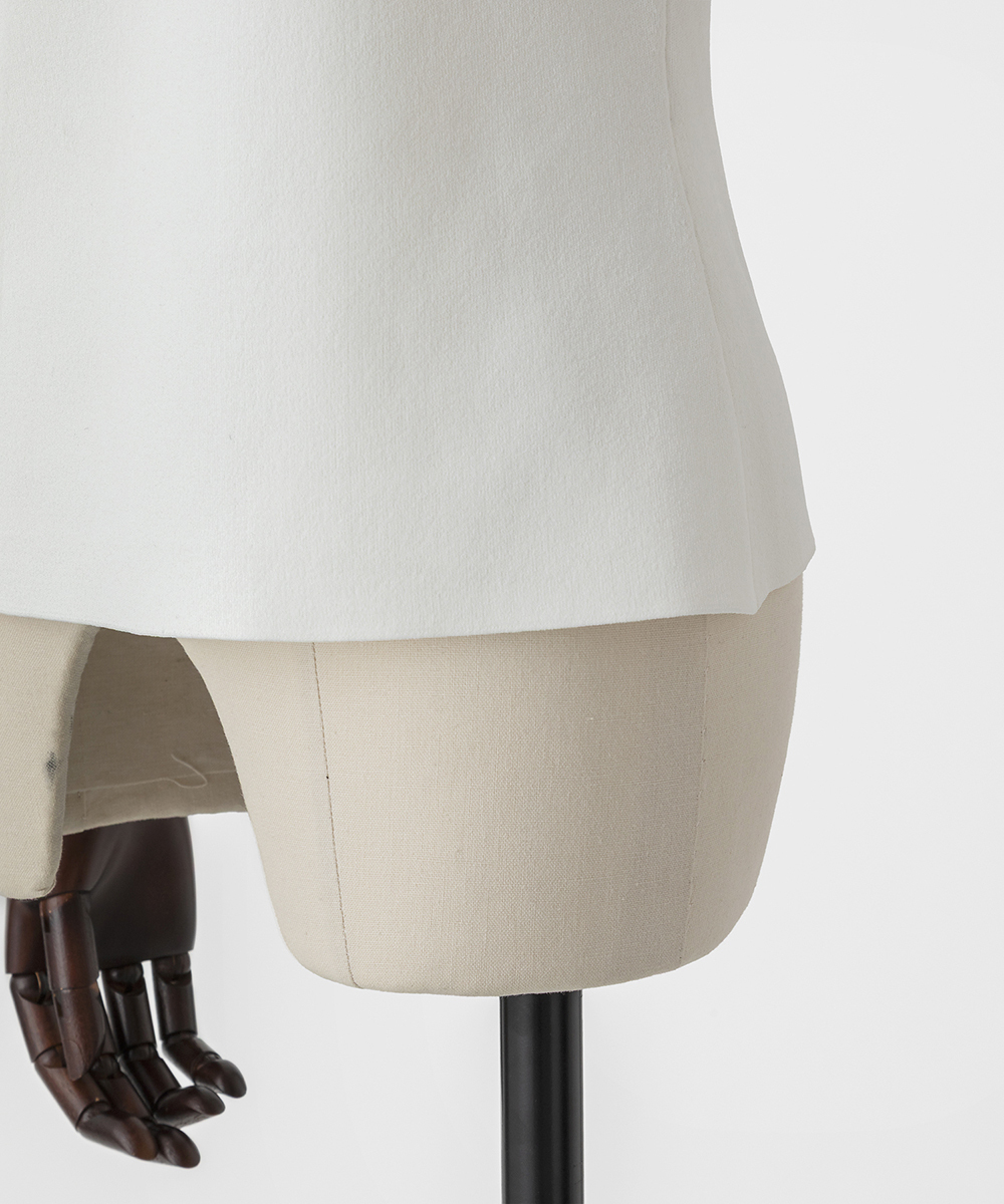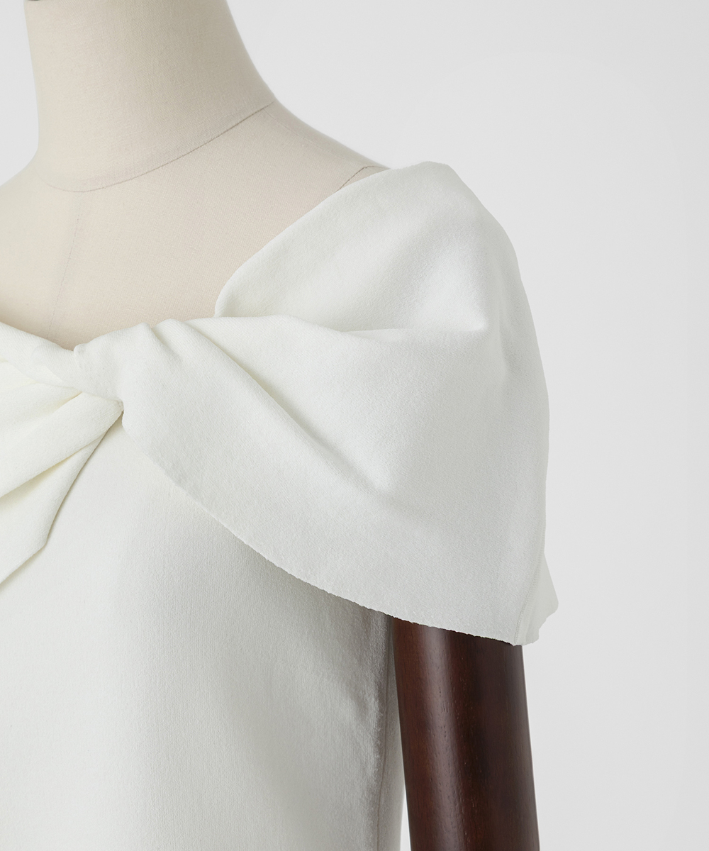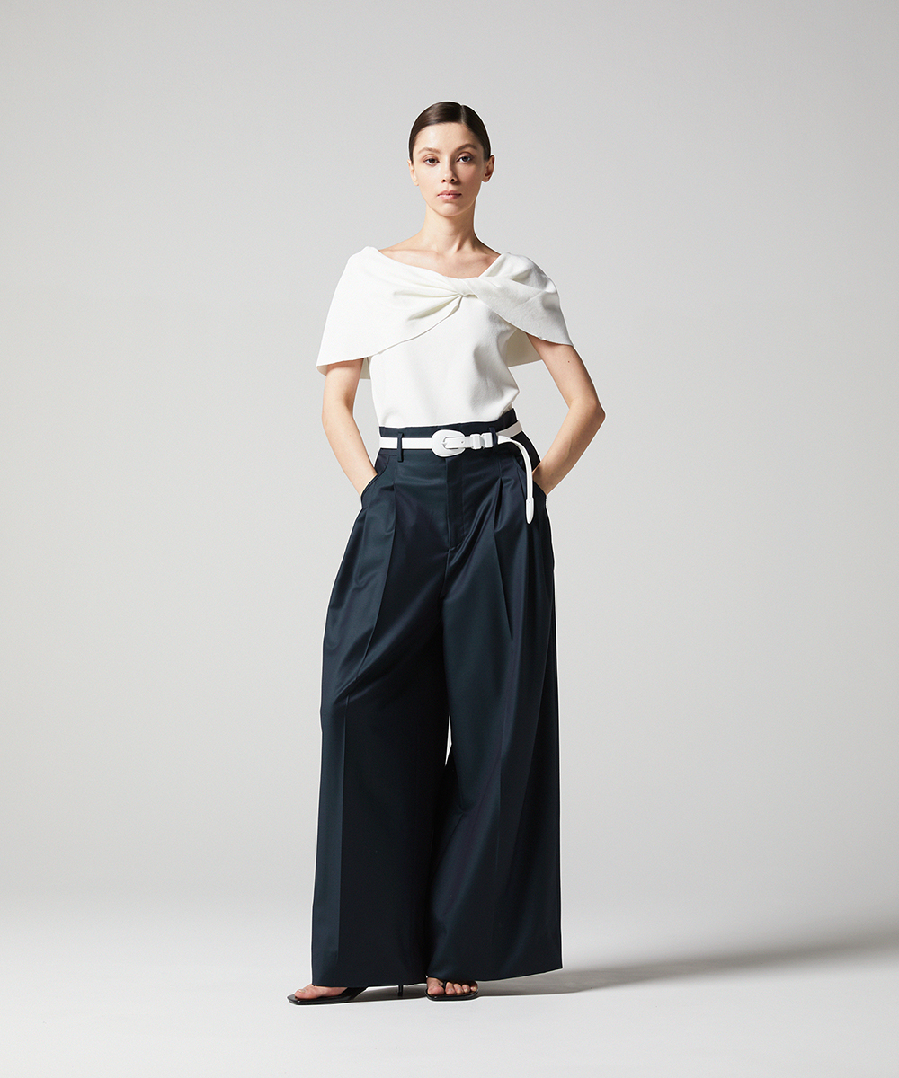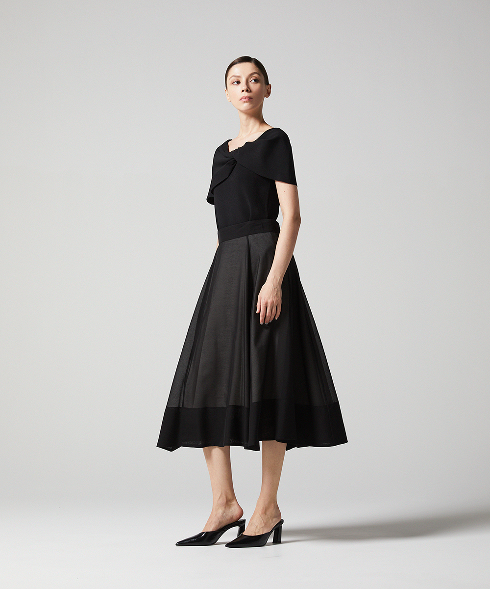 滑らかにハリのある18Gスムース編みで肩や二の腕を包み込むケープのデザインです。昨年好評だったケーププルオーバーから衿元にツイストディテールを加え新たなケープデザインにバーションアップしました。レーヨン糸とストレッチナイロンをミックスした国内紡績糸を使用。コンパクトでドライな質感が特徴で、綺麗なシルエットを保つキックバックの優れた素材です。