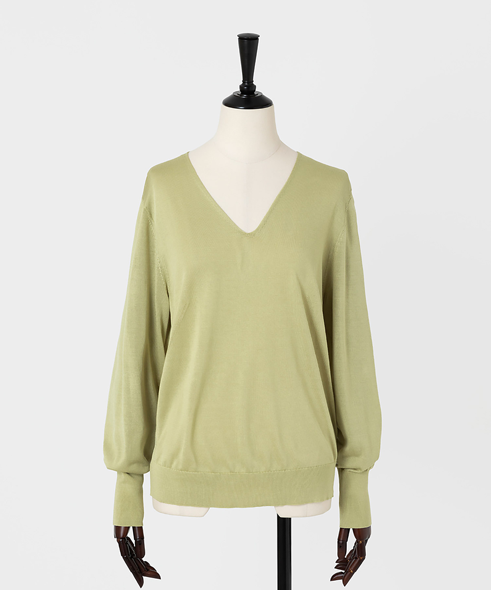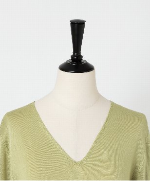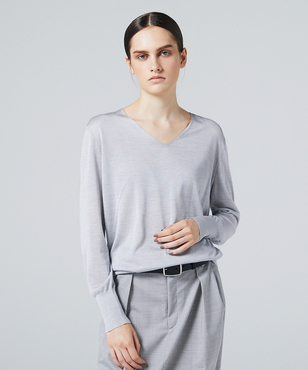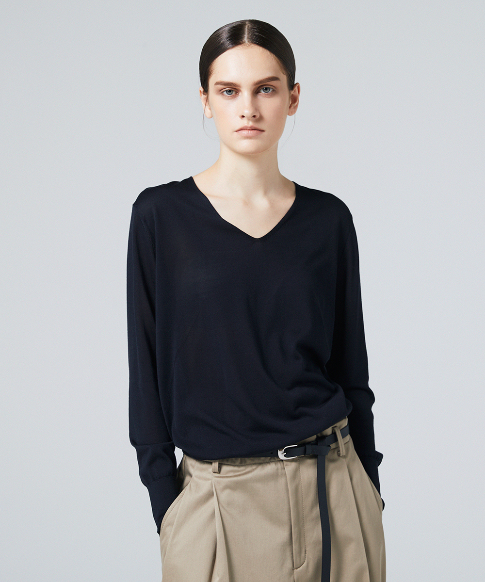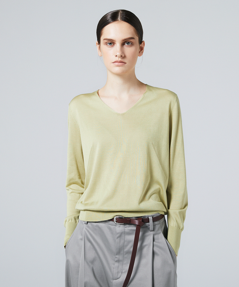 首元を美しく魅せるすっきりとしたVネックのニットプルオーバー。ハイゲージで立体的に成形する事で着心地よく美しいシルエットに仕立てています。汎用性のあるミニマルなデザインで、1枚着としてもインナーとしても活用できる、活用時期の長いアイテムです。ヨーロッパハイブランドのシルク糸を作るイタリアの工場で紡績した糸を使用しています。繭玉からとれる1本の連続した繊維(フィラメントシルク)が原料なので安価なスパンシルク(フィラメントを取った後の残りを粉砕して作る)よりも艶・しなやかさが特徴の上質なシルクです。