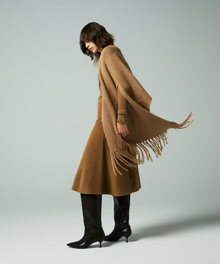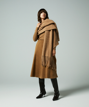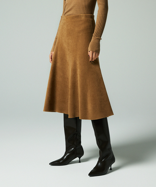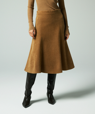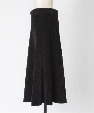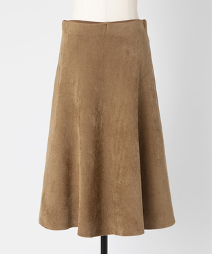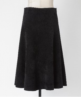 すっきりとした腰回りで裾がフレアに広がるデザイン。裾の動きを美しく引き立てるミディ丈のスカート。スウェードのような見た目に反して、ストレッチ性が良く着心地の良いアイテムです。特別に紡績されたイタリア糸を使用し、編み目を極力詰め、緻密に編み立てることでスウェードの様なマットな起毛感のある素材に編み上げました。しっかりとしたハリ感とストレッチ感を持つ滑らかな素材です。