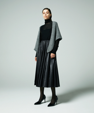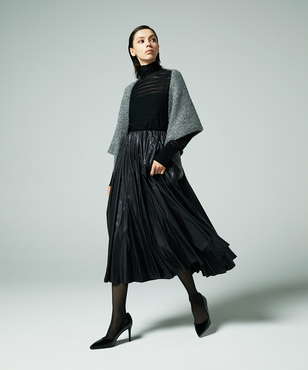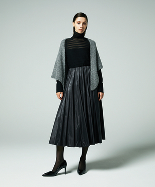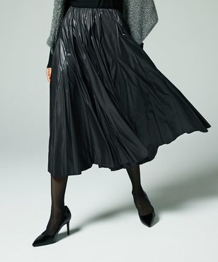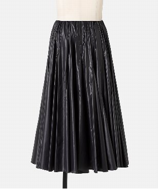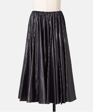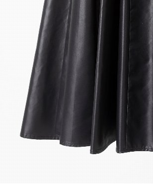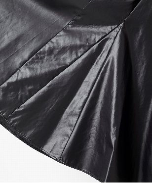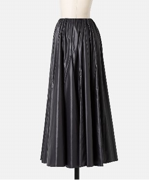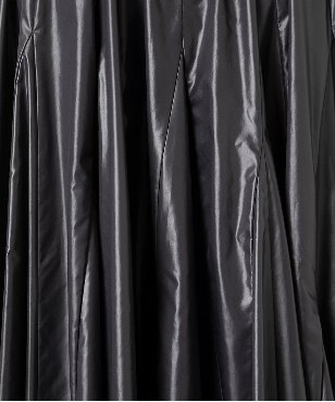 たっぷりとした分量感のあるギャザーフレアスカートです。裾に向かってハギやマチを贅沢にとり、波打つようなヘムラインが生まれるようデザインしています。たて糸・よこ糸共にポリエステルのハイカウント糸を使用した、軽さとソフトさが特徴のタフタ生地。さらに後加工でカレンダーとタンブラー加工を施し、レザーのような光沢感を加えています。日本製生地。