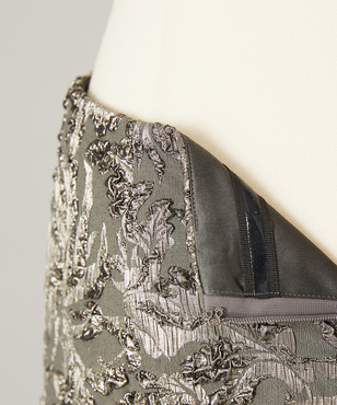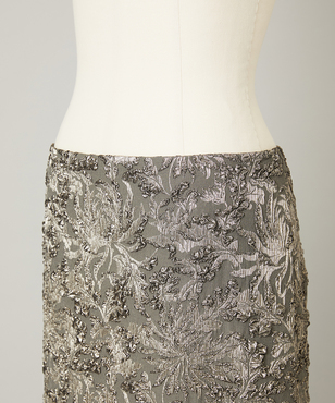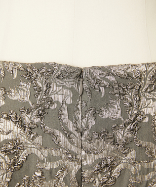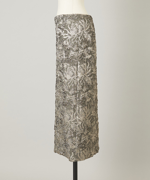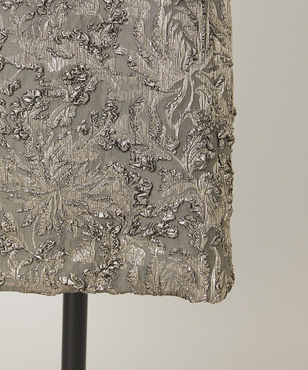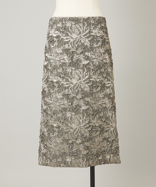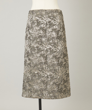 シャープなトラペーズラインのミドル丈スカート。ボリュームのあるトップスとの合わせもしやすいすっきりとしたシルエットです。ウエスト内側は滑り止め仕様。1924年フランスにて創業、世界屈指のテキスタイルメーカーの素材。裏面に強撚ポリエステル糸とポリウレタン糸を使う事で強い凹凸感を出し、表のラメ糸を立体的に浮き上がらせることで際立った素材感を生んだジャカード生地は、軽くストレッチ感もありリラックスした着心地も特徴の一つです。ディレクターが16年前に作り、メーカーに保存されていたアーカイブを今シーズンのカラーで復刻させた素材となっています。同素材マキシドレス〔FGEVD04140〕もご用意いたしております。