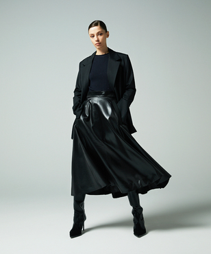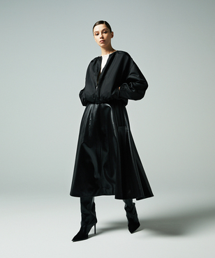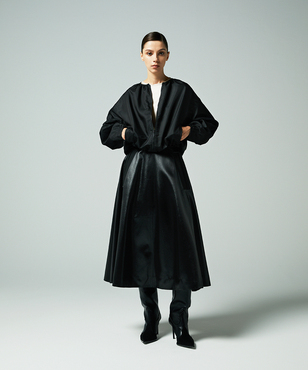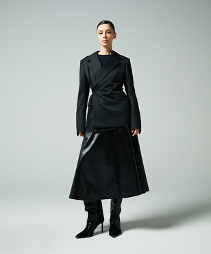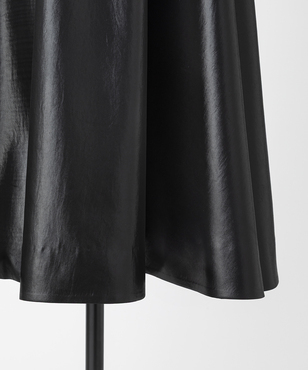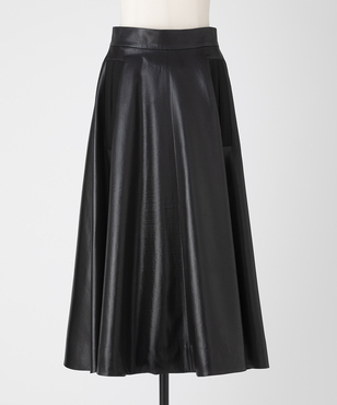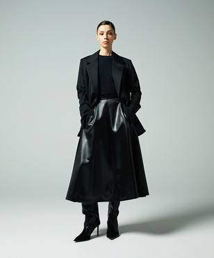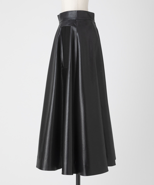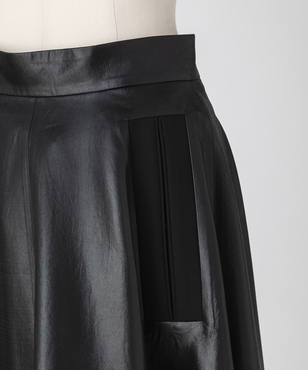デザインされた箱ポケットがポイントのフレアスカート。艶のある素材感をいかした美しいフレアシルエットがスタイリングにインパクトをもたらします。アセテートの二重織素材にチンツ加工を施し、独特の光沢感を持たせたヘビーサテン。タテヨコともにポリエステルの糸を高密度に打ち込み、表面をチンツ加工、さらにエアータンブラー加工をすることにより、光沢感とともに柔らかさがうまれ、レザーのような張り感や肉感をもつ素材となっています。日本製生地。