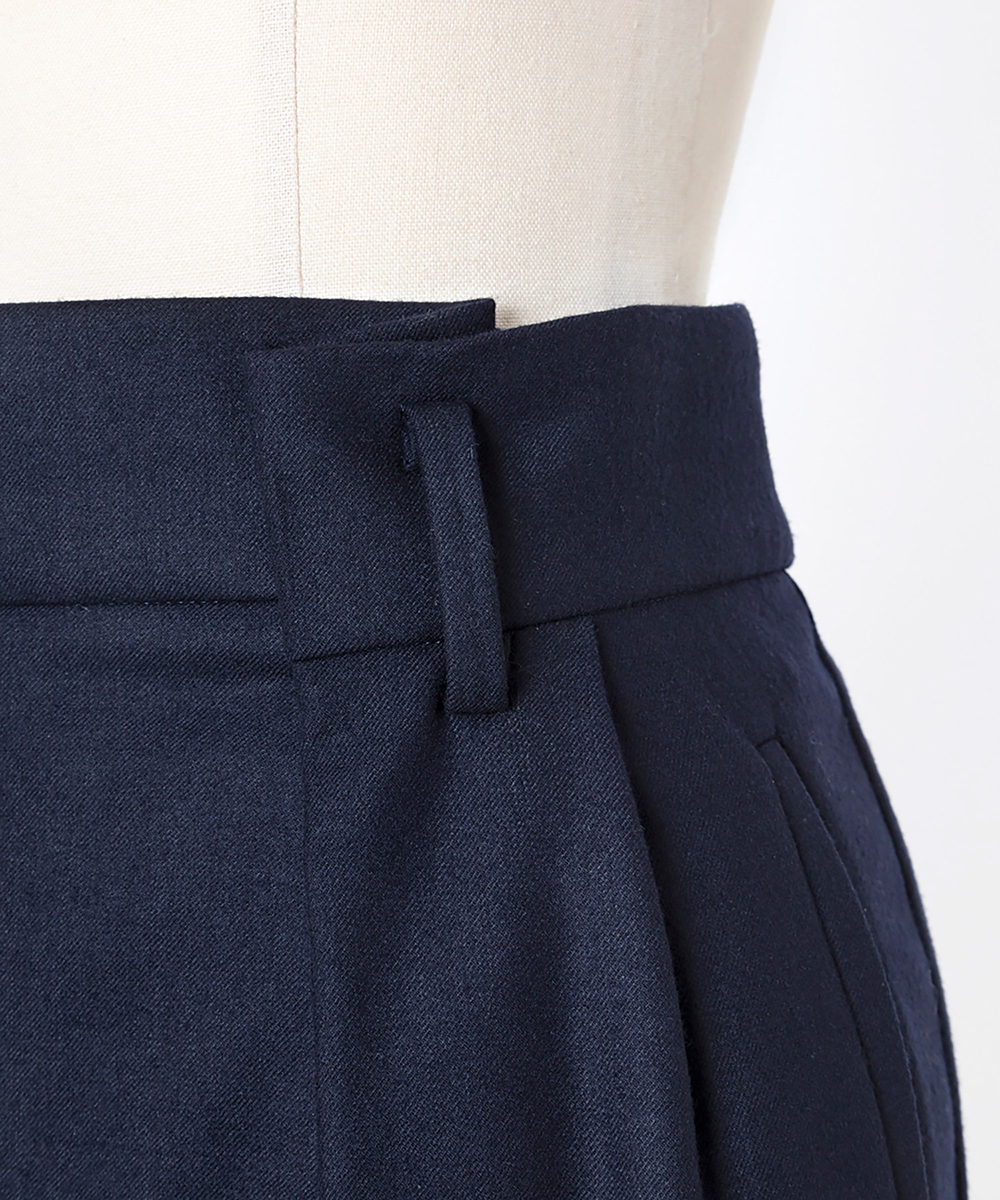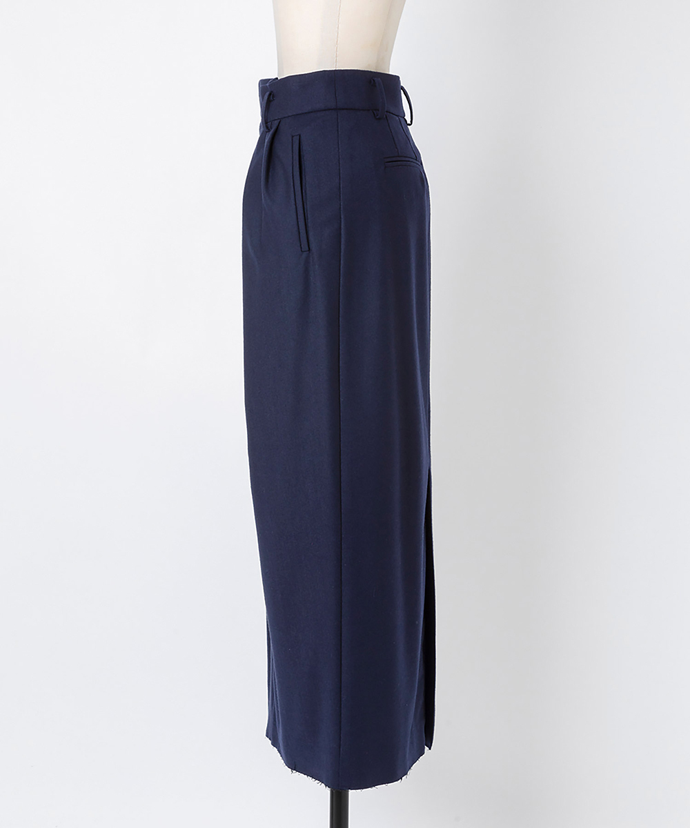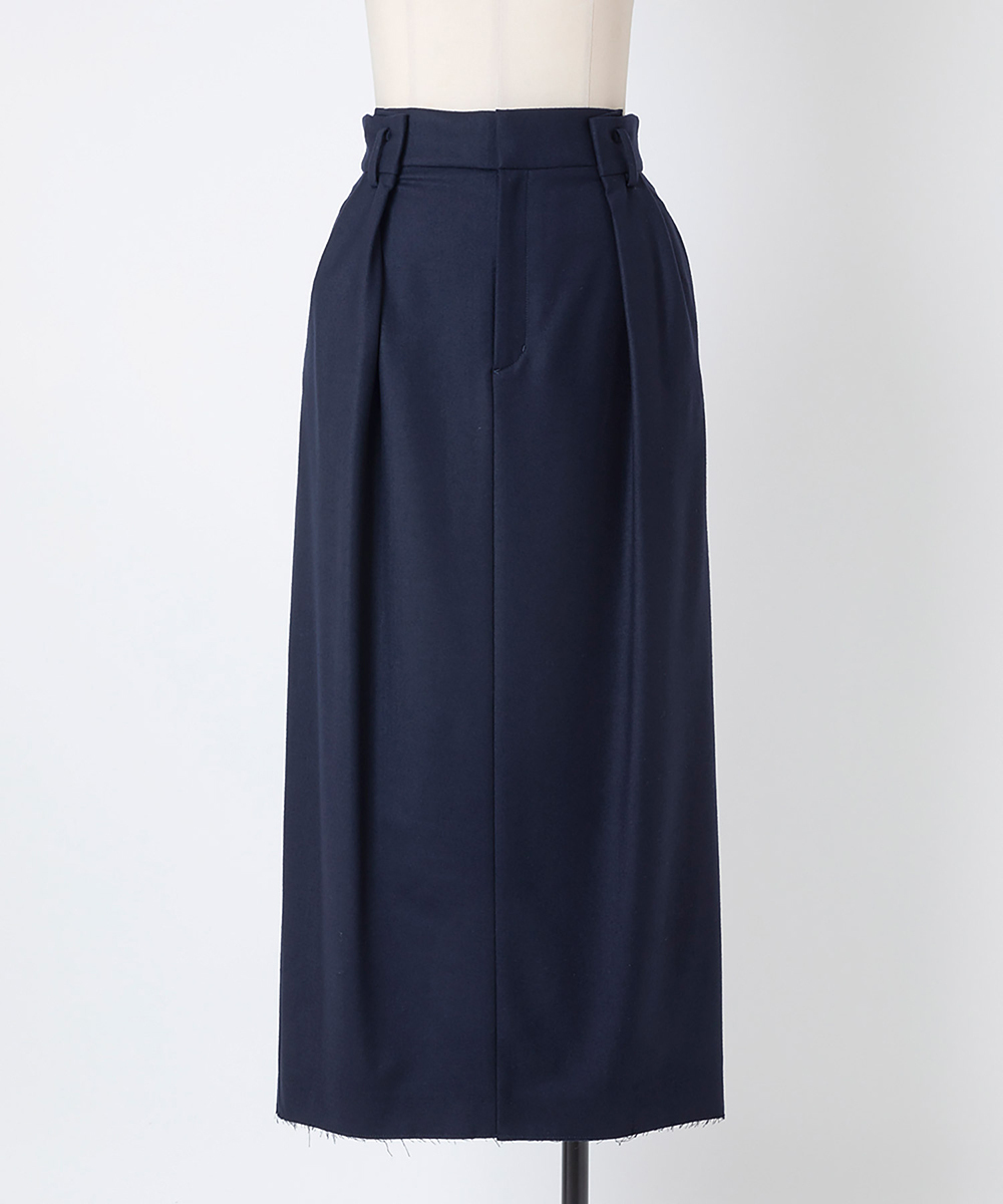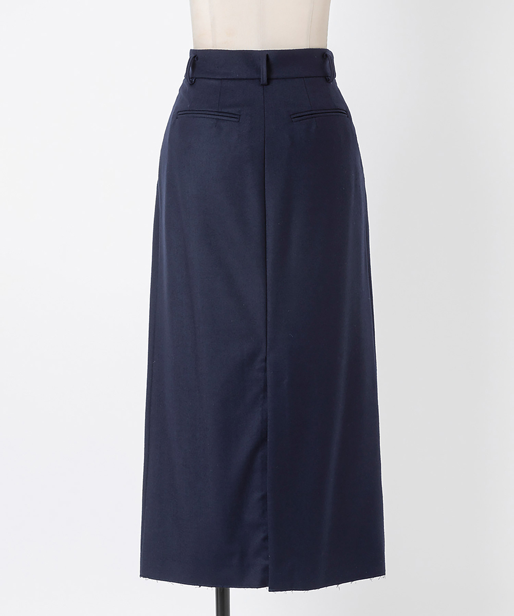 トラウザーイメージのストレートスカート。タックパンツのようなディテールや裾の断ち切り仕様など、ラフでマニッシュな印象を感じさせるアイテム。上質な細番手の糸で織り上げた薄手のウールは、しわになりにくく軽い着心地。国内の天然の地下水(軟水)で染色後の生地を洗うことで、柔らかな風合いが生まれています。日本製生地。 同型別素材FGHDW07540・同素材ソフトプリーツロングスカートFGHDW09680・ワイドテーパードパンツFGLDV07560もご用意いたしております。