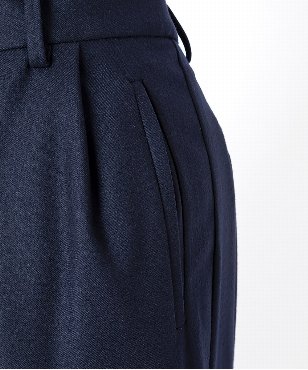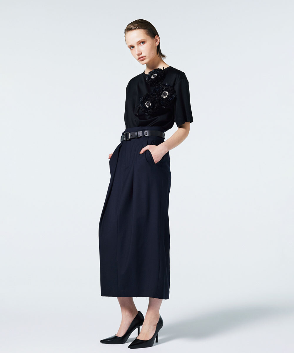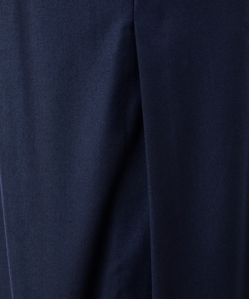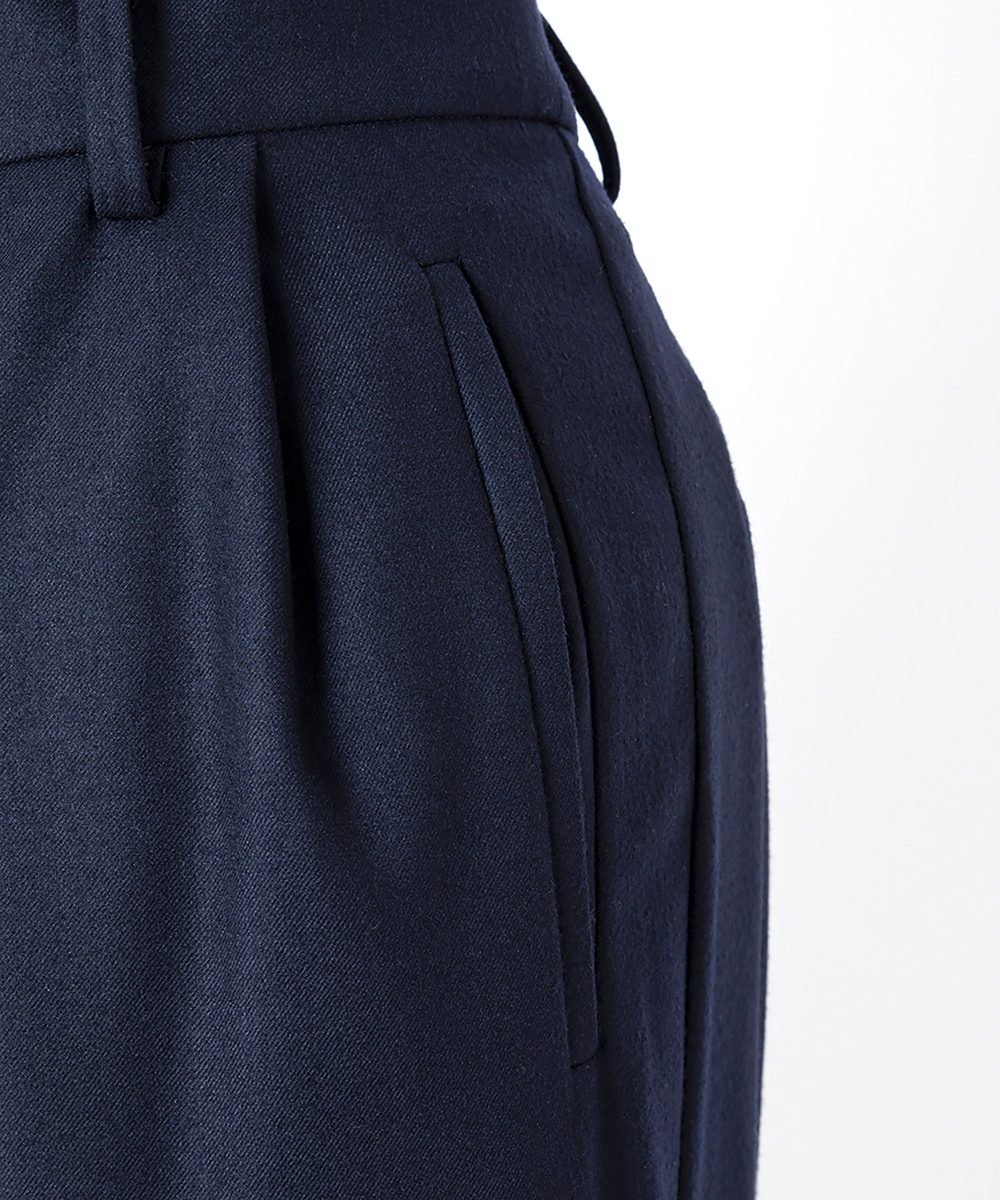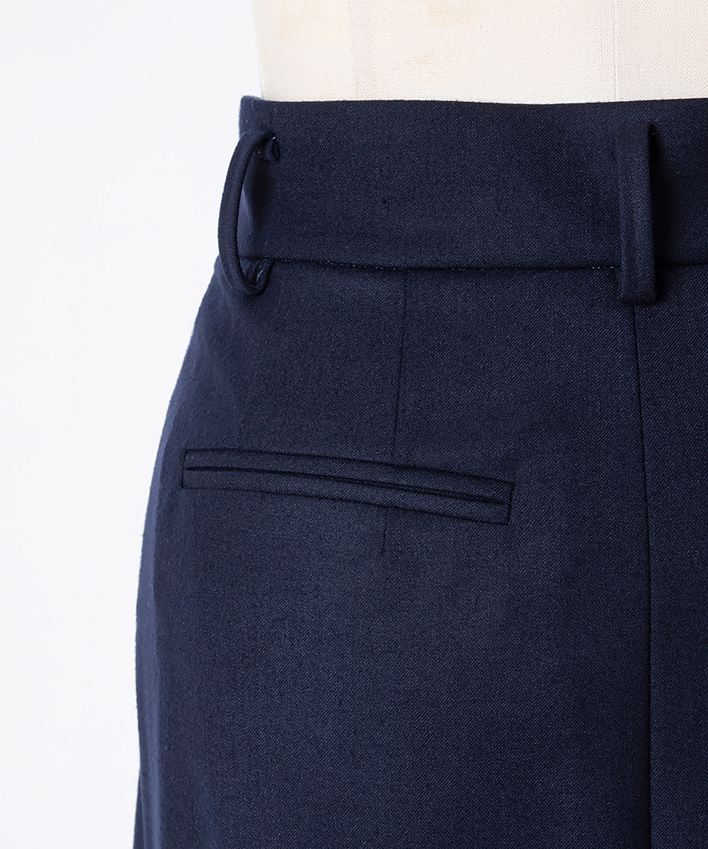 トラウザーイメージのストレートスカート。タックパンツのようなディテールや裾の断ち切り仕様など、ラフでマニッシュな印象を感じさせるアイテム。上質な細番手の糸で織り上げた薄手のウールは、しわになりにくく軽い着心地。国内の天然の地下水(軟水)で染色後の生地を洗うことで、柔らかな風合いが生まれています。日本製生地。 同型別素材FGHDW07540・同素材ソフトプリーツロングスカートFGHDW09680・ワイドテーパードパンツFGLDV07560もご用意いたしております。