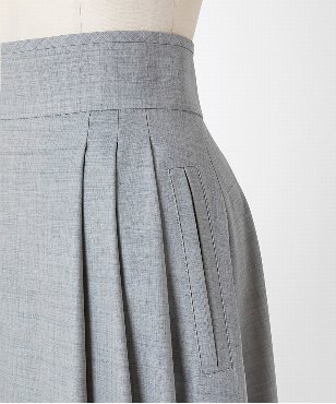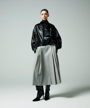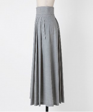 アシンメトリーな部分ソフトプリーツを左右に配したロングフレアスカート。様々なトップスとスタイリングしやすいバランスに仕上げています。細番手のウールポリストレッチ。薄手で軽量、シワになりにくい素材をTOPカラーで展開。日本製生地。同型別素材FGHDW09680・同素材トラウザー風ストレートスカートFGHDW07540・ワイドテーパードパンツFGLDW07560もご用意いたしております。