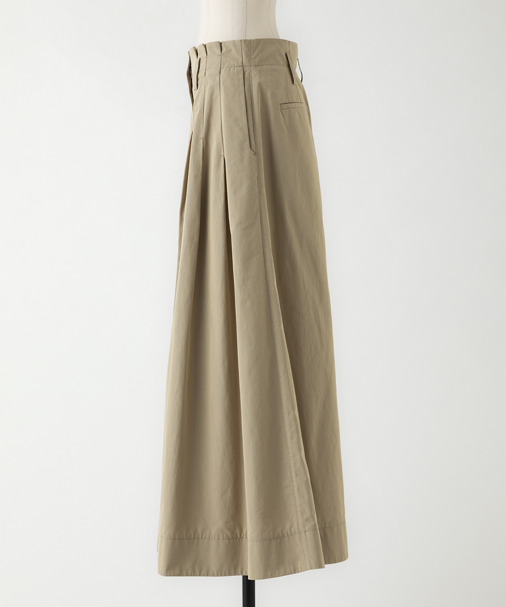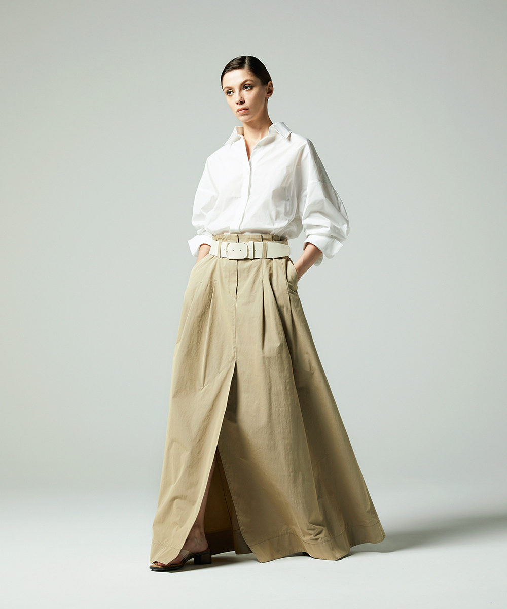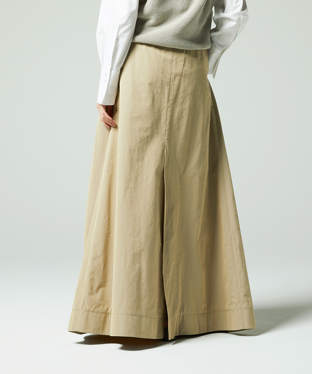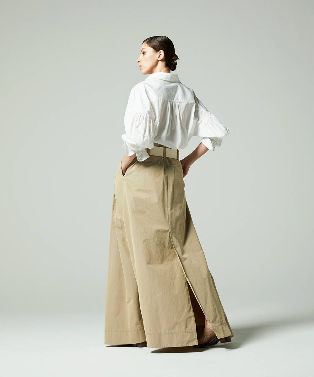 ウエストのタックで程よいフレア感を出したトラウザーデザインのAラインロングスカート。前後に深く入れたベンツで抜け感を演出しながらも、ステッチを斜めに入れることで足元が出にくくなるように配慮しました。ウエストにはベルトを合わせれば、腰を落として着用するとよりスタイリッシュな印象に。イタリア製生地イタリア・プラトーのテキスタイルメーカーの素材。コットンとナイロンを高密度に打ち込んだ先染めシャンブレー素材は、軽量で適度な表情感、ハリ感が魅力。製品ワンウォッシュ加工。