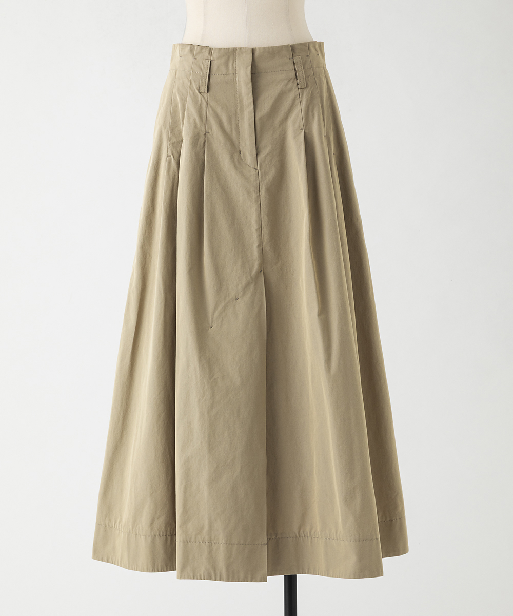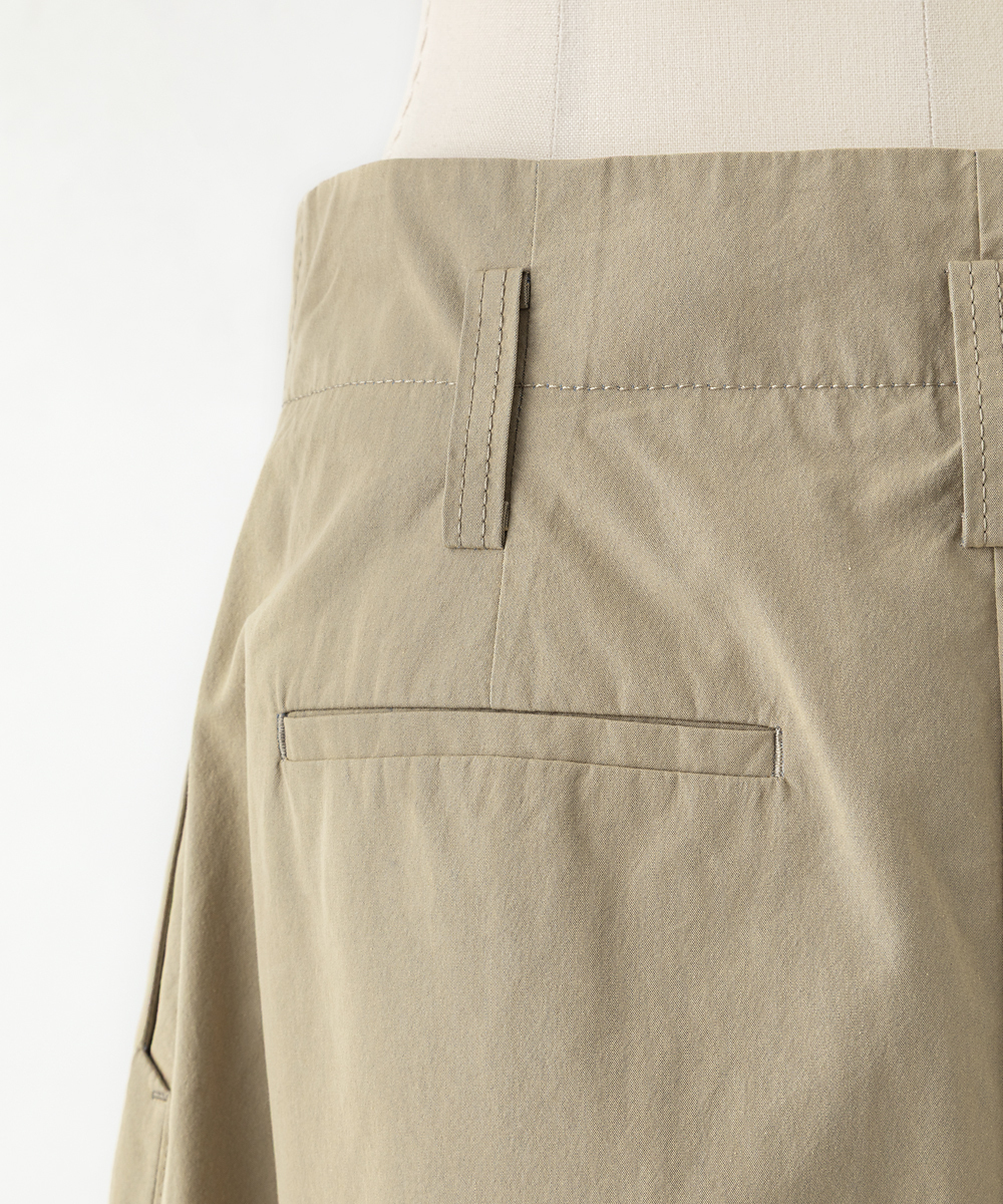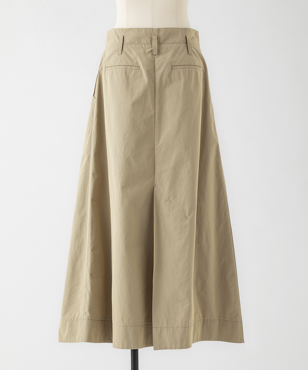 ウエストのタックで程よいフレア感を出したトラウザーデザインのAラインロングスカート。前後に深く入れたベンツで抜け感を演出しながらも、ステッチを斜めに入れることで足元が出にくくなるように配慮しました。ウエストにはベルトを合わせれば、腰を落として着用するとよりスタイリッシュな印象に。イタリア製生地イタリア・プラトーのテキスタイルメーカーの素材。コットンとナイロンを高密度に打ち込んだ先染めシャンブレー素材は、軽量で適度な表情感、ハリ感が魅力。製品ワンウォッシュ加工。