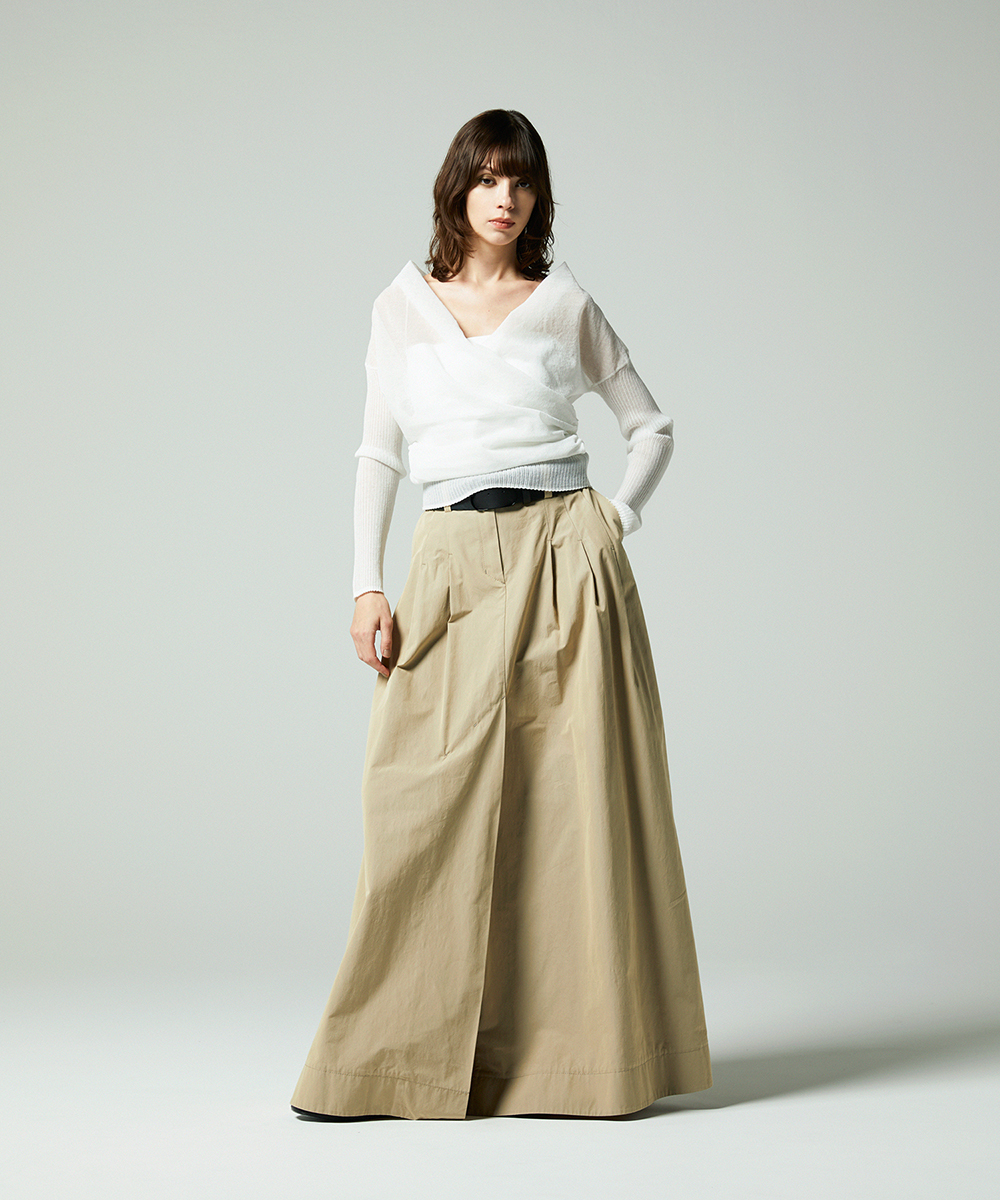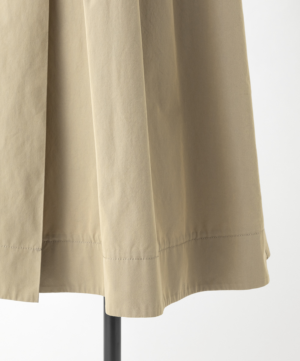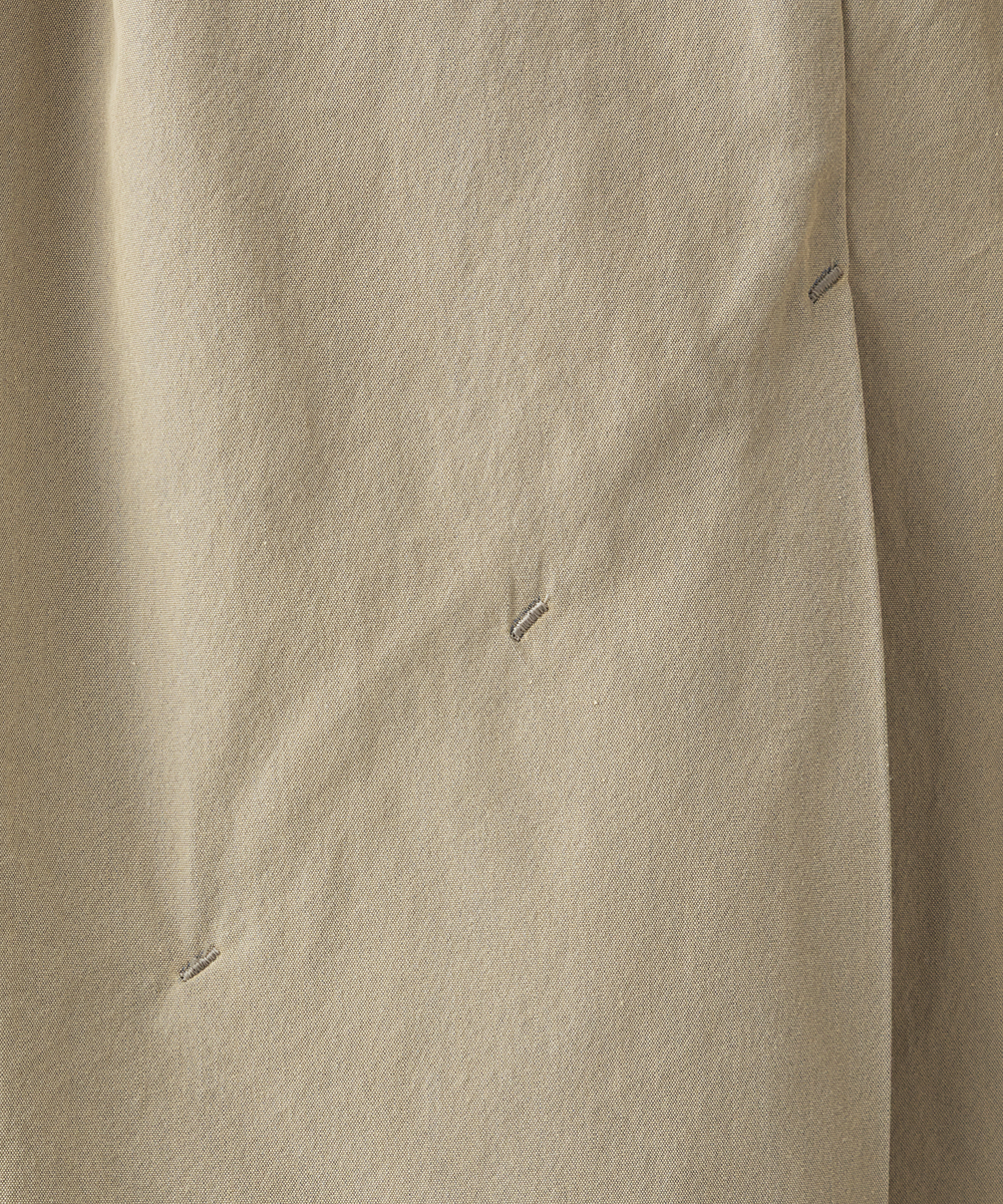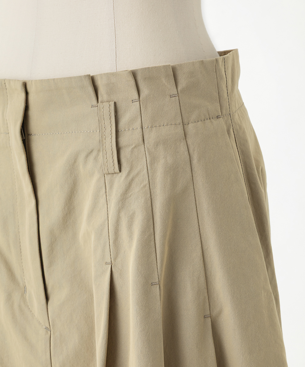 ウエストのタックで程よいフレア感を出したトラウザーデザインのAラインロングスカート。前後に深く入れたベンツで抜け感を演出しながらも、ステッチを斜めに入れることで足元が出にくくなるように配慮しました。ウエストにはベルトを合わせれば、腰を落として着用するとよりスタイリッシュな印象に。イタリア製生地イタリア・プラトーのテキスタイルメーカーの素材。コットンとナイロンを高密度に打ち込んだ先染めシャンブレー素材は、軽量で適度な表情感、ハリ感が魅力。製品ワンウォッシュ加工。