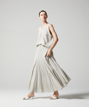 軽い素材感を生かして贅沢に生地を使用し、裾に向かって美しいフレアを生み出したロングスカート。ウエストベルトはゴムギャザー(内側にドローストリング)仕様でリラックス感のある履き心地。シルク・ナイロン糸を使用したワッシャー感が特徴の素材を使用。シルクスパン糸を使用したマット感のある生地を手仕事によりサンドウォッシュ、その後高温で洗うという手の込んだ仕上げにより特殊なワッシャー感を生み出しています。シルクナイロンワッシャーのシリーズとして、シルクナイロンシャツ[FGBGD13490]・シルクナイロンタンクトップ[FGBGD14330]・シルクナイロンロングスカート[FGHGD14900]をご用意いたしております。
