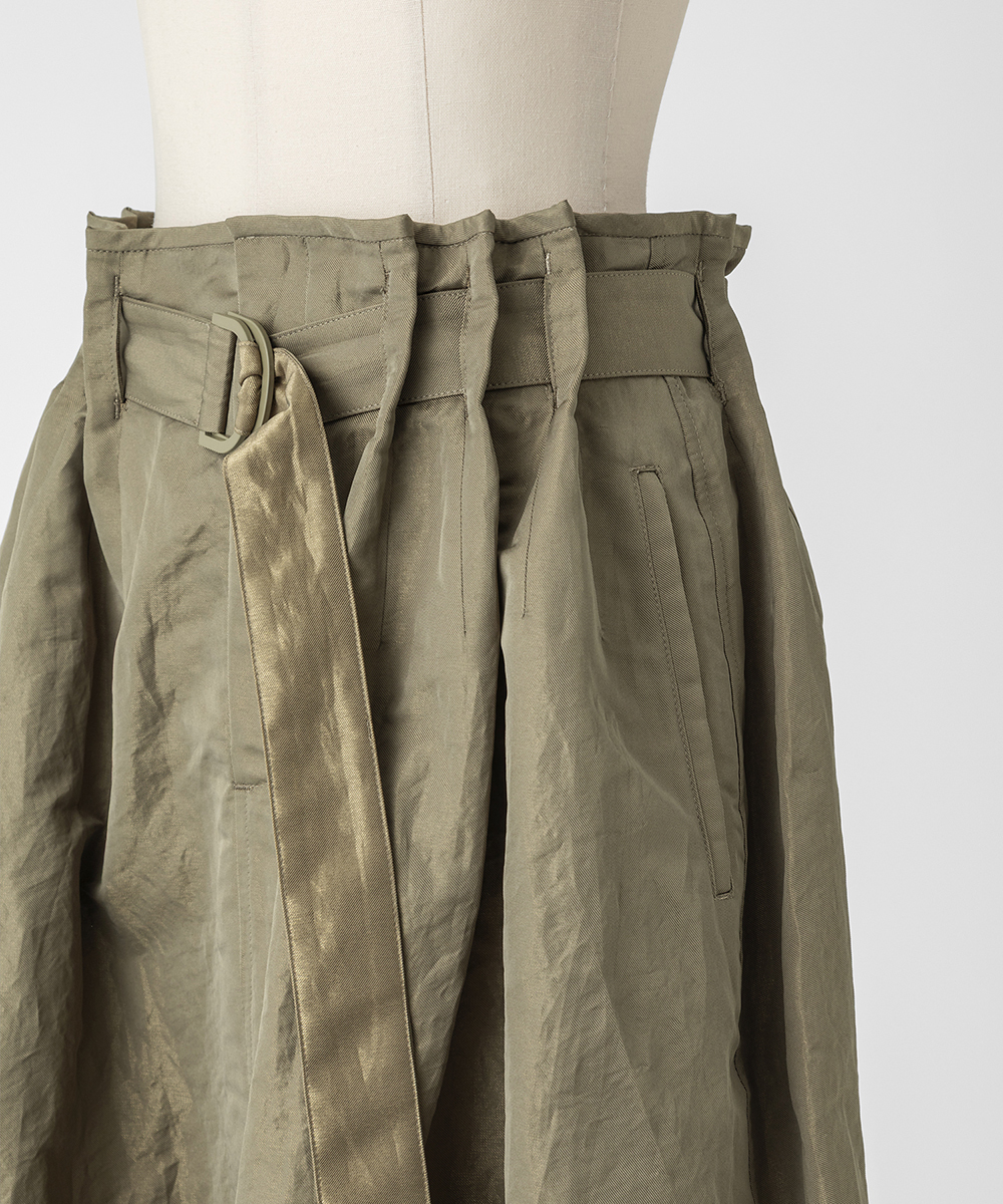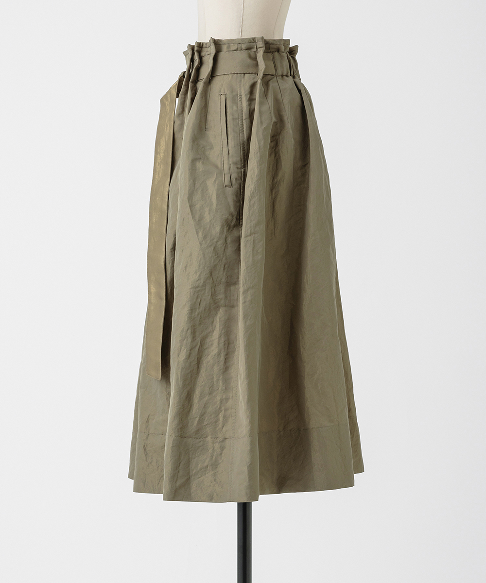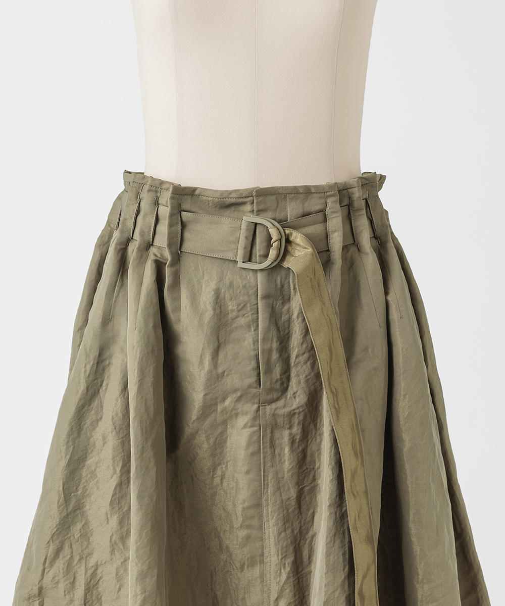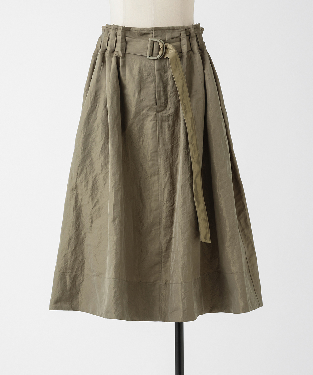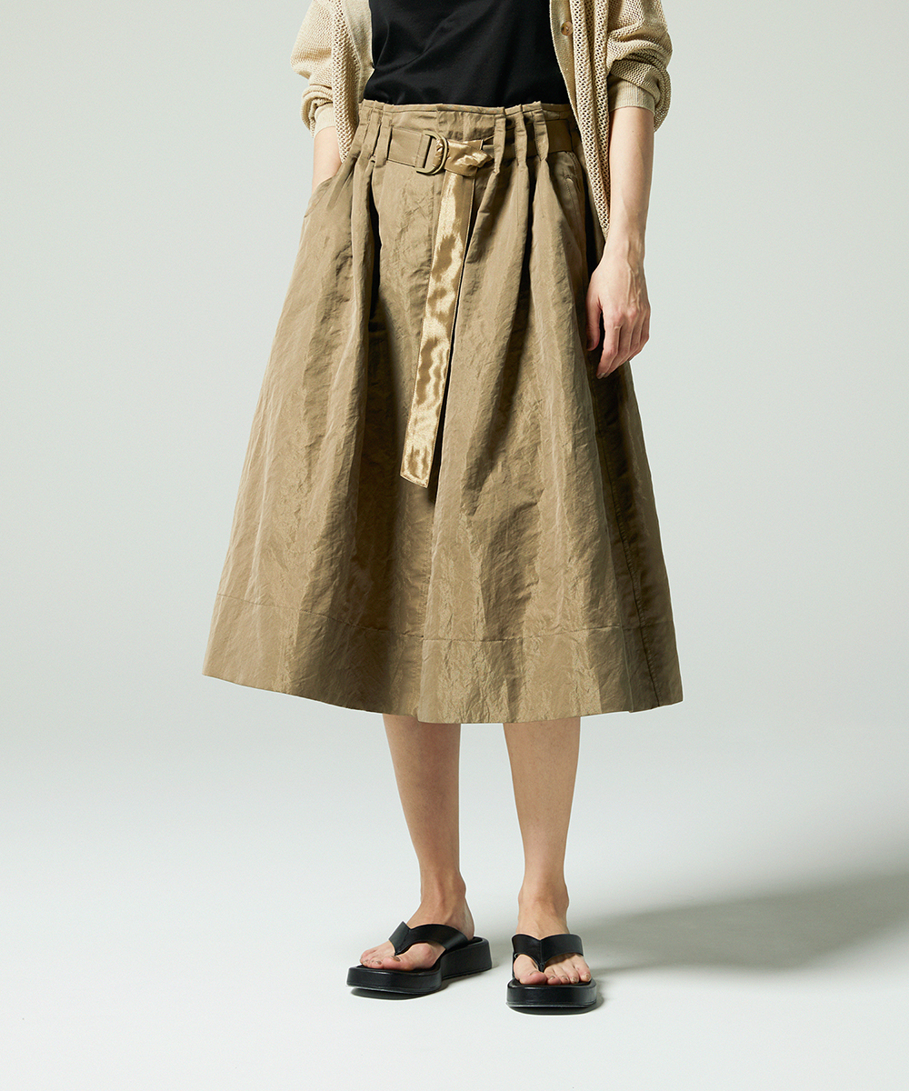 共地ベルトをタックに通したデザインが特徴のミドル丈フレアスカート。後ろウエストはゴムギャザーで履き心地よく仕上げています。イタリア製生地。高級シルク・ジャガードの産地であるコモの老舗テキスタイルメーカーの生地を使用。ヨコ糸に光沢のある繊細なポリエステル糸を織り込むことで上品なメタリック感を生み出したライトウエイト素材。さらに仕上げにタンブラー加工をすることで贅沢なカジュアル感をプラスしています。