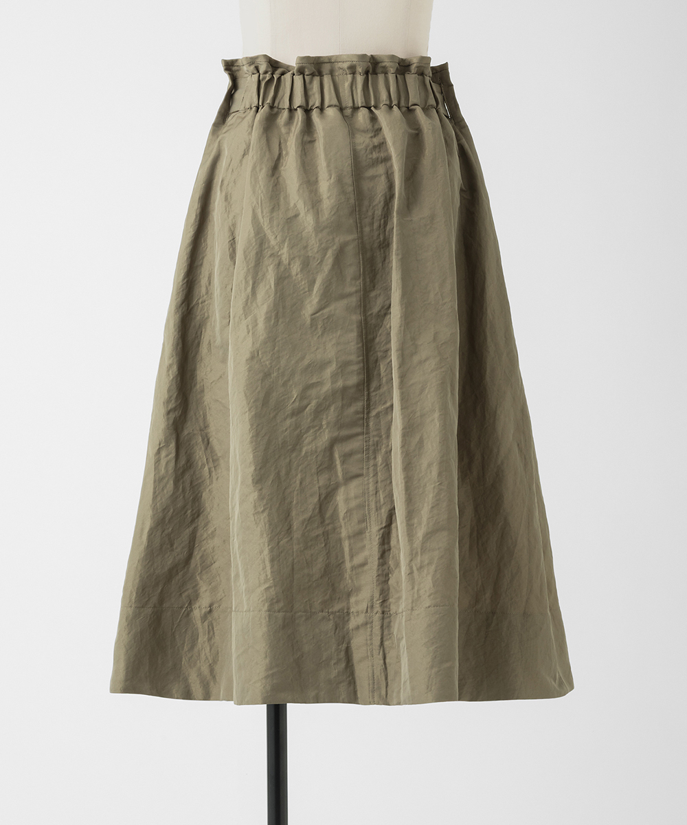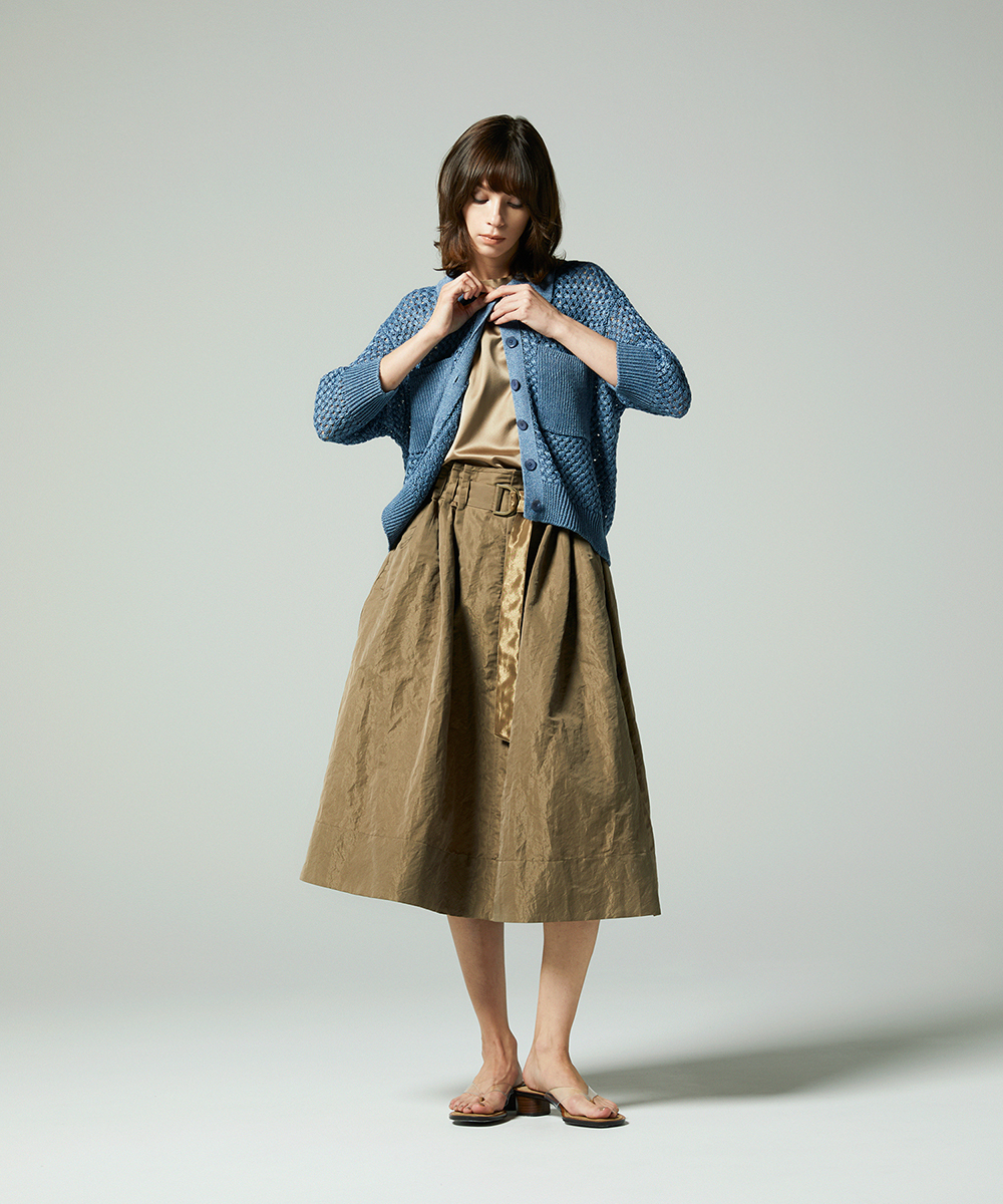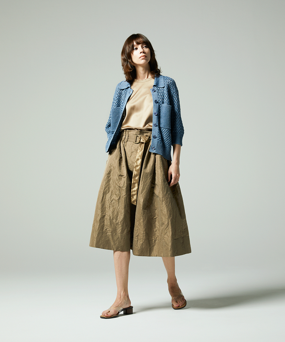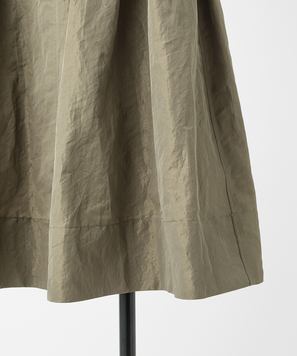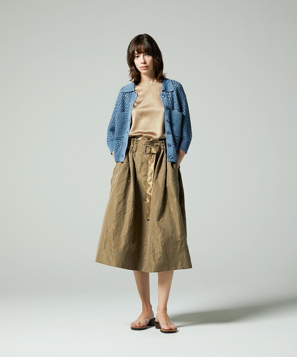 共地ベルトをタックに通したデザインが特徴のミドル丈フレアスカート。後ろウエストはゴムギャザーで履き心地よく仕上げています。イタリア製生地。高級シルク・ジャガードの産地であるコモの老舗テキスタイルメーカーの生地を使用。ヨコ糸に光沢のある繊細なポリエステル糸を織り込むことで上品なメタリック感を生み出したライトウエイト素材。さらに仕上げにタンブラー加工をすることで贅沢なカジュアル感をプラスしています。