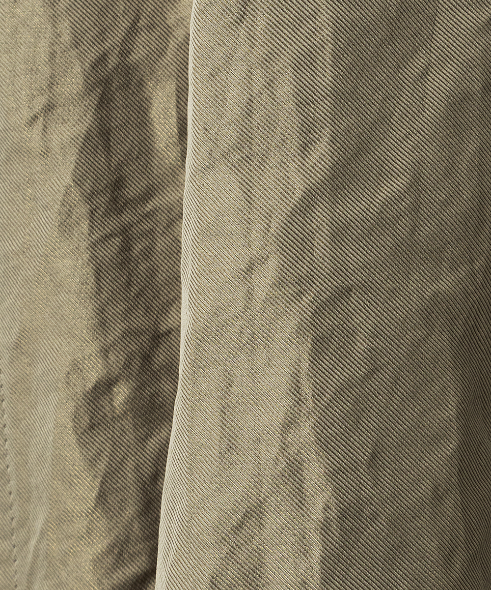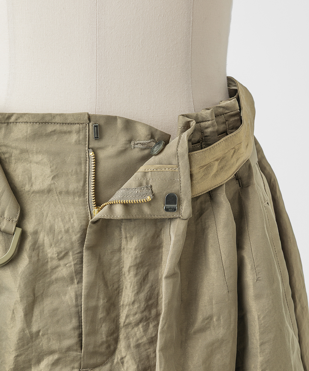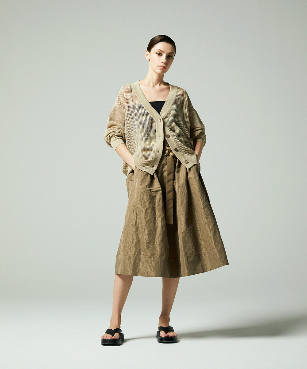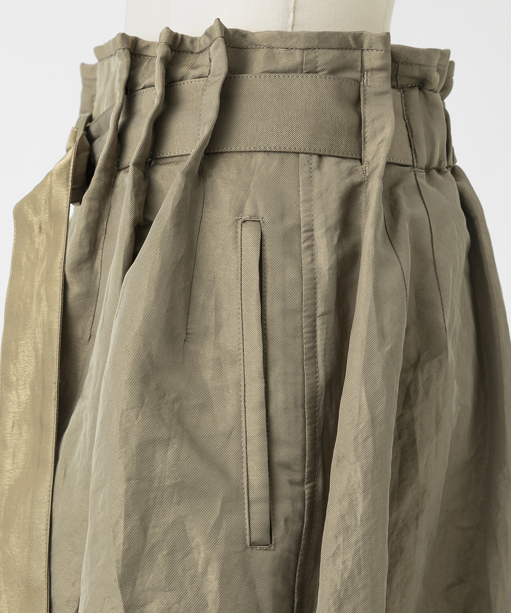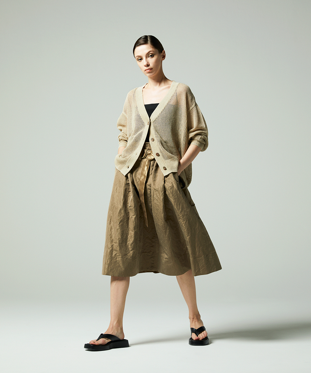 共地ベルトをタックに通したデザインが特徴のミドル丈フレアスカート。後ろウエストはゴムギャザーで履き心地よく仕上げています。イタリア製生地。高級シルク・ジャガードの産地であるコモの老舗テキスタイルメーカーの生地を使用。ヨコ糸に光沢のある繊細なポリエステル糸を織り込むことで上品なメタリック感を生み出したライトウエイト素材。さらに仕上げにタンブラー加工をすることで贅沢なカジュアル感をプラスしています。