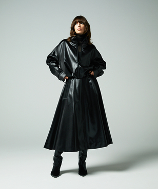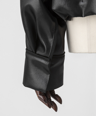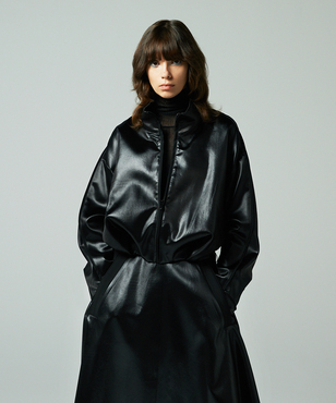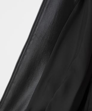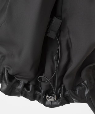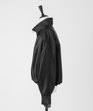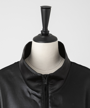 マットなパイピングがアクセントになったハイネックのジップアップブルゾン。肘や背中に立体感が生まれるよう計算されたシルエットです。裾のストレッチコードの引き具合でとボトムとのバランスを調整できます。アセテートの二重織素材にチンツ加工を施し、独特の光沢感を持たせたヘビーサテン。たて糸・緯糸ともにポリエステルの糸を高密度に打ち込み、表面をチンツ加工、さらにエアータンブラー加工をすることにより、光沢感とともに柔らかさがうまれ、レザーのような張り感や肉感をもつ素材となっています。日本製生地。