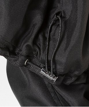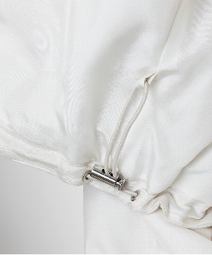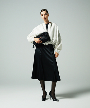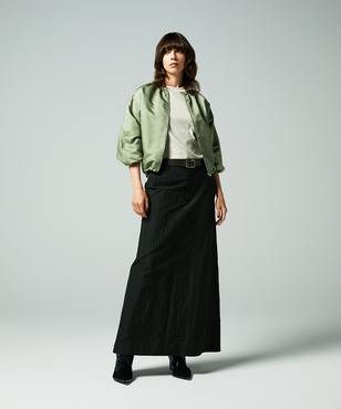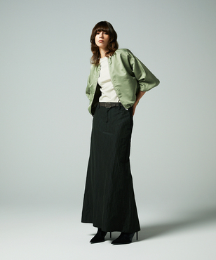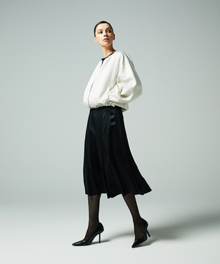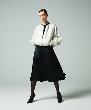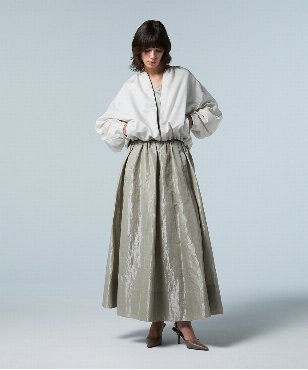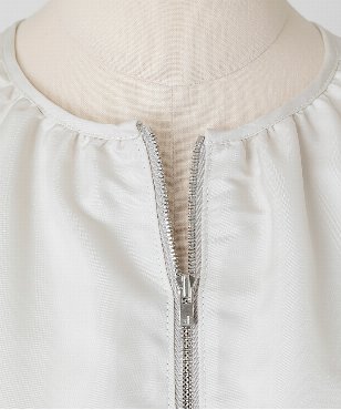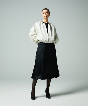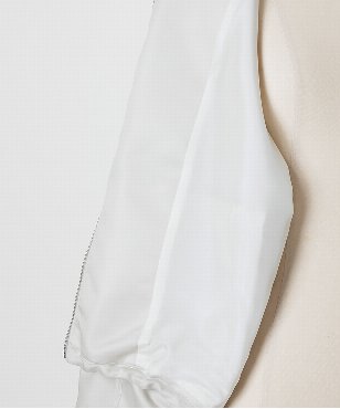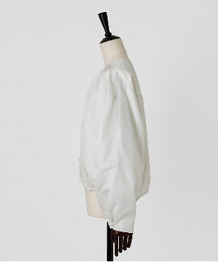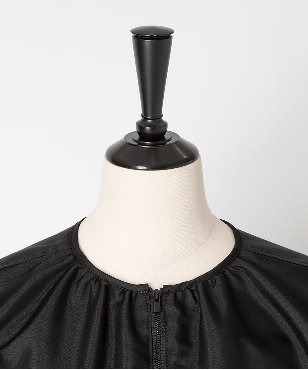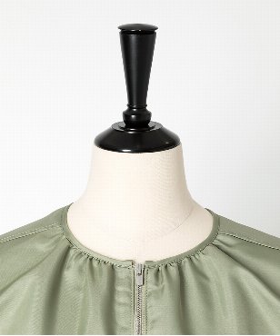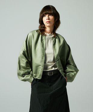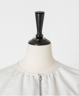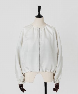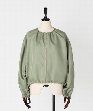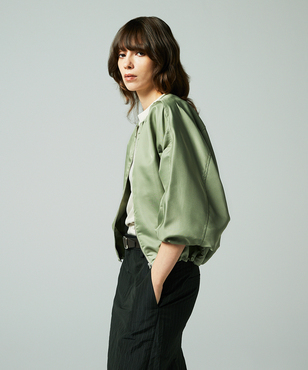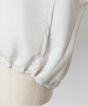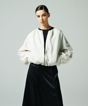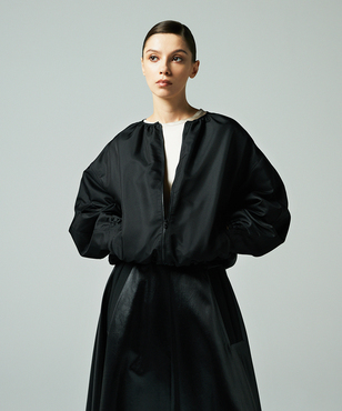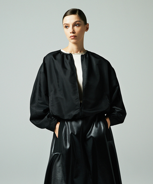 ノーカラー、ショートレングスのジップアップブルゾンはスカートにもパンツにも合わせやすいシルエット。裾のコードを絞ると後ろに丸みを帯びた立体的なシルエットが生まれます。袖口もゴム仕様で袖をたくし上げても決まるデザインです。シルク/ポリエステルを使用した高密度サテン生地は、シルクならではの上品な光沢としわになりにくい機能性を両立させた素材です。さらに撥水加工を施し、軽い雨なら防げる機能も持っています。同素材2WAYミドル丈ブルゾンFGJYV18120もご用意いたしております。